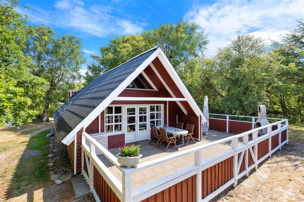 This cosy holiday home in Lodbjerg Hede is nestled among beautiful pine trees in a peaceful location. Here you can enjoy a wonderful holiday near the rolling North Sea. The holiday home at Rævekrogen 8 accommodates 4 people and 2 dogs, situated on a beautiful natural plot of 2,050 square metres with a sheltered terrace. Both your dogs and children can spend hours enjoying the lawn, while adults prepare a lovely barbecue dinner on the enclosed terrace.