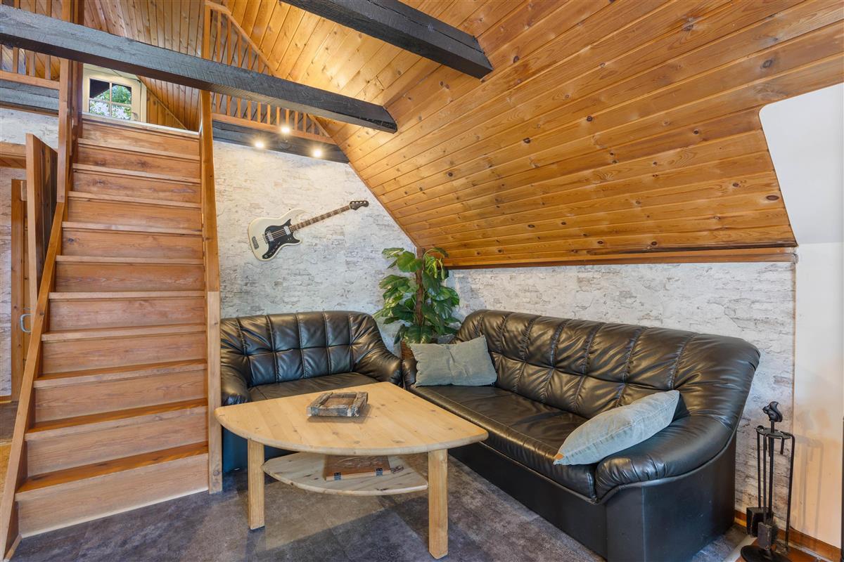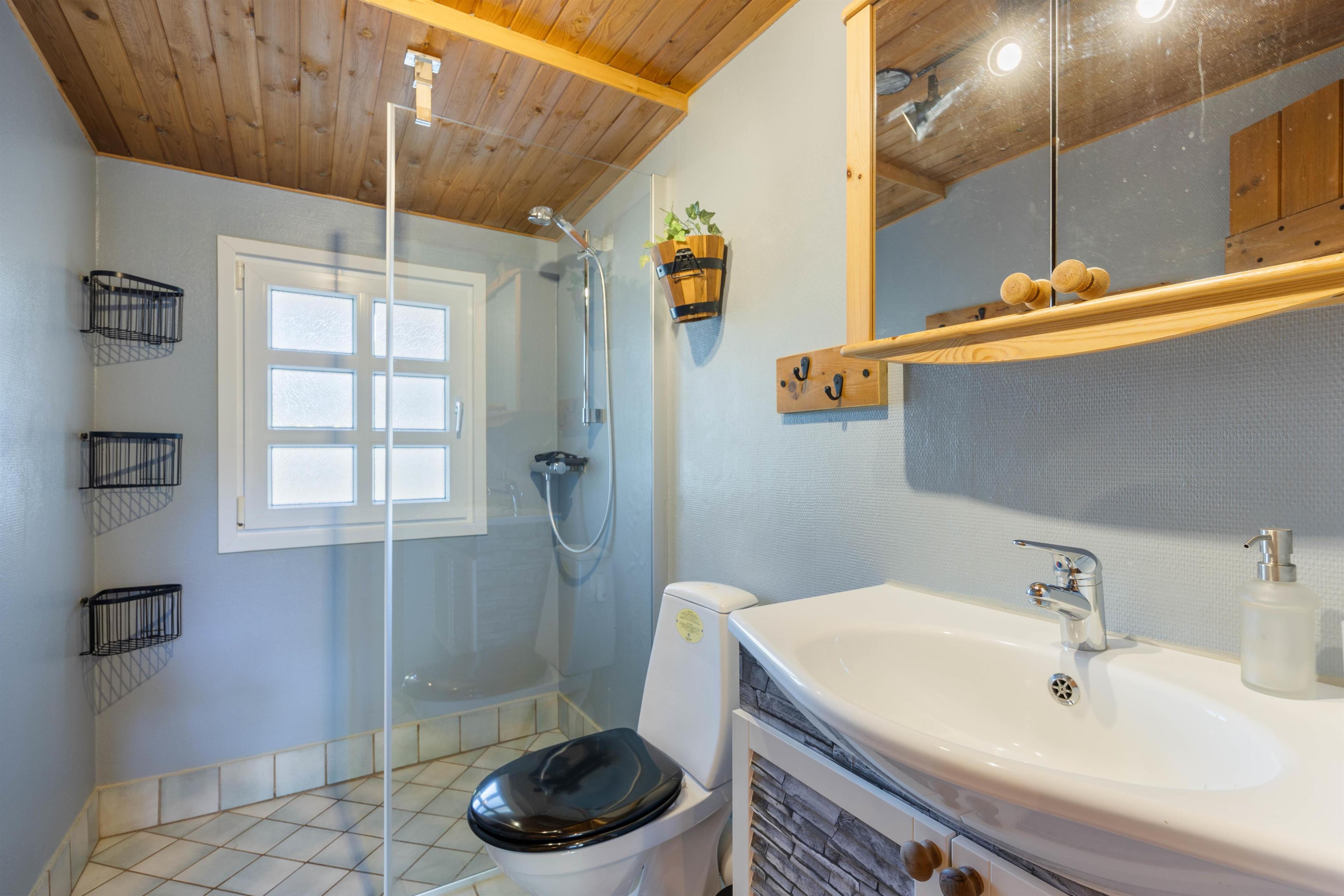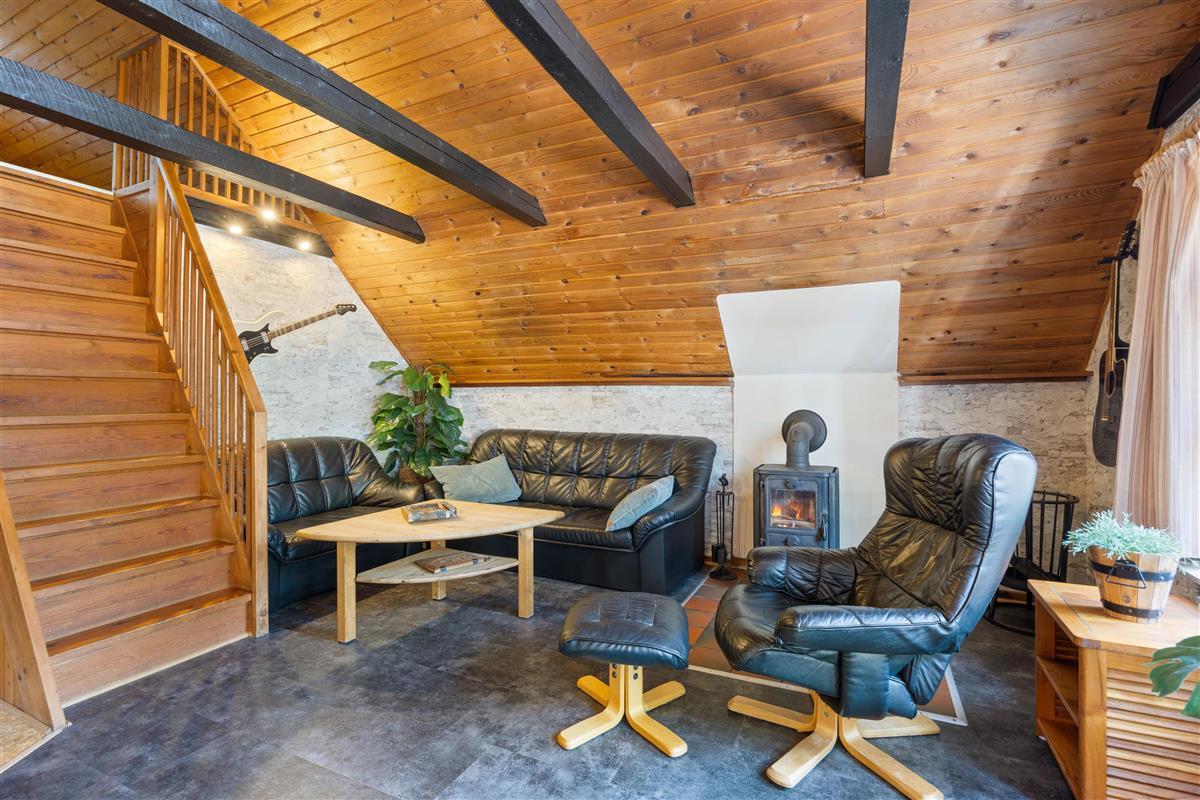 The holiday home at Rævekrogen 8 welcomes you with a cosy, traditional cabin atmosphere featuring exposed wooden beams and wood-panelled walls, reminiscent of an Austrian alpine chalet. Combined with the wood-burning stove, this creates the perfect holiday home ambiance.