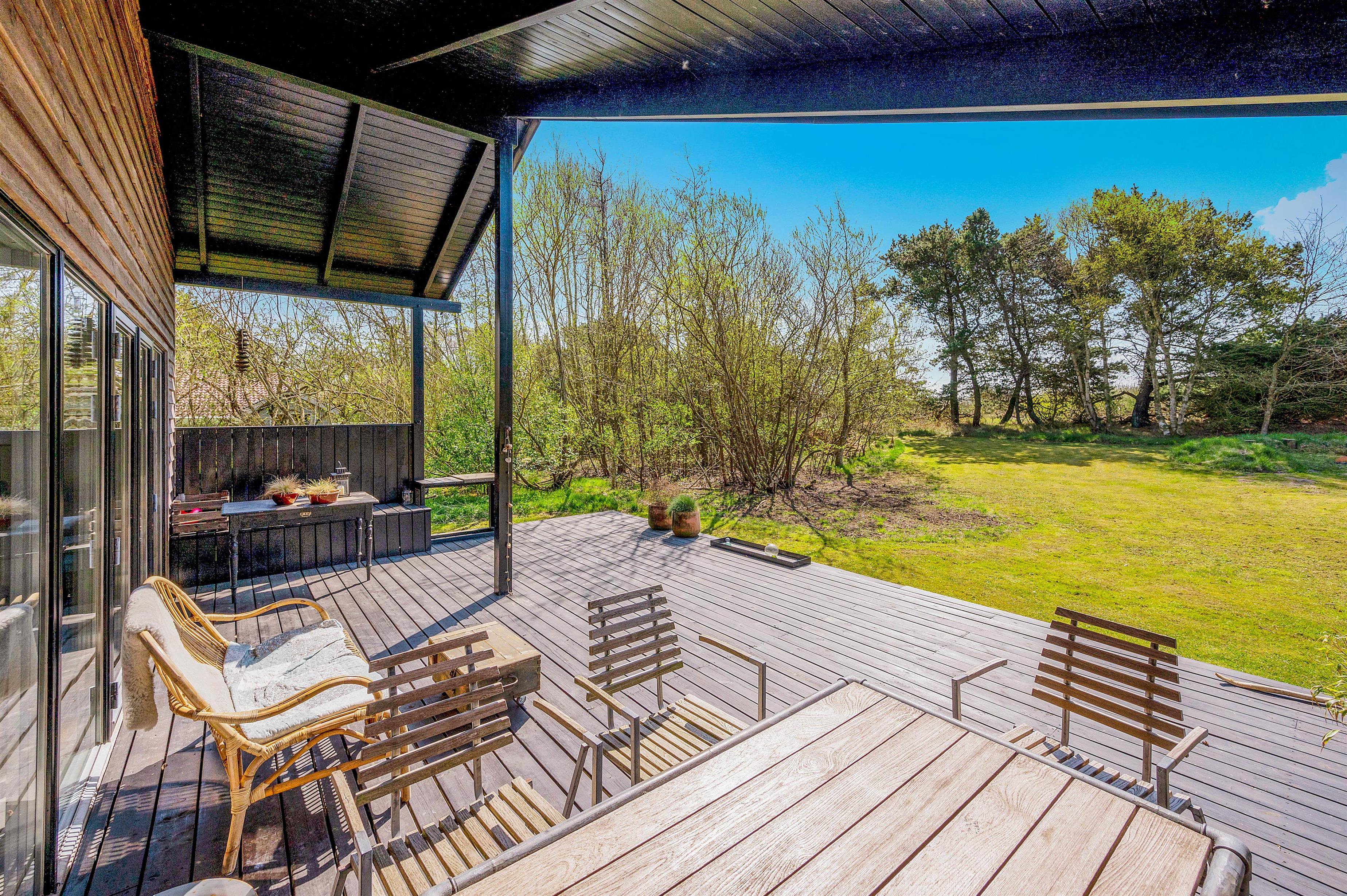 The holiday home sits on a plot of over 2,100 square metres, offering plenty of space for the whole family. The grounds are screened by tall trees, ensuring complete privacy for outdoor relaxation. The outdoor shower (available April-November) is perfect for rinsing off after a day at the beach.