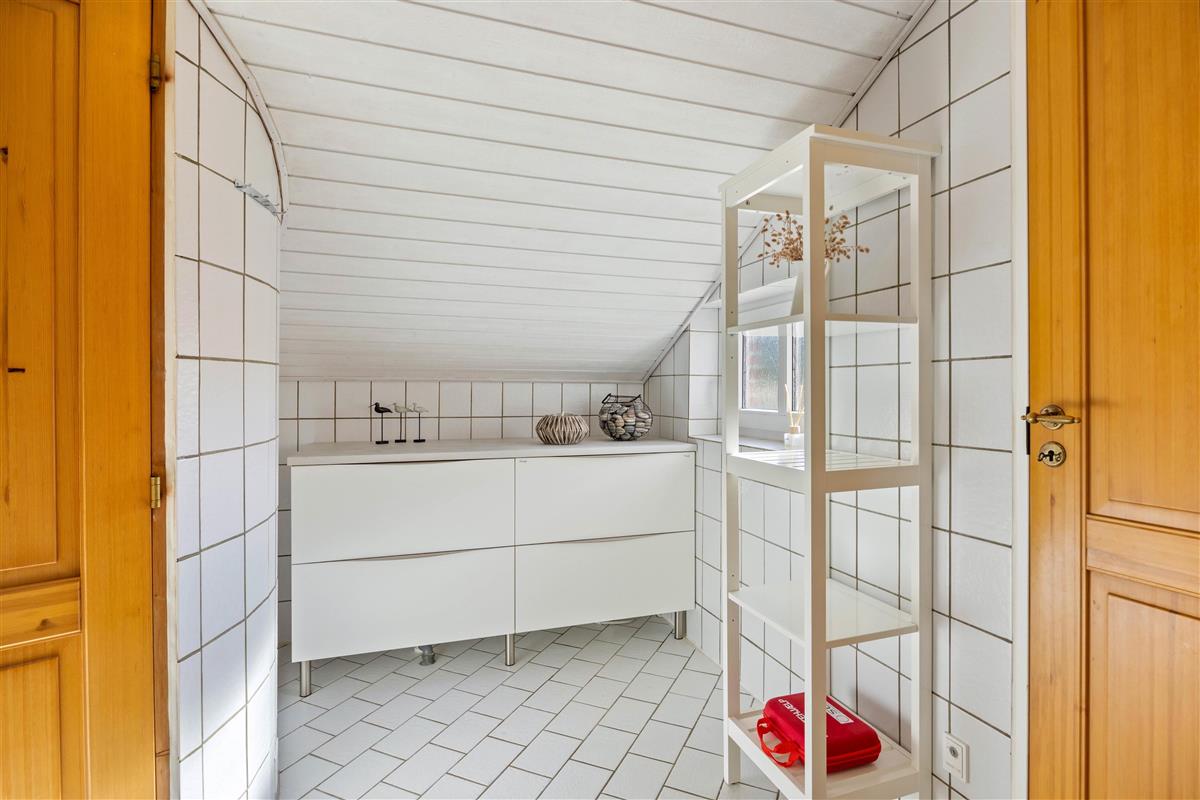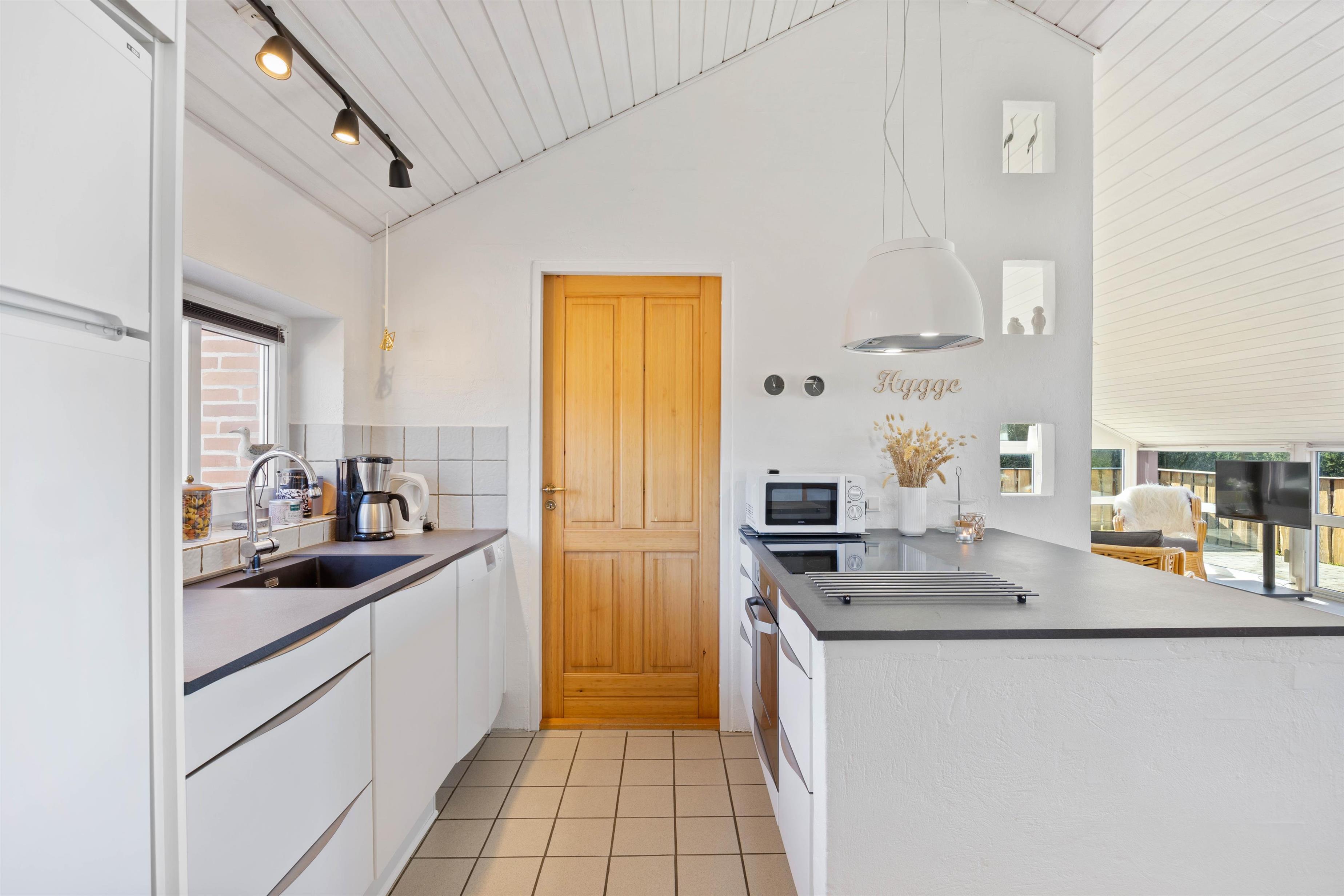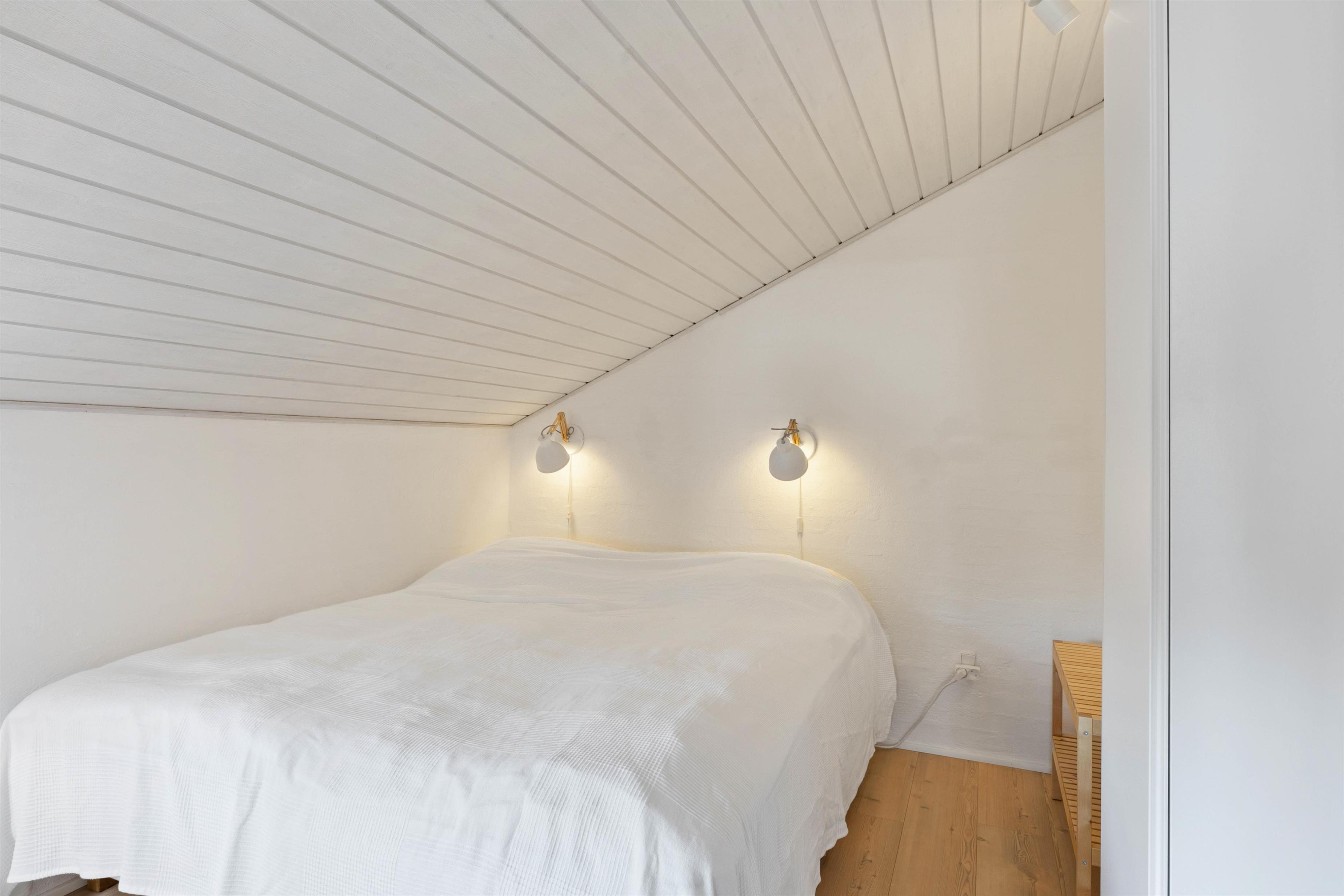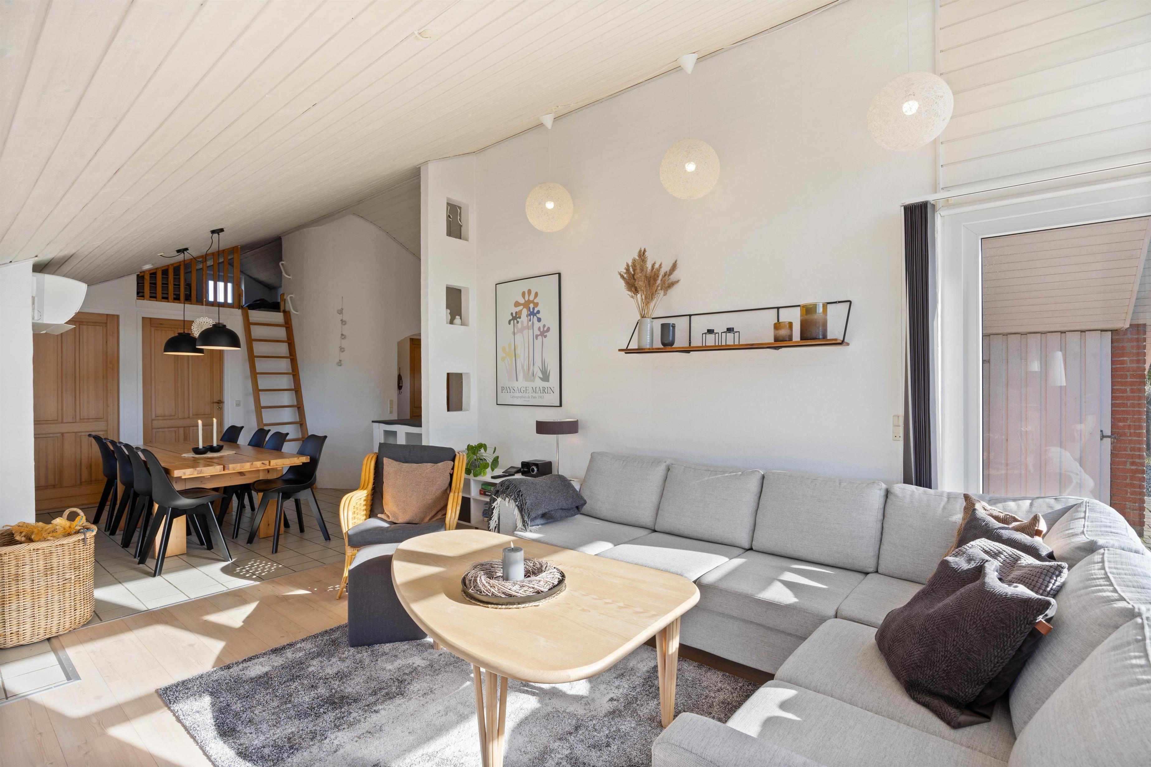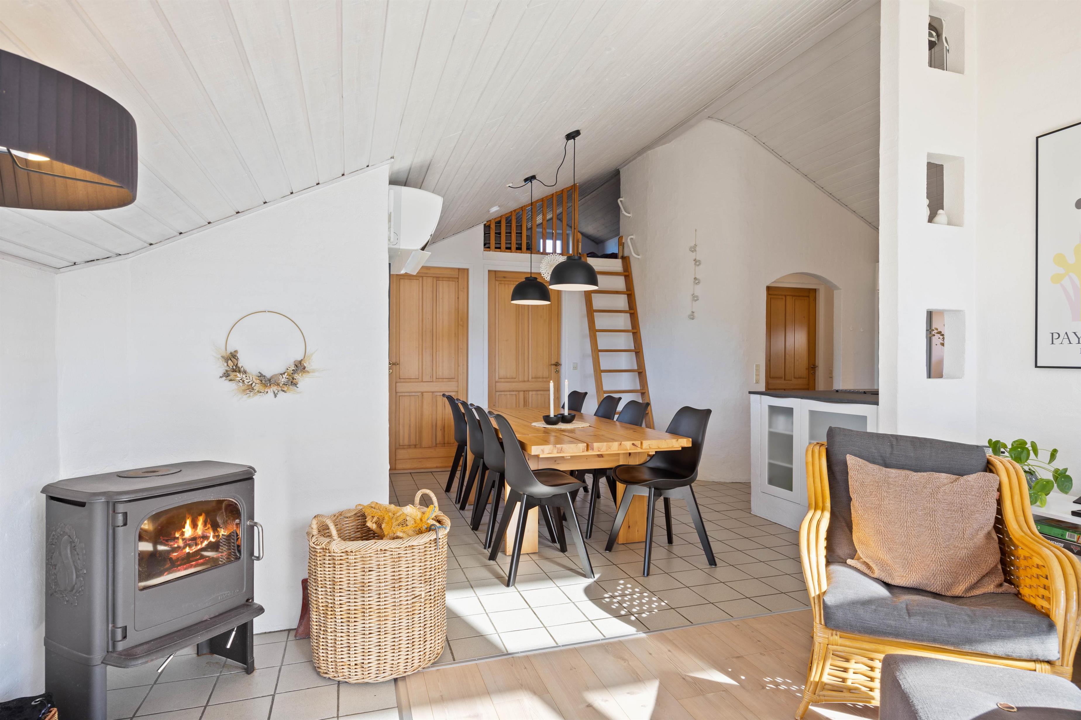 The comfortable living area showcases light colours combined with natural tones and is decorated with a charming mix of retro and modern elements. The wood-burning stove provides cosy warmth in the evenings, while an energy-efficient heat pump is also available.