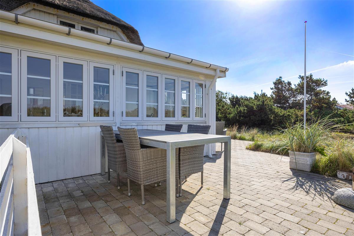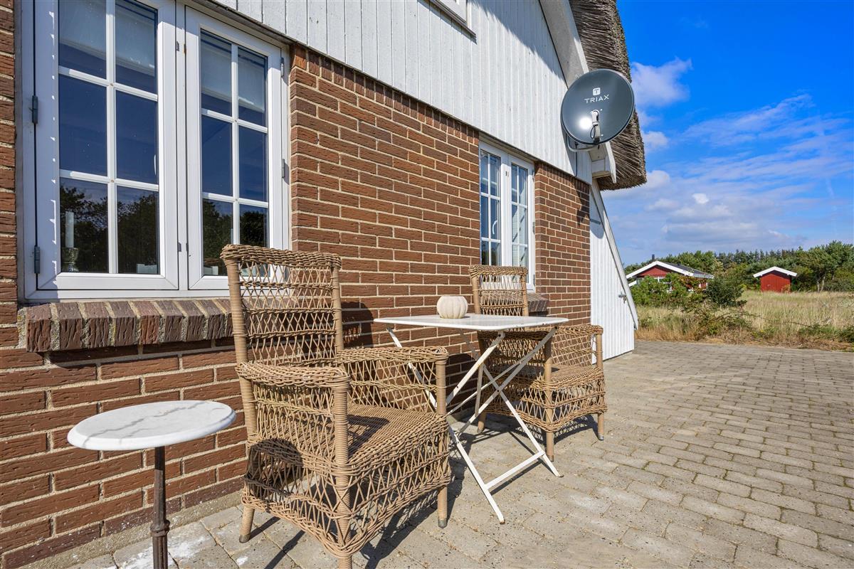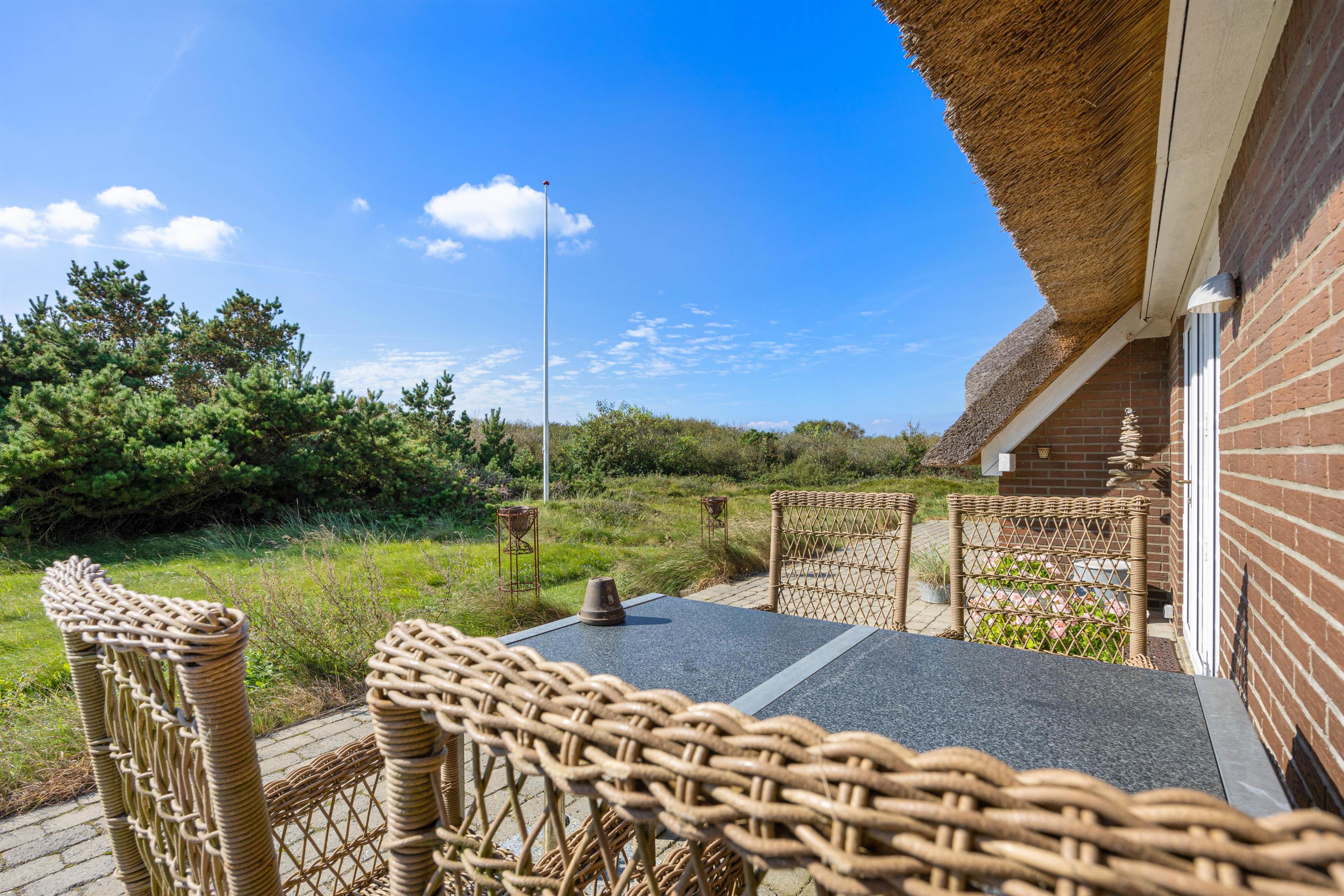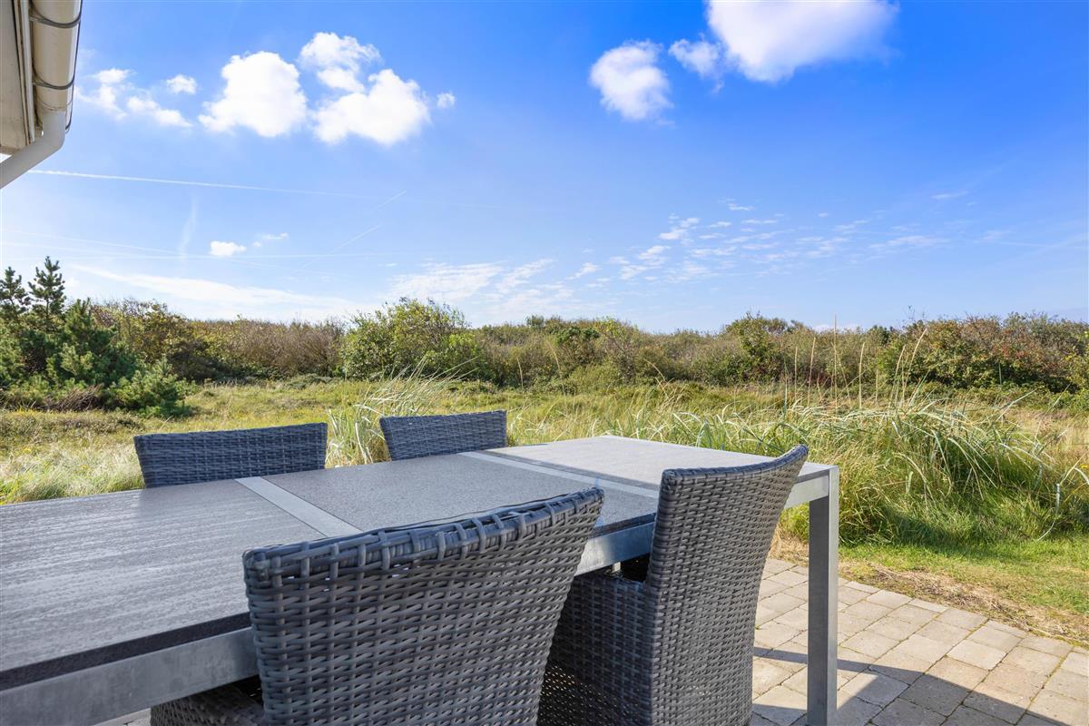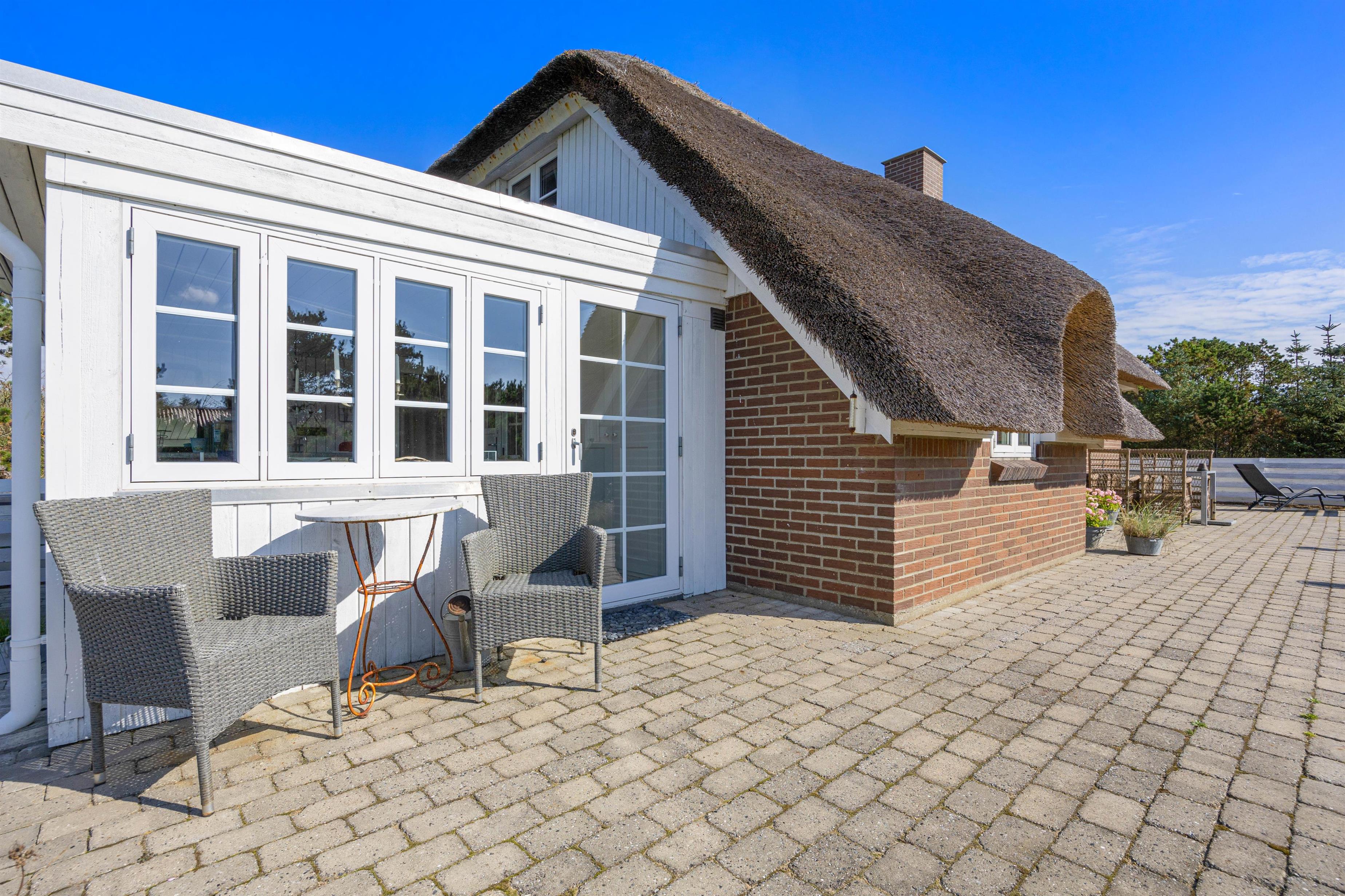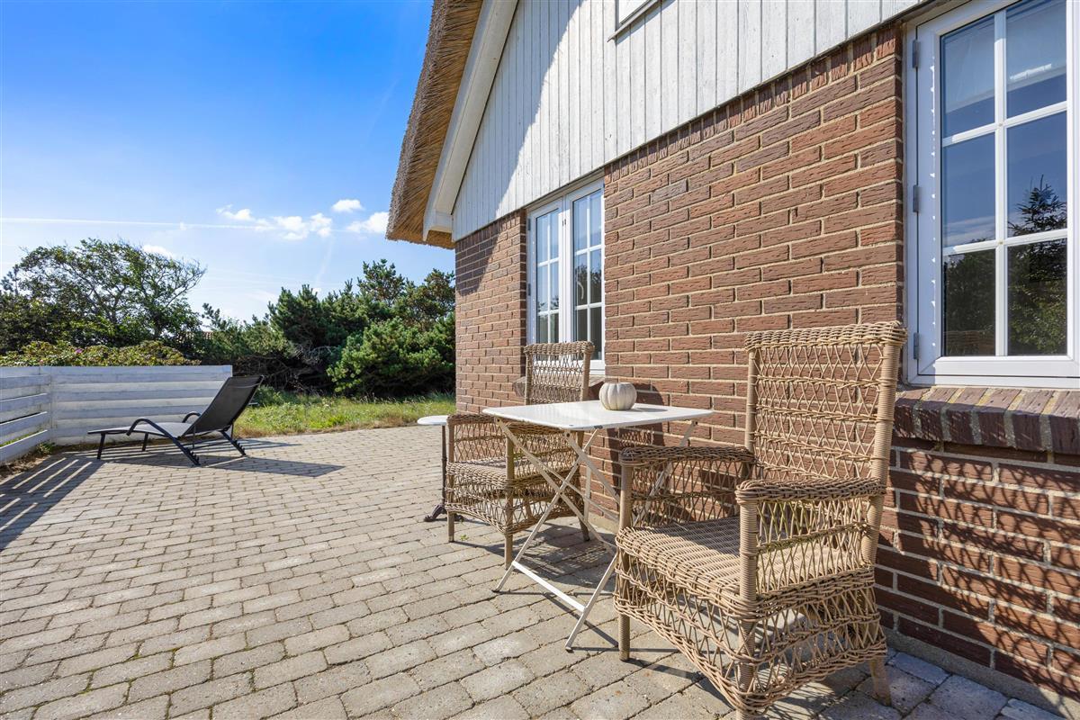 The 2,002-square-metre plot is nestled in the natural surroundings of Lodberg Hede. Watch the sunset over the Søndervig dunes from the stone terrace that wraps around the holiday home, allowing you to follow the sun throughout the day.