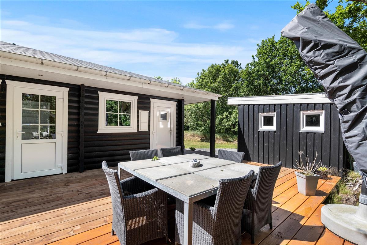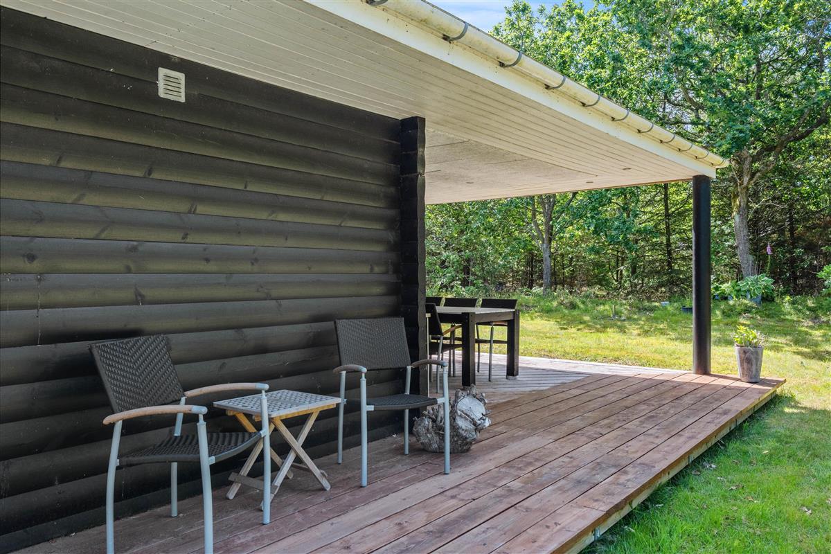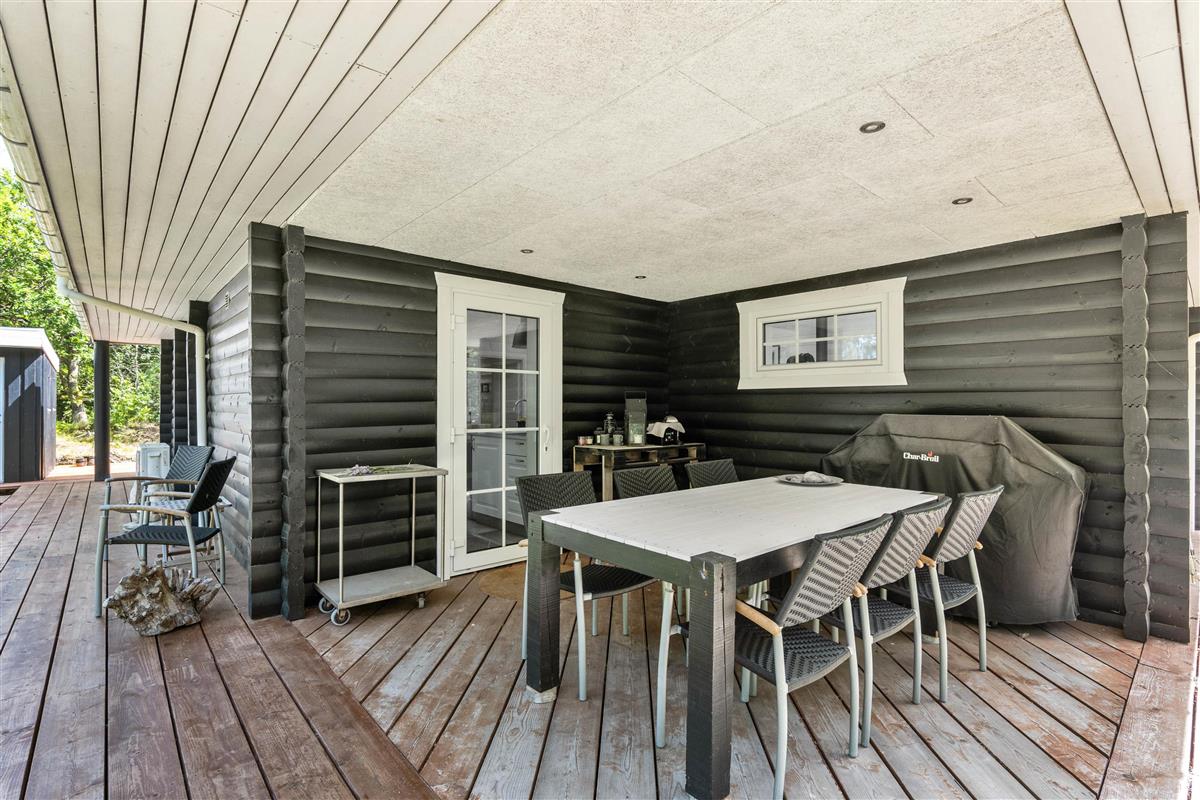 A partially covered and sheltered wooden terrace wraps around most of the house, perfect for enjoying warm holiday days. Here you can relax on the garden furniture and sun loungers while taking in views of the surrounding countryside.