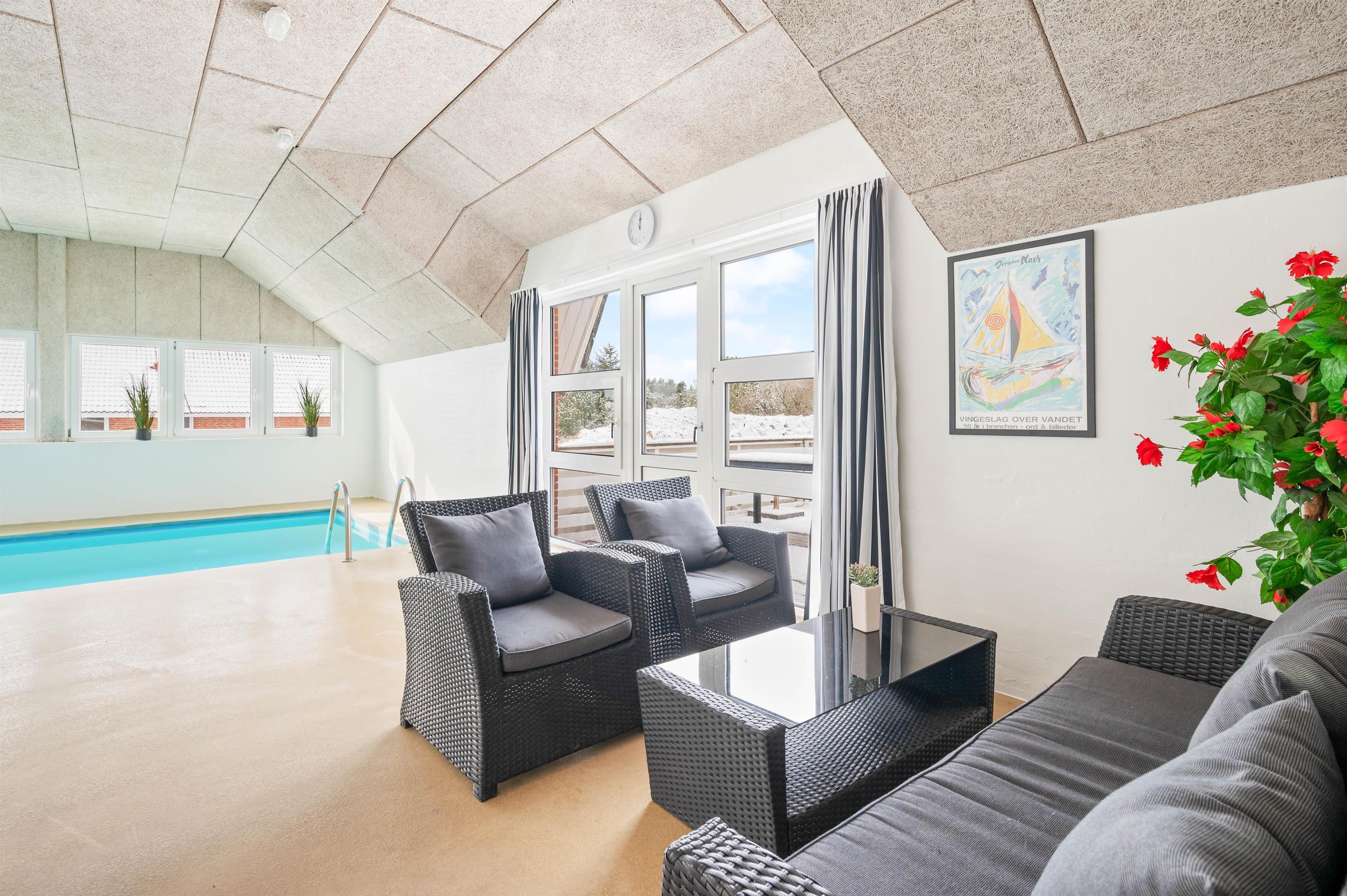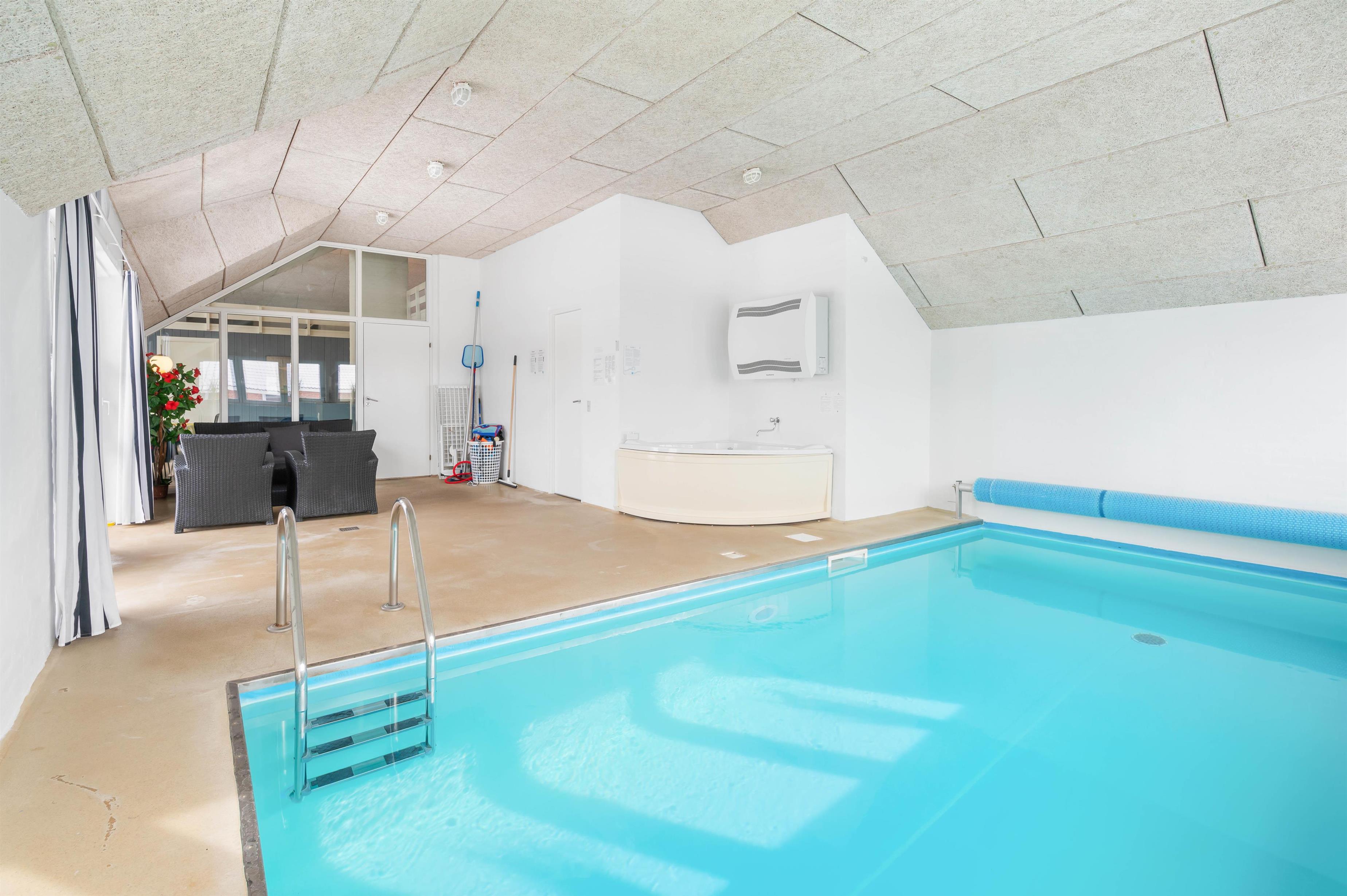 This holiday home boasts a lovely pool area with an 18-square-metre swimming pool. Next to the pool, you'll find a large hot tub where you can relax and forget everyday stress. The pool area includes one of the two bathrooms with shower, and from here you can also access the private sauna.