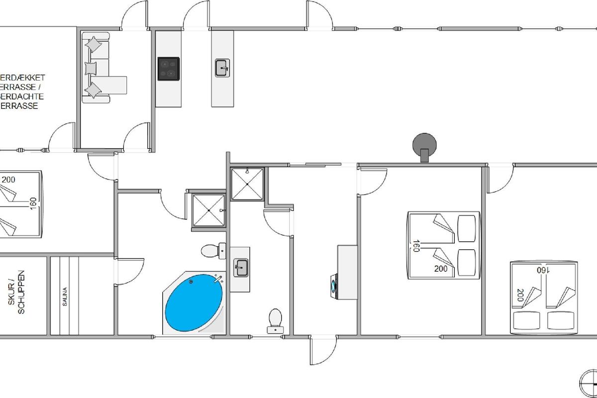 The holiday home offers three bedrooms with double beds and one room with a sofa bed. There are also two beautiful bathrooms with shower and underfloor heating. One bathroom even features a wellness area with whirlpool and sauna. Perfect for those wanting to escape everyday life and treat themselves to some relaxation for body and soul.
