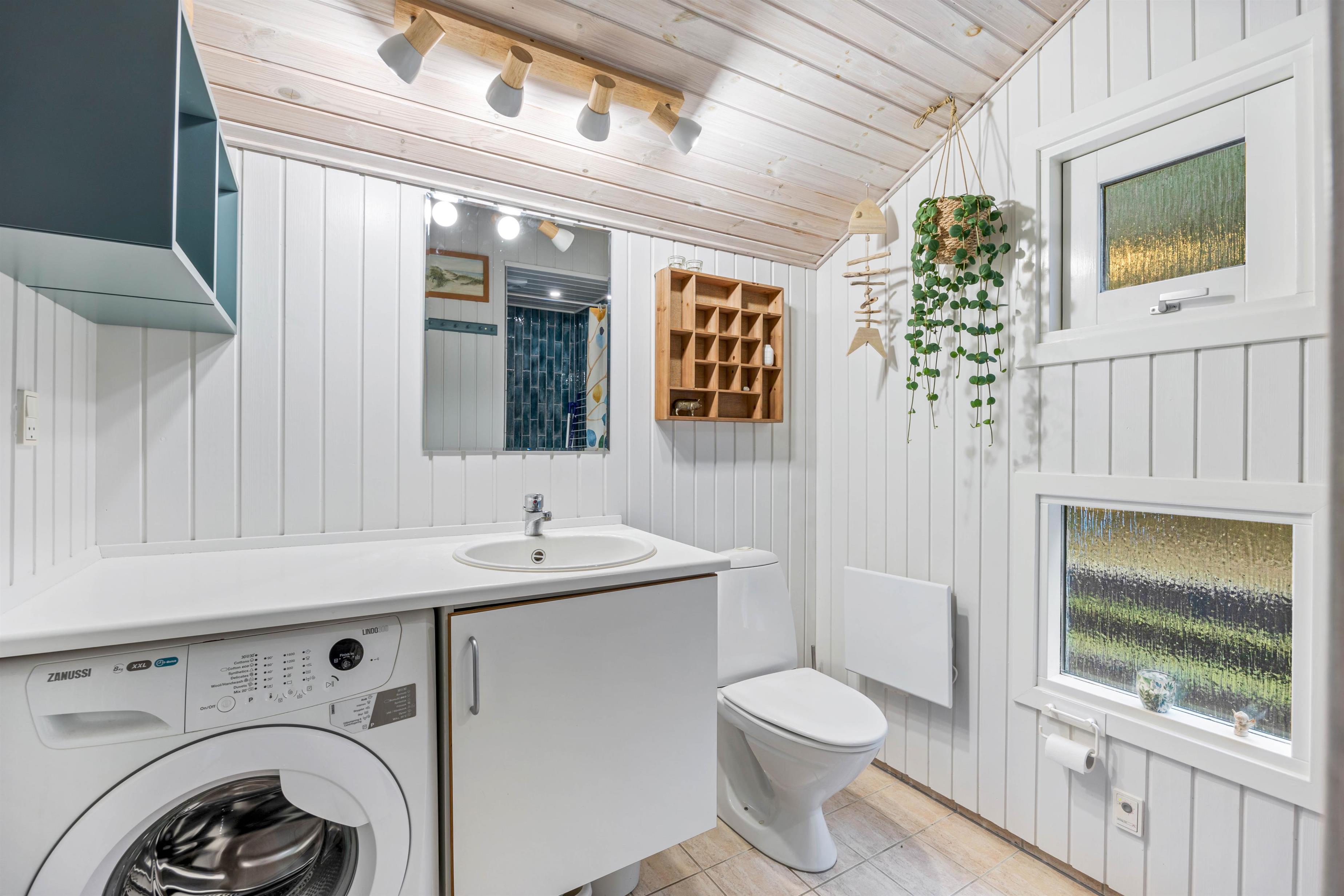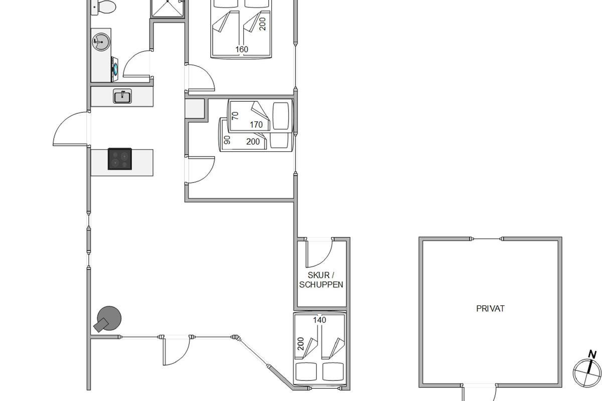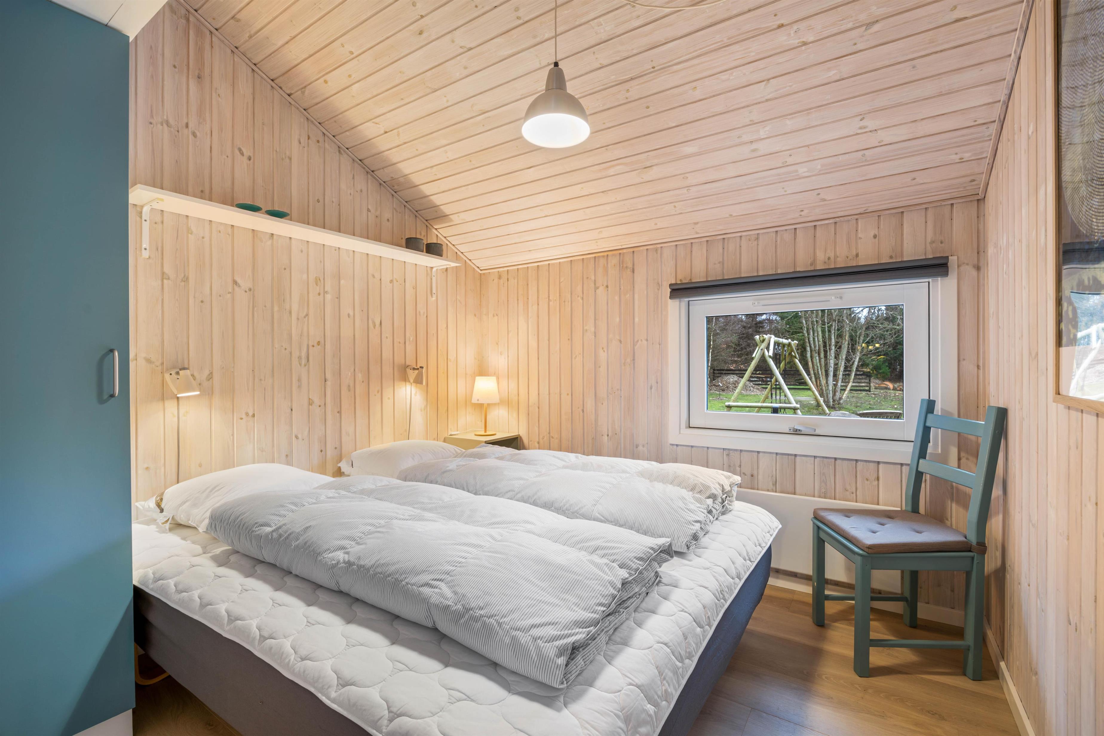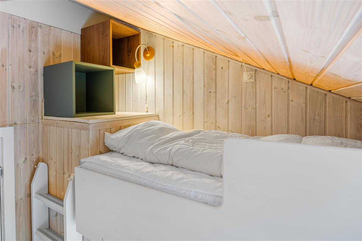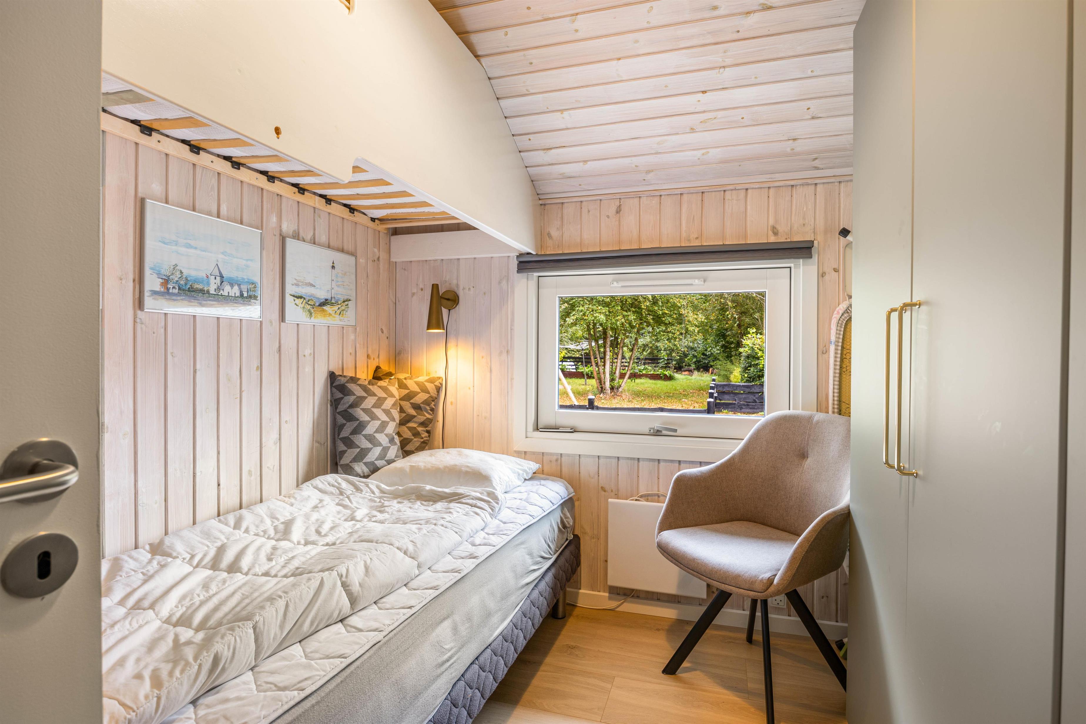 The holiday home has 1 bathroom with underfloor heating. There are also 2 bedrooms, one with a double bed measuring 160 cm x 200 cm and the other with a bunk bed, the lower bed measuring 90 cm x 200 cm and the upper bed only 70 cm x 170 cm, which is well suited for children.