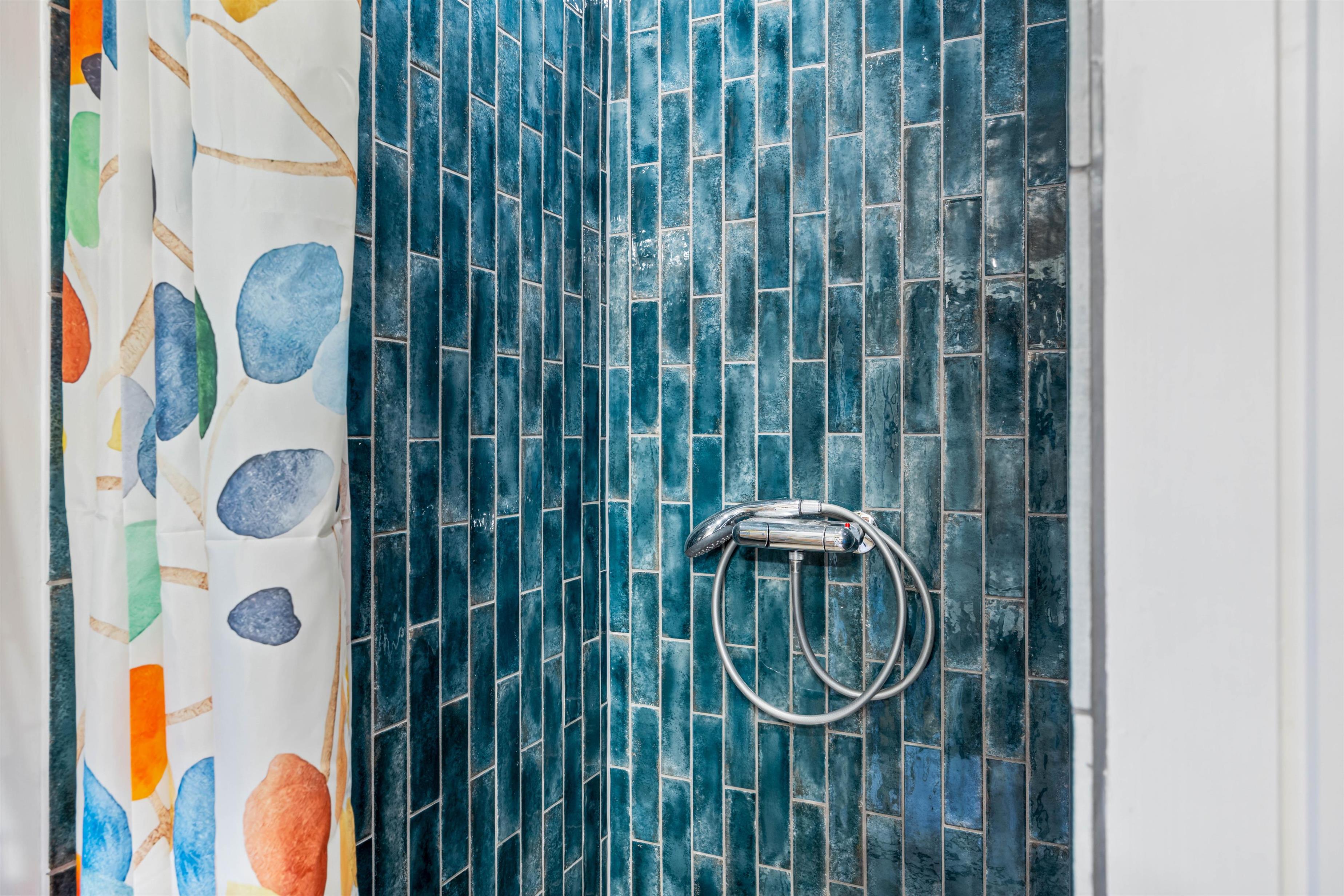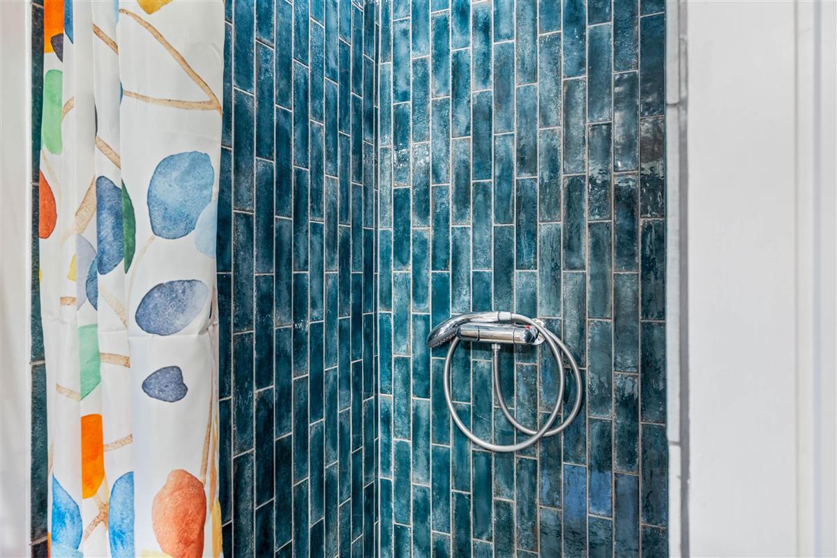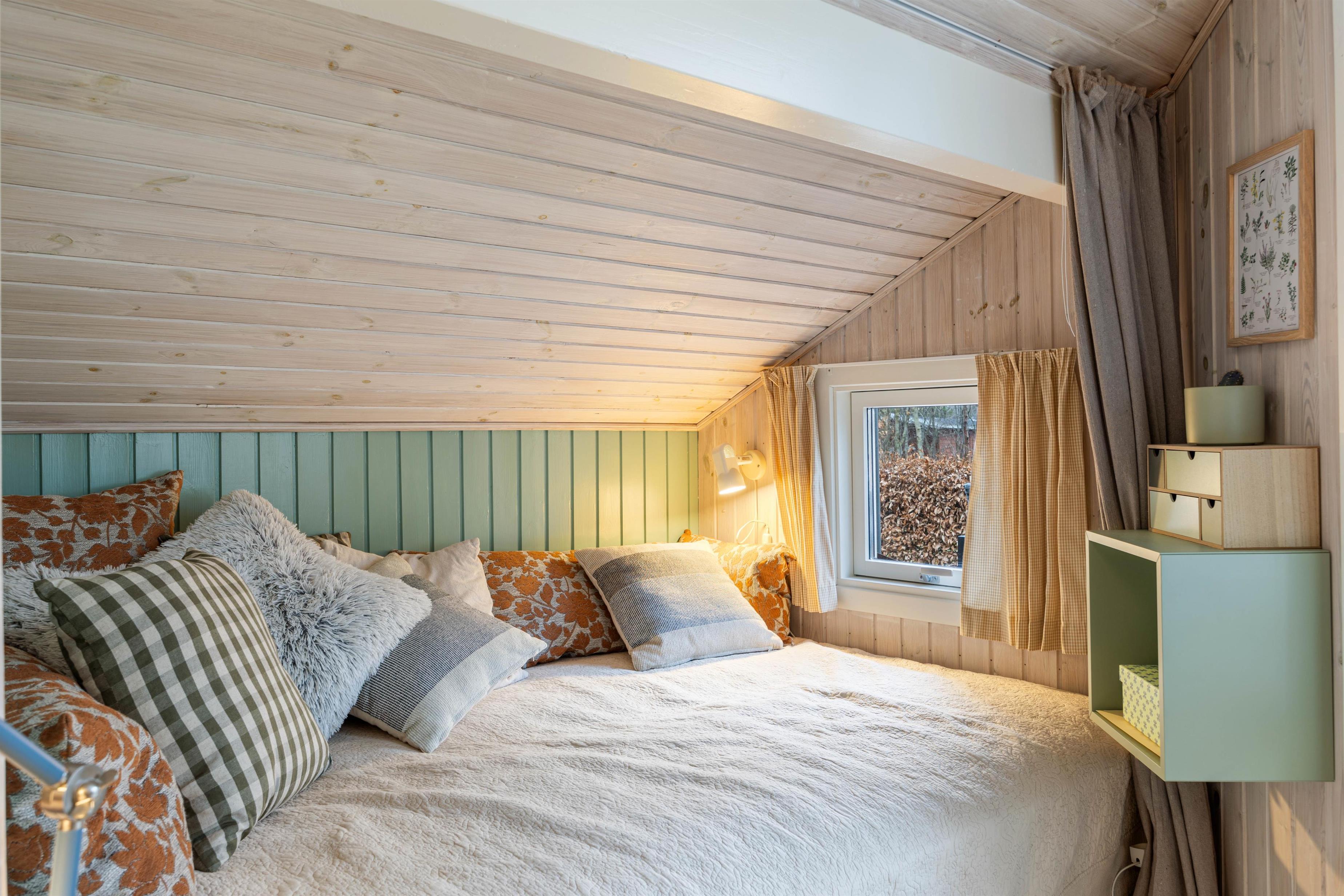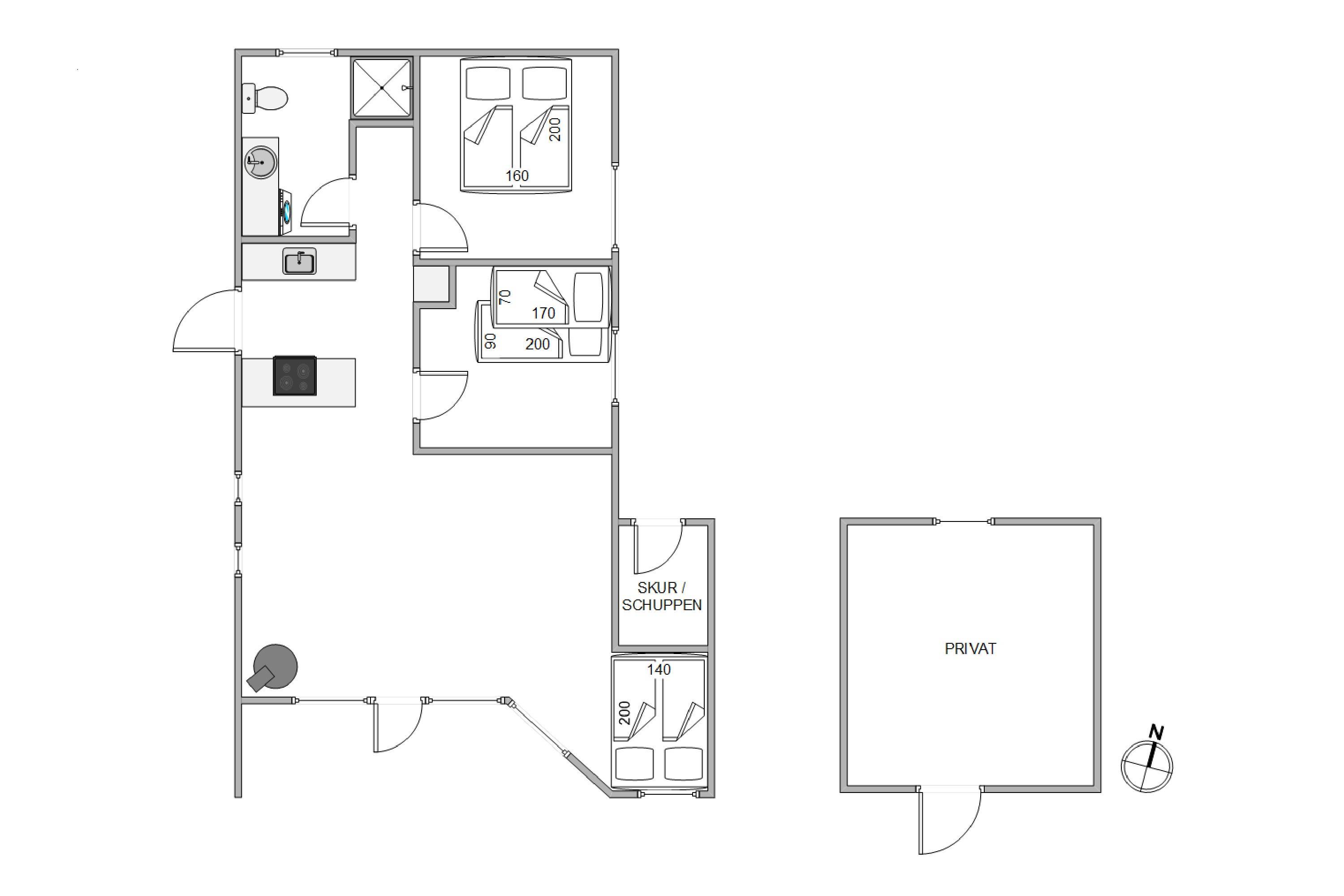 The holiday home has 1 bathroom with underfloor heating. There are also 2 bedrooms, one with a double bed measuring 160 cm x 200 cm and the other with a bunk bed, the lower bed measuring 90 cm x 200 cm and the upper bed only 70 cm x 170 cm, which is well suited for children.