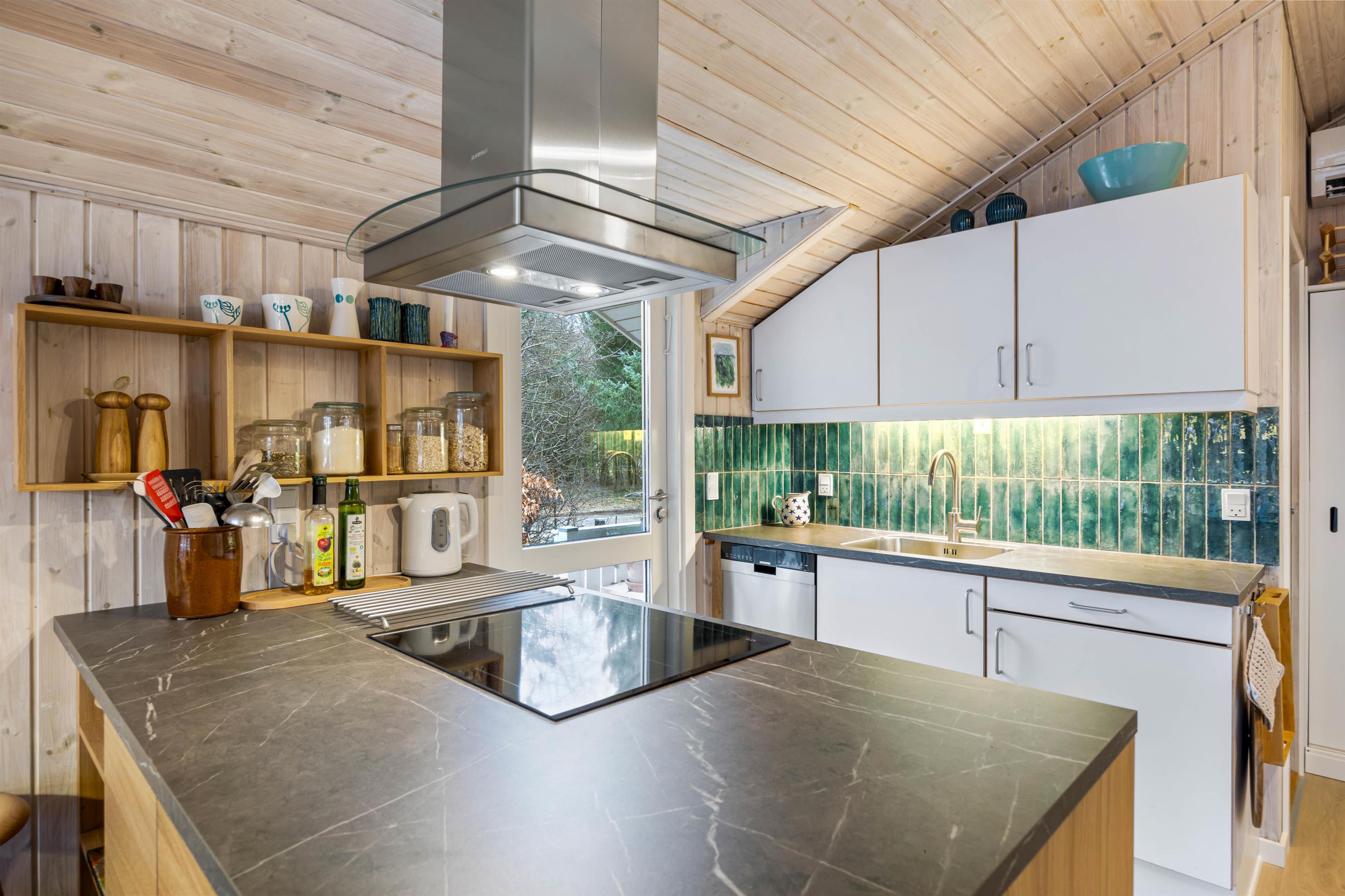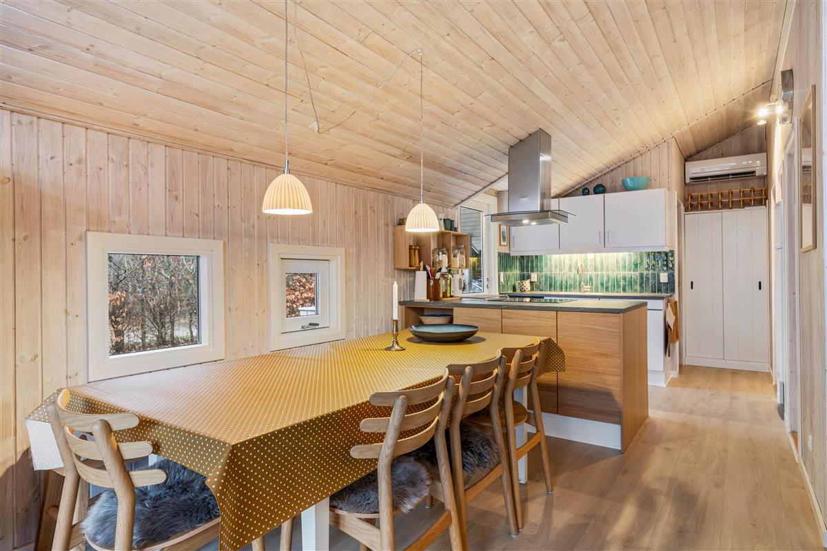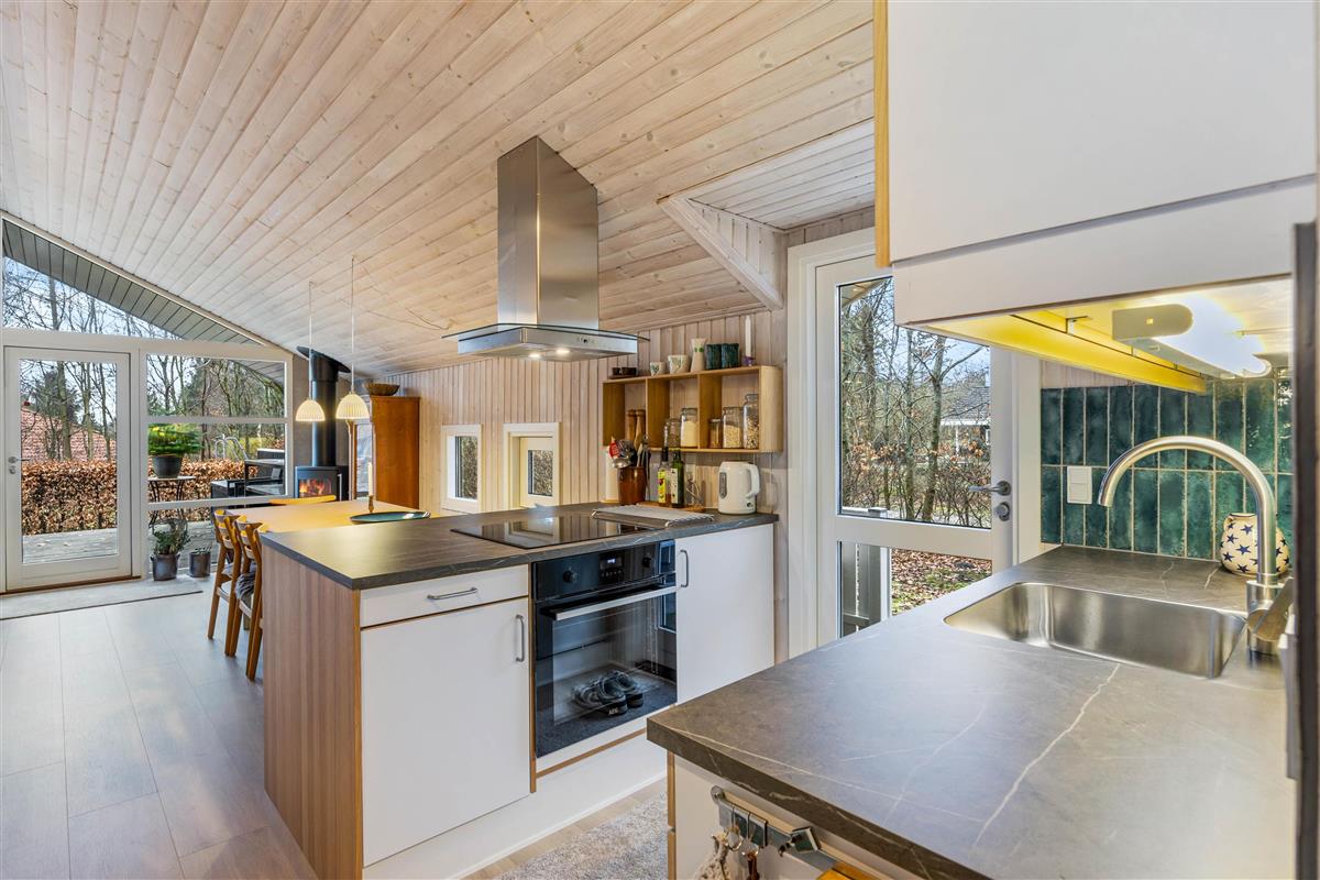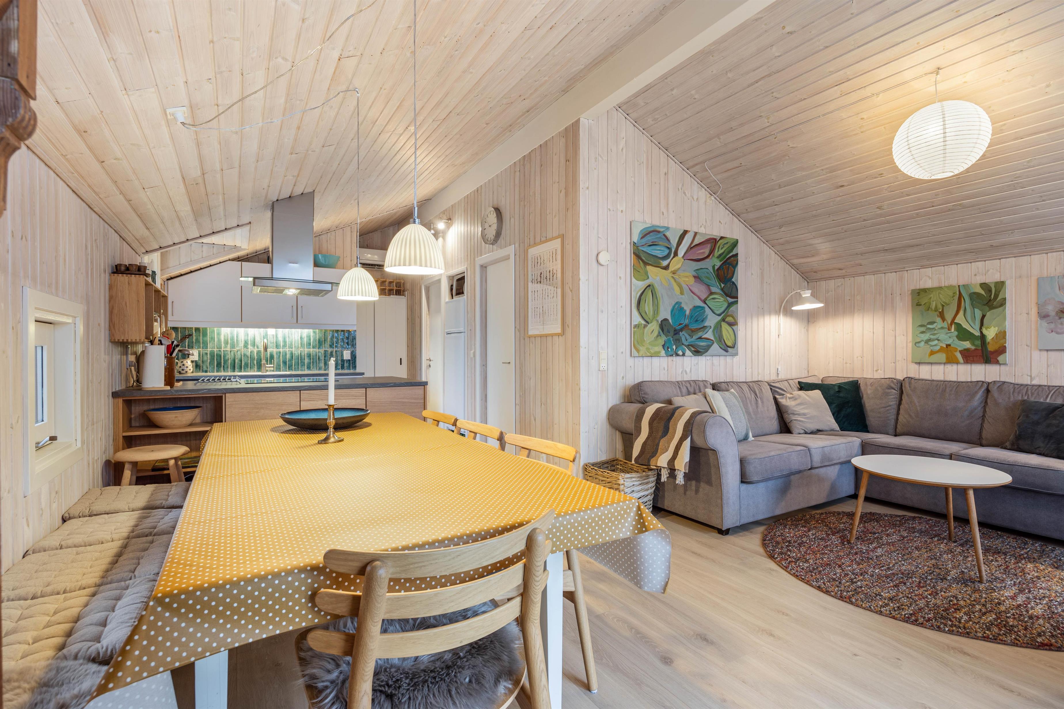 The large living area is the heart of the holiday home, combining the kitchen, dining area, and living room in one room. You will share many hours together and lots of wonderful vacation moments here. Whether you gather for delicious meals, fun games, or good movies, the wood-burning stove completes the holiday atmosphere. The alcove in the living room measures 140 cm x 200 cm and is suitable as an additional sleeping area.