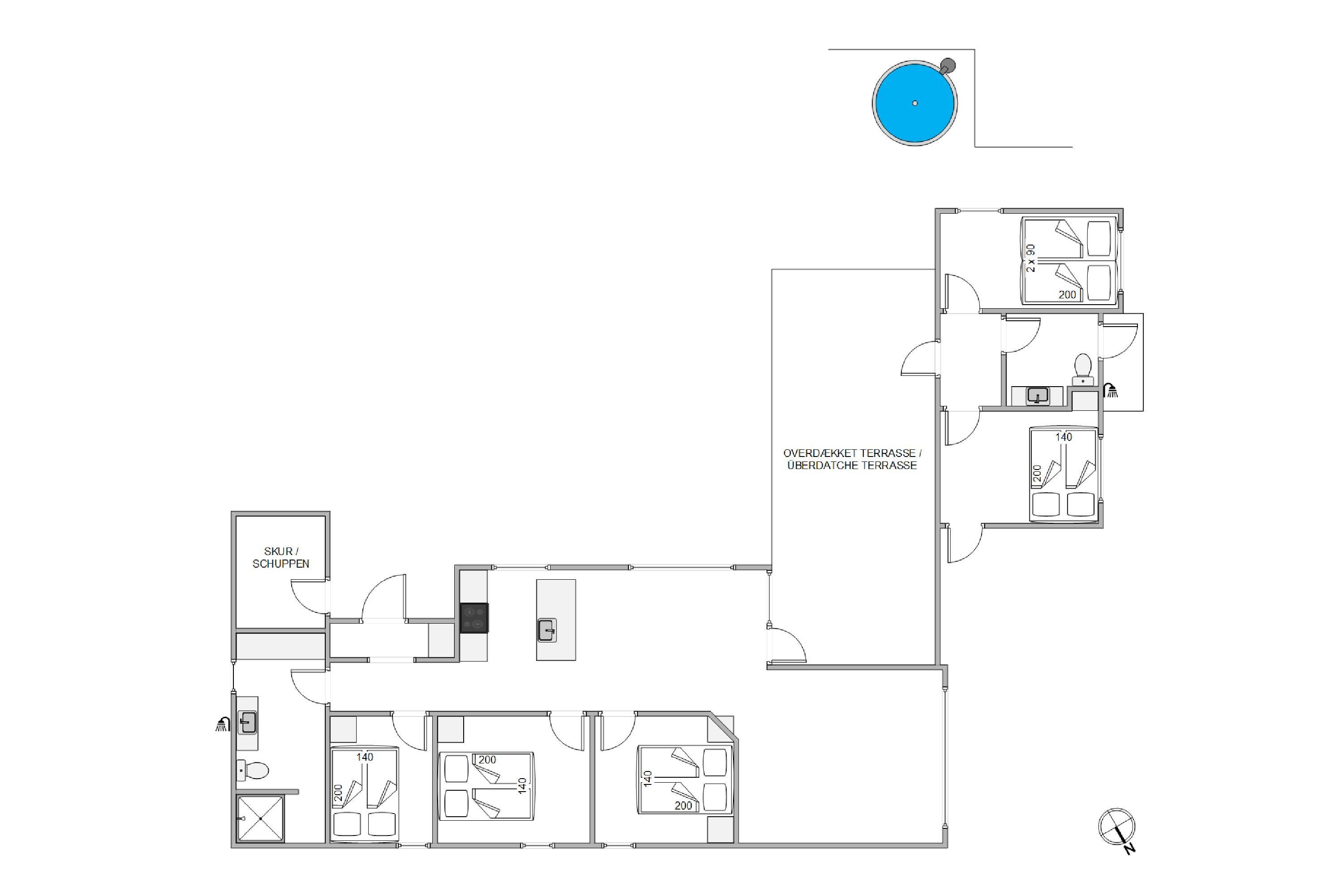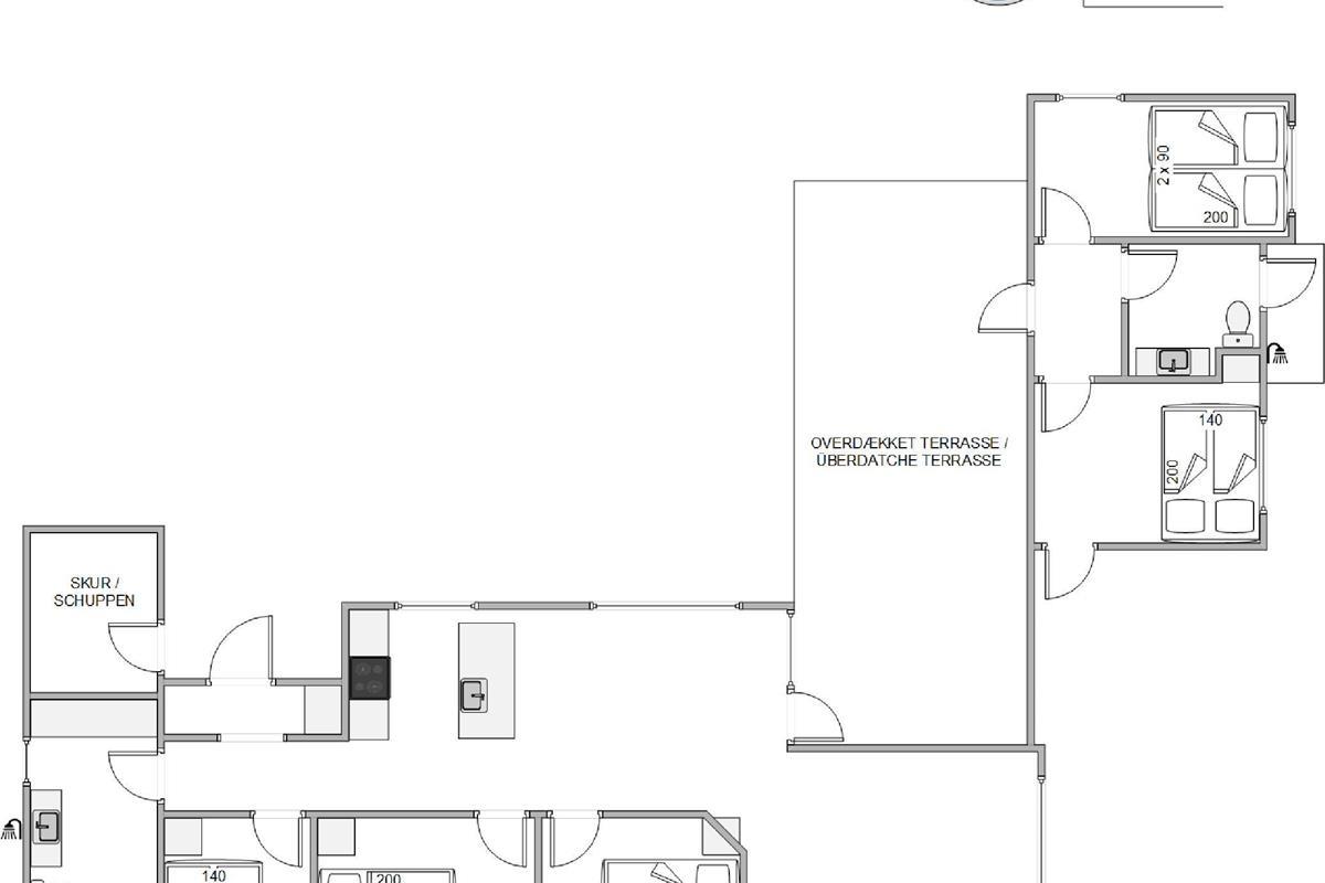 The holiday home can accommodate up to 10 people across five bedrooms. All bedrooms feature double beds, ensuring everyone has their own space during the holiday. To avoid morning queues, there's a guest toilet in addition to the main bathroom.