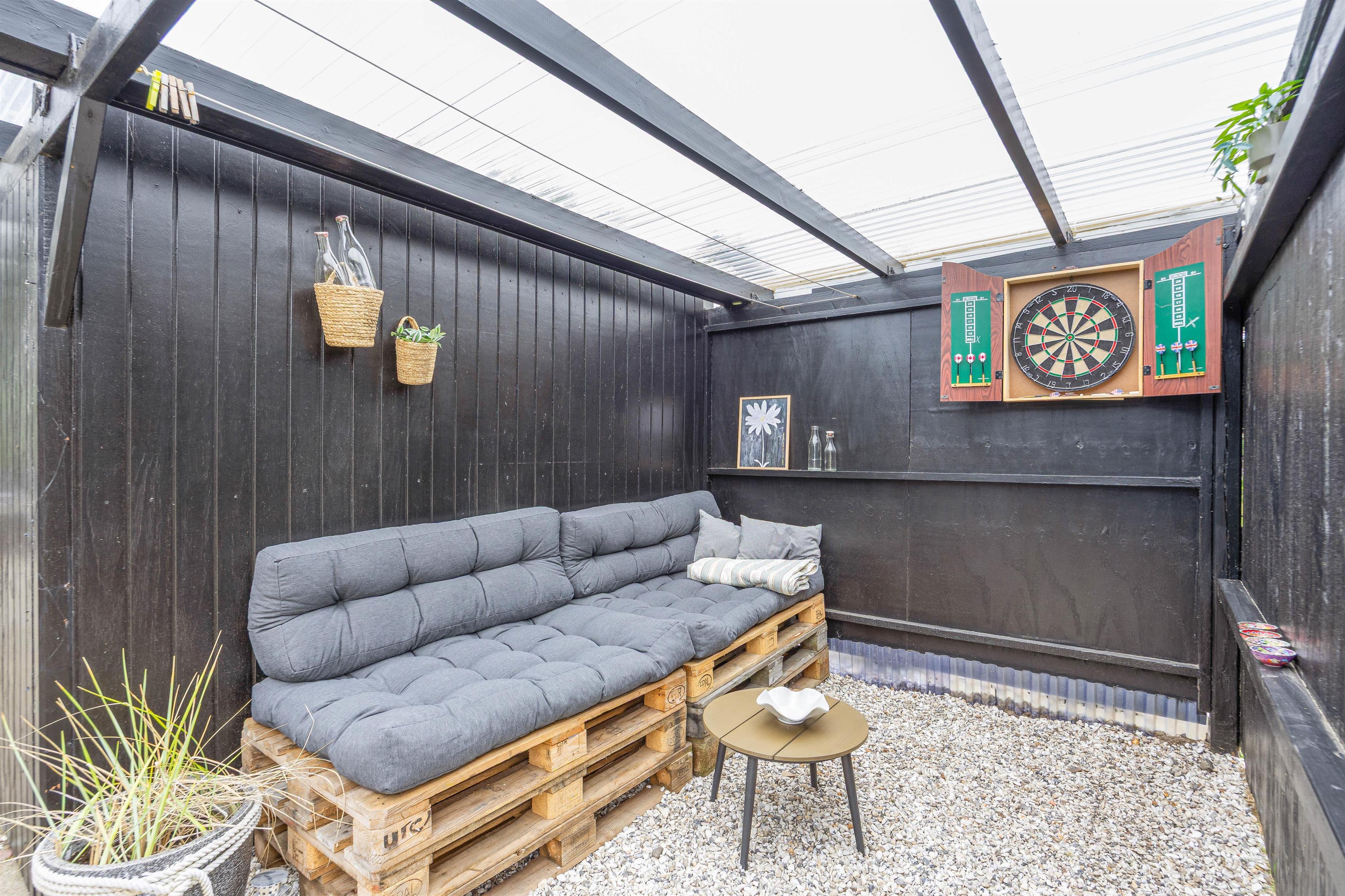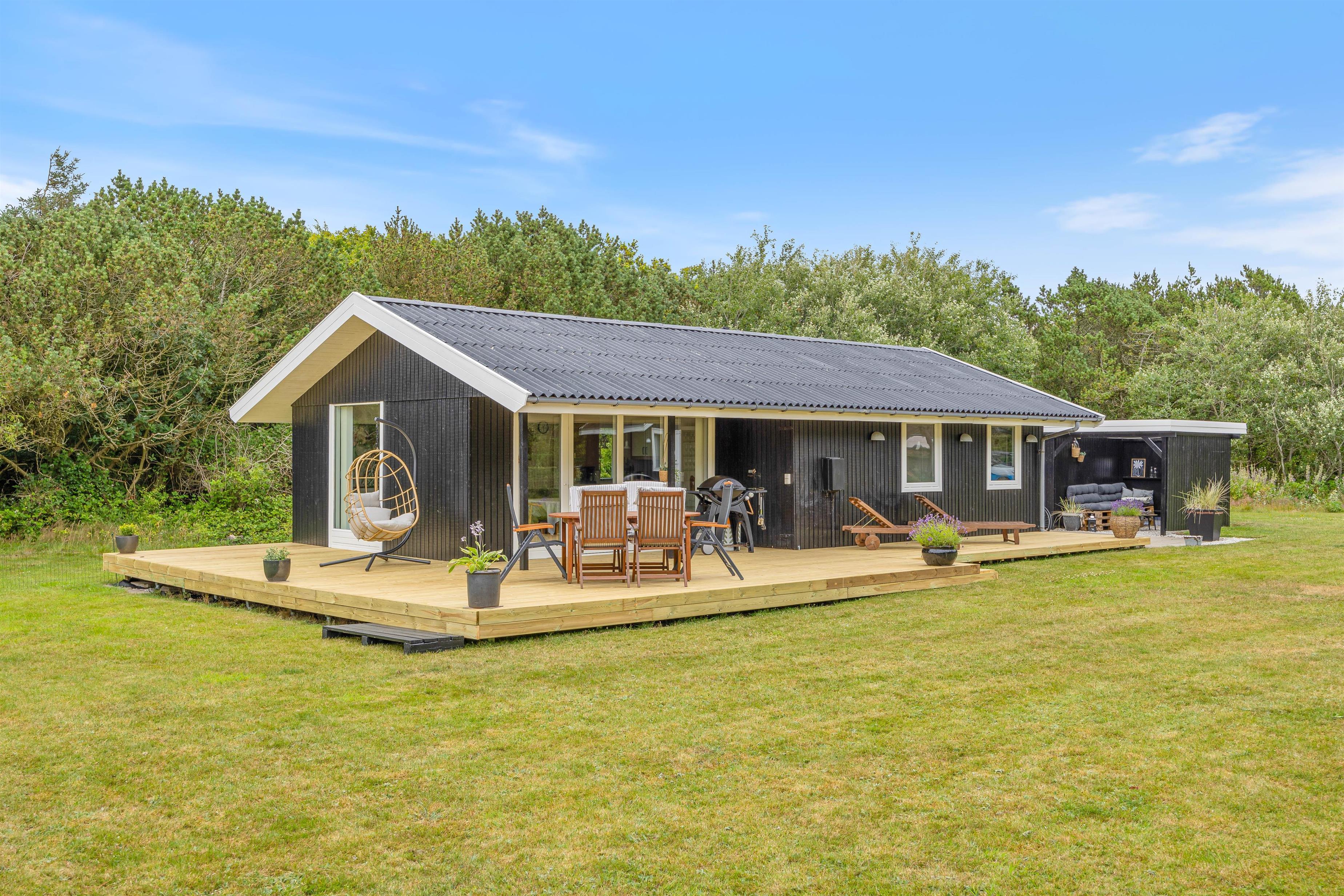 The expansive 2,060-square-meter lawn offers plenty of space for outdoor fun. Enjoy swings, lounge in the hammock, gather around the fire pit, or relax in the outdoor hot tub beneath the open sky – a perfect outdoor escape for both children and adults. A charming lounge in the driveway lets you enjoy the fresh Danish air even on rainy days while playing a game of darts.