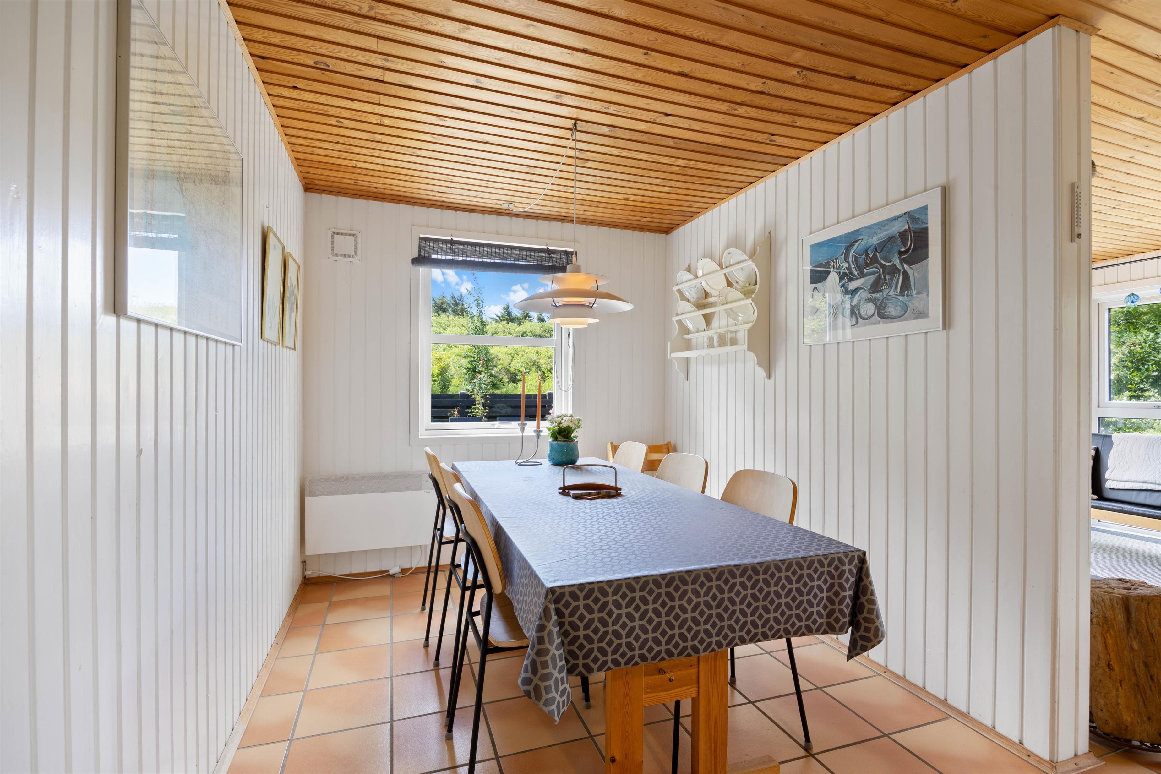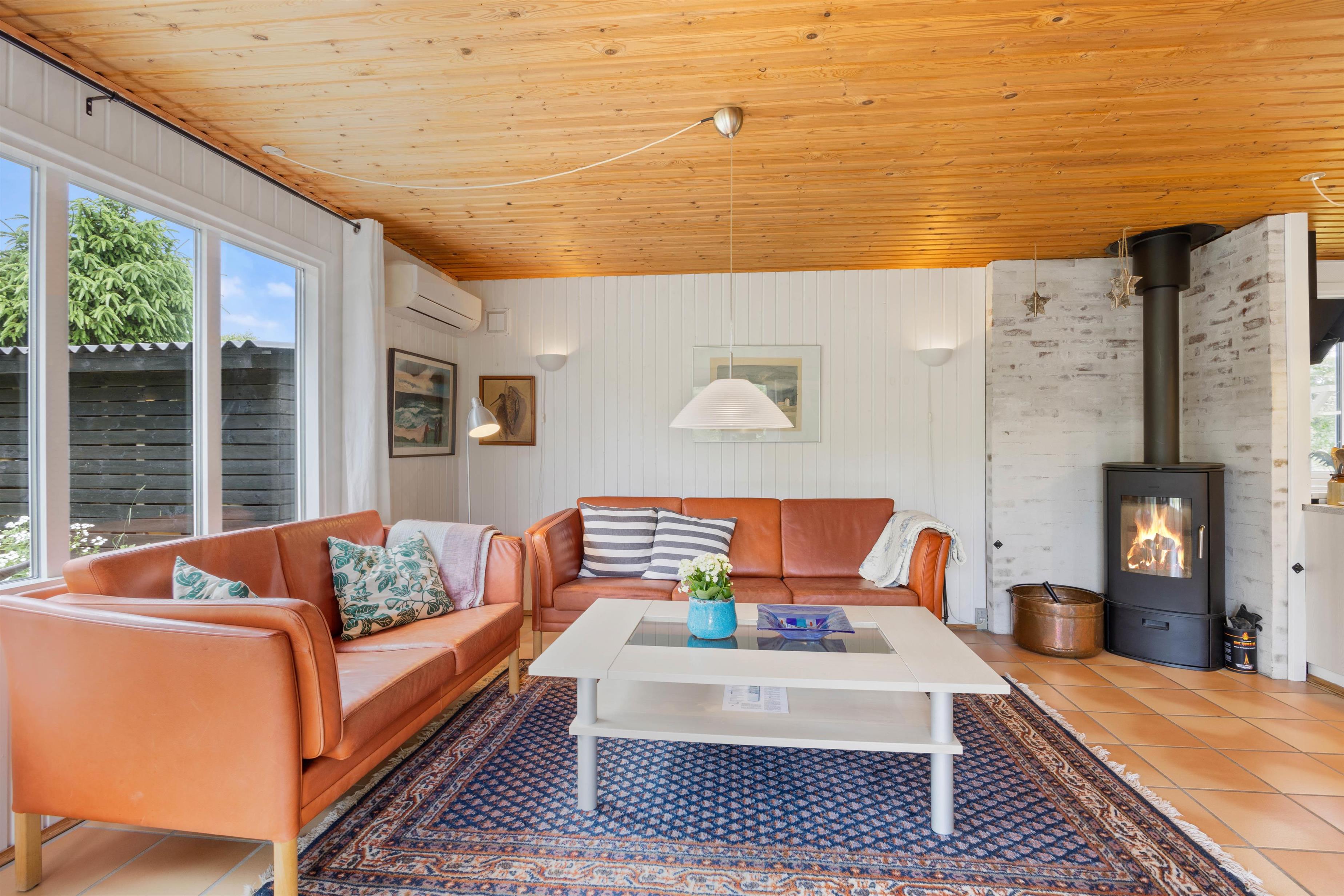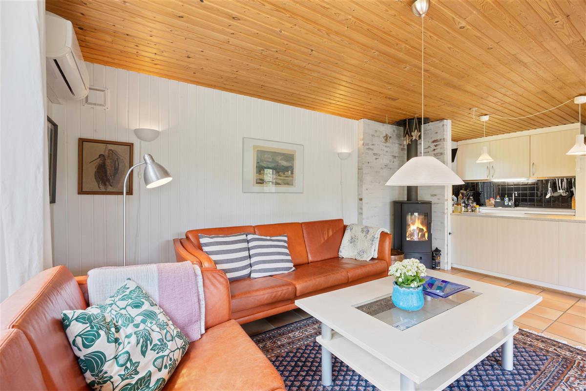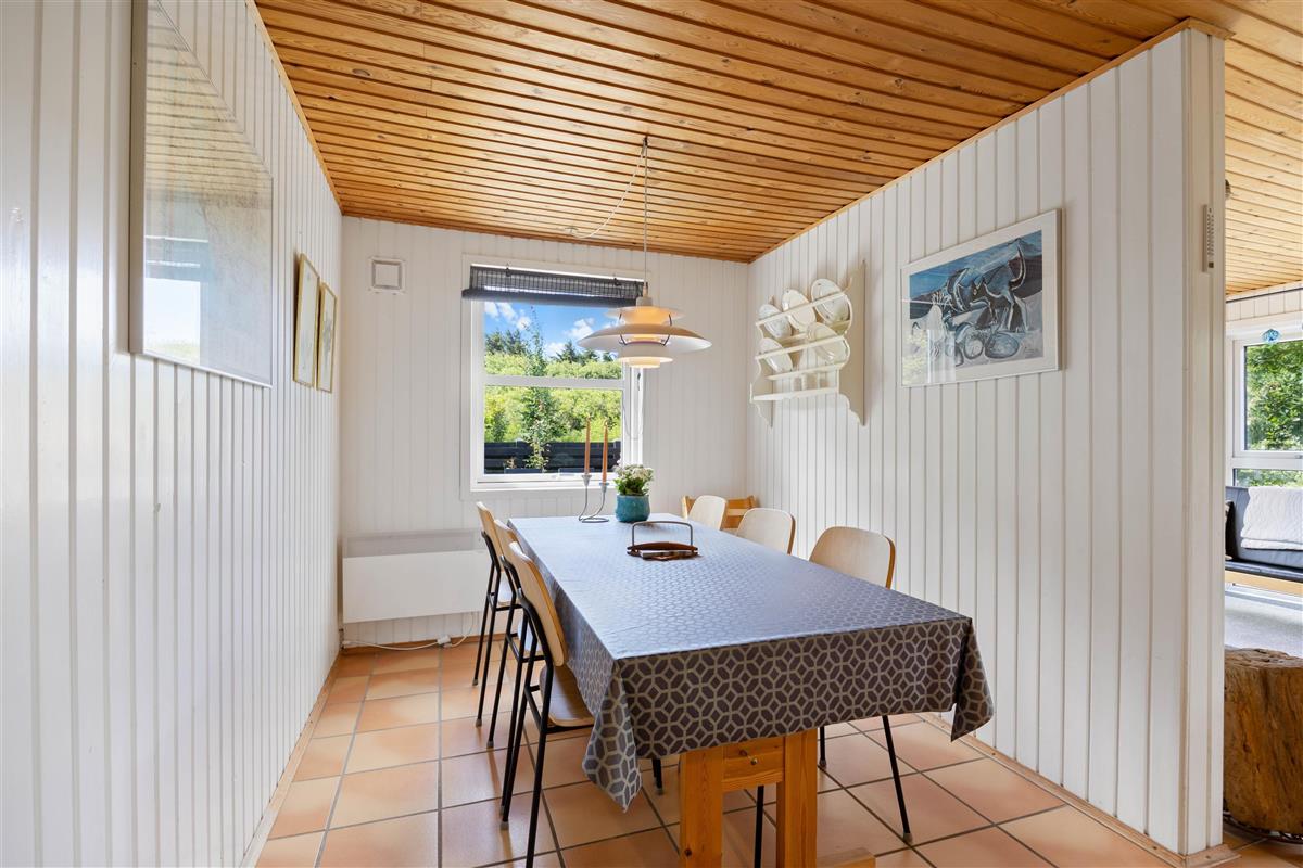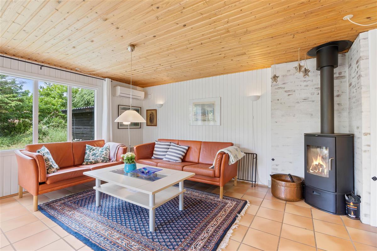 As soon as you enter this holiday home on Koglevej in Lodbjerg Hede, you'll be greeted by the cosy holiday atmosphere that the house exudes. Here you'll find all the elements you associate with a perfect holiday home: wood-panelled walls, a wood-burning stove, snug corners and comfortable furniture for relaxation.
