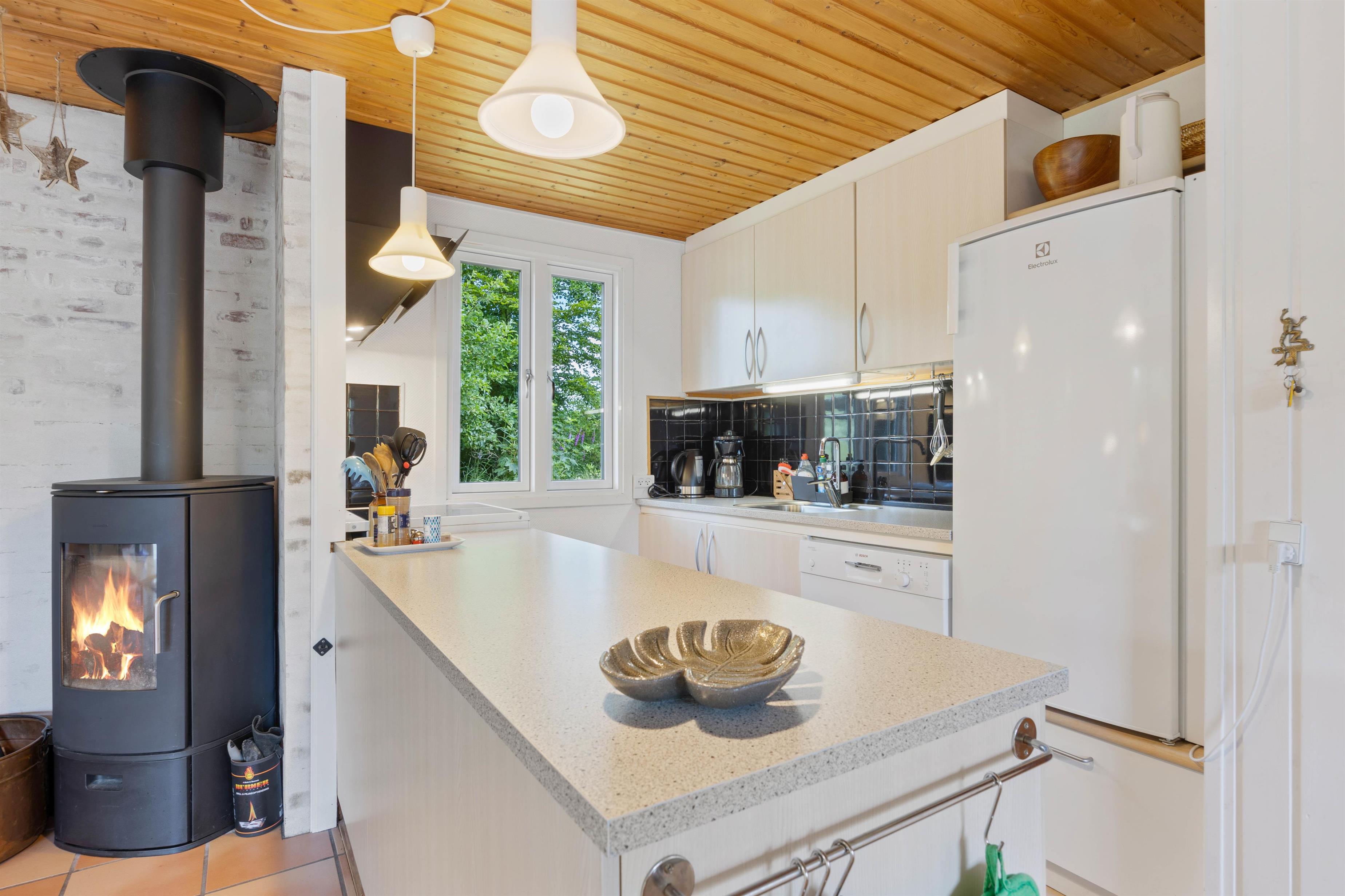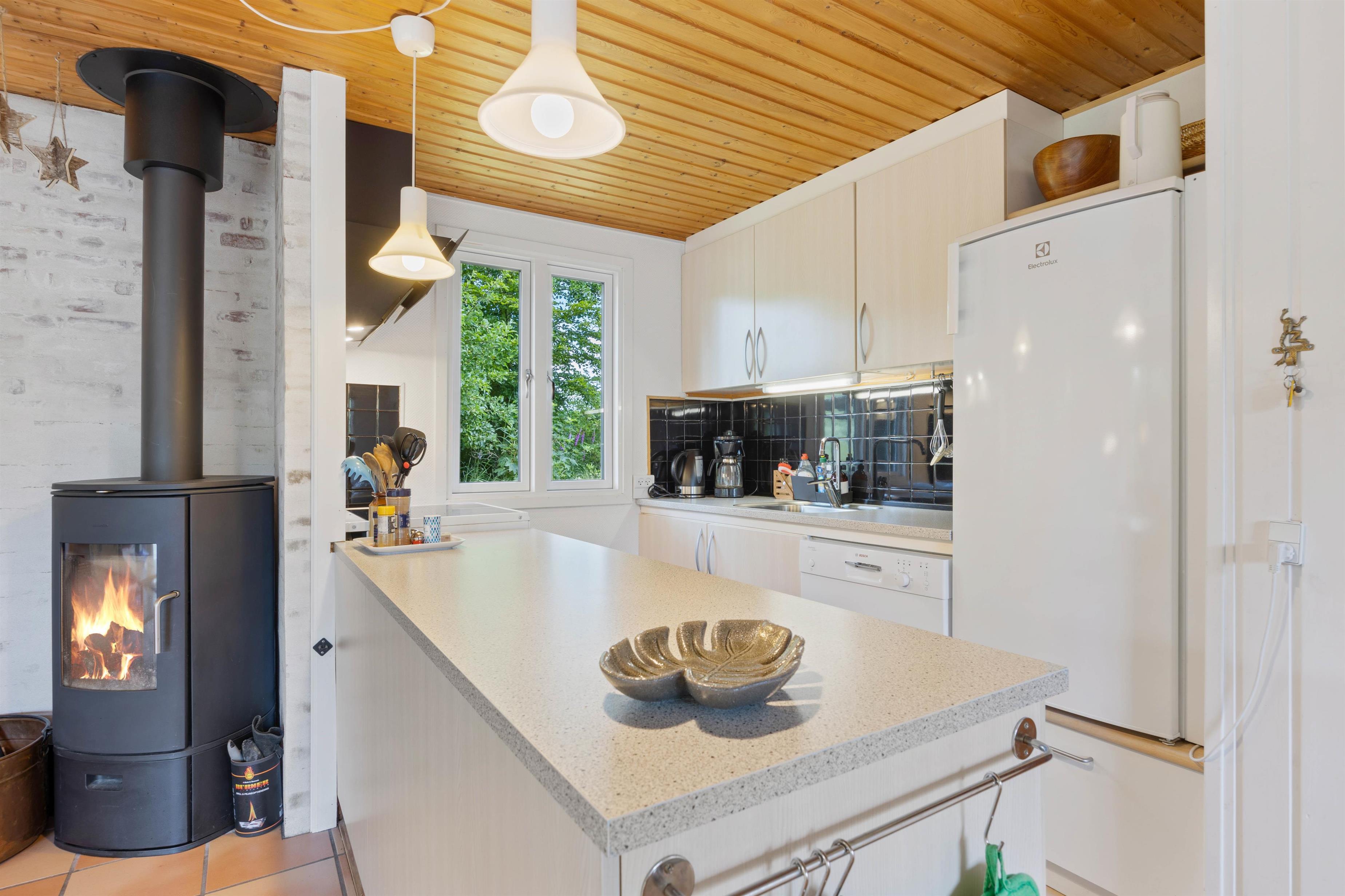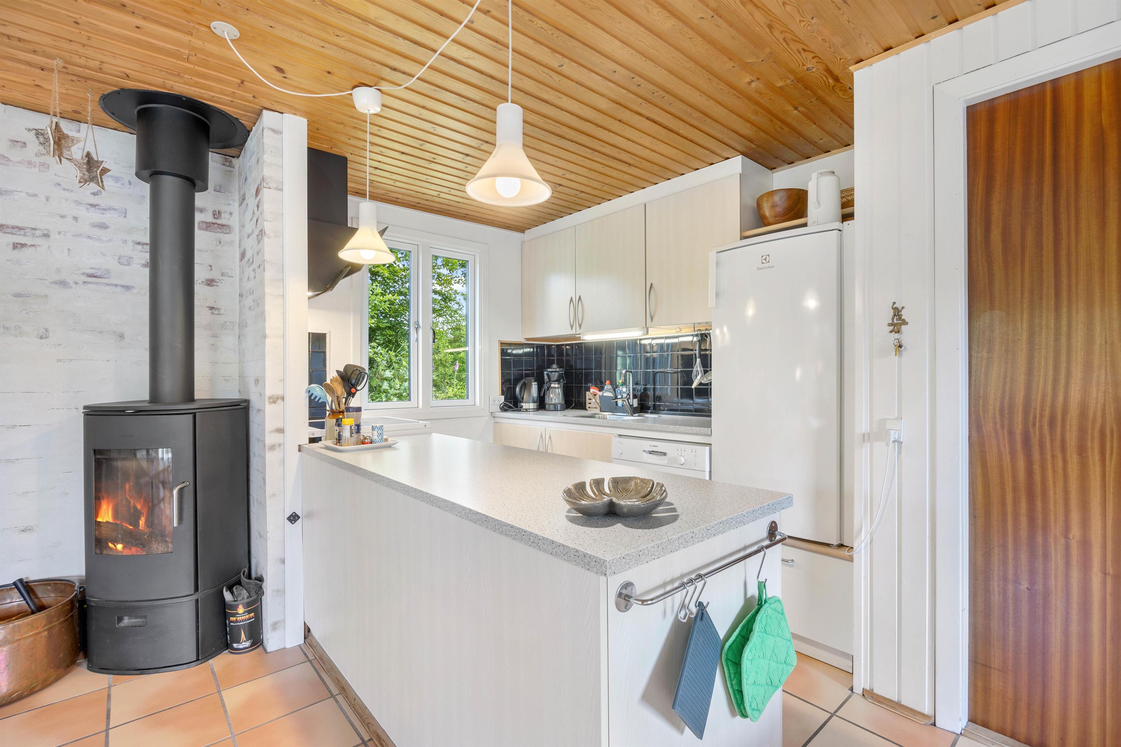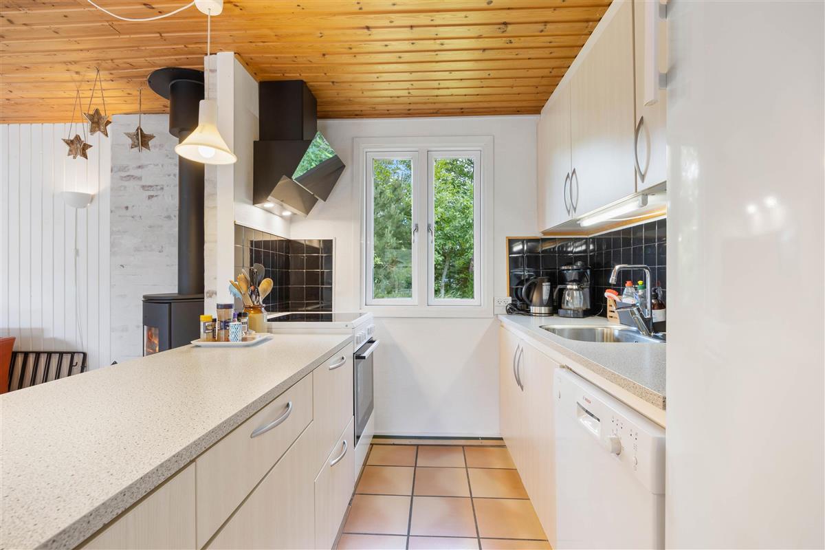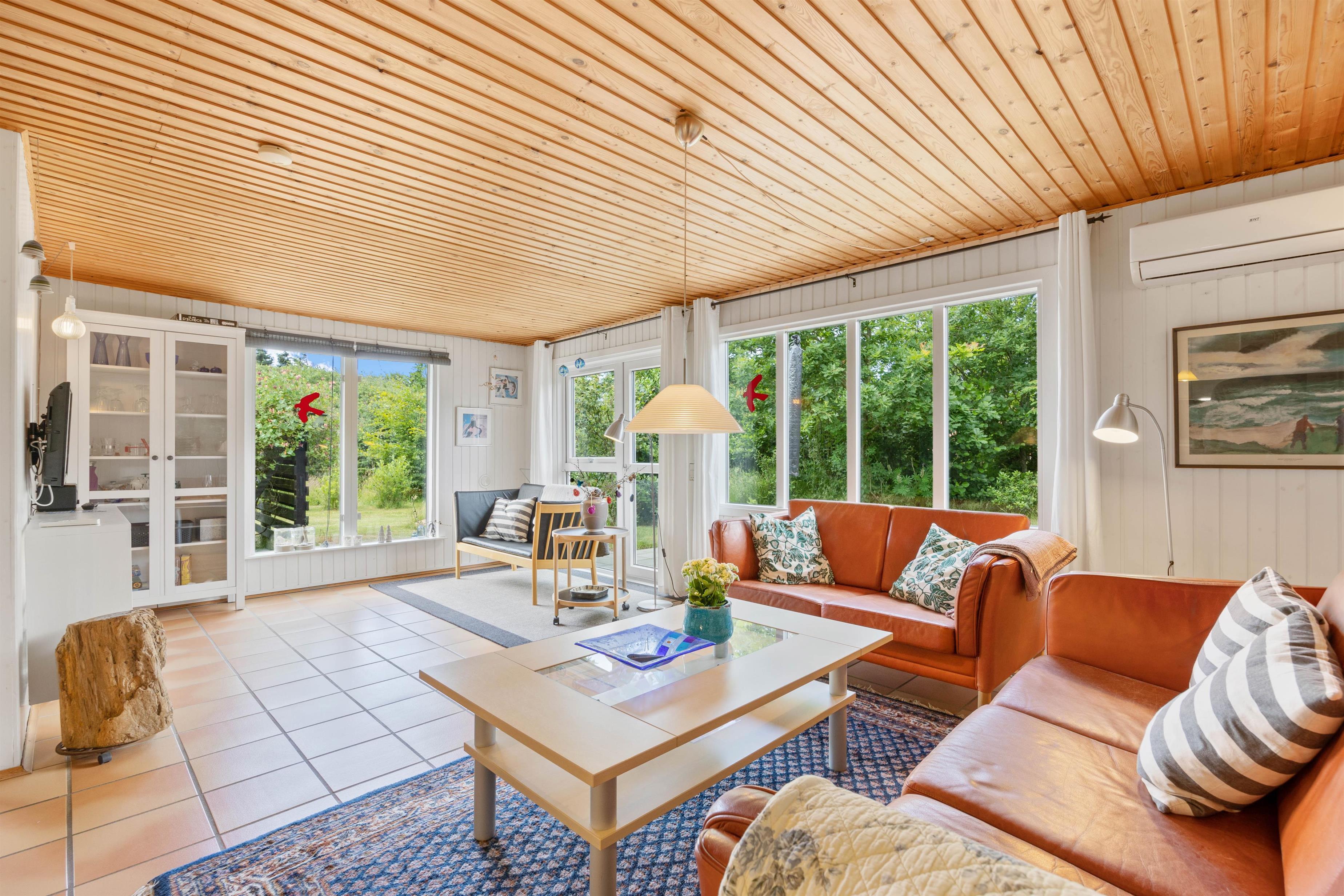 As soon as you enter this holiday home on Koglevej in Lodbjerg Hede, you'll be greeted by the cosy holiday atmosphere that the house exudes. Here you'll find all the elements you associate with a perfect holiday home: wood-panelled walls, a wood-burning stove, snug corners and comfortable furniture for relaxation.