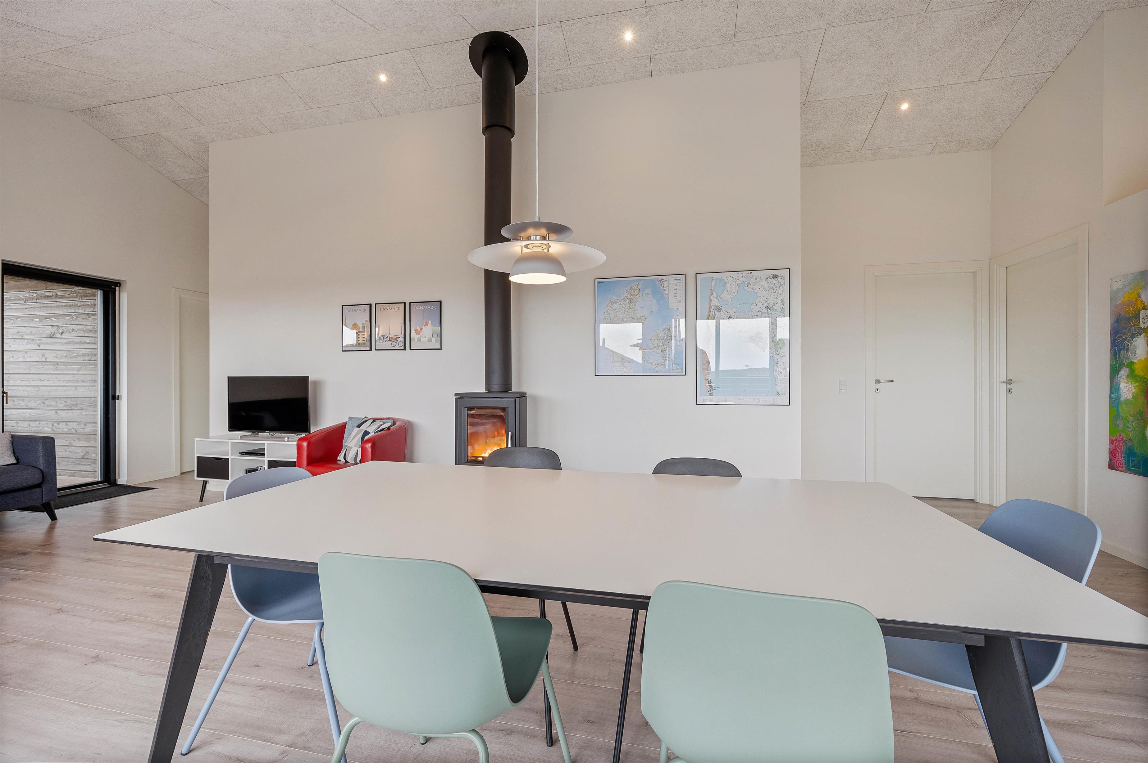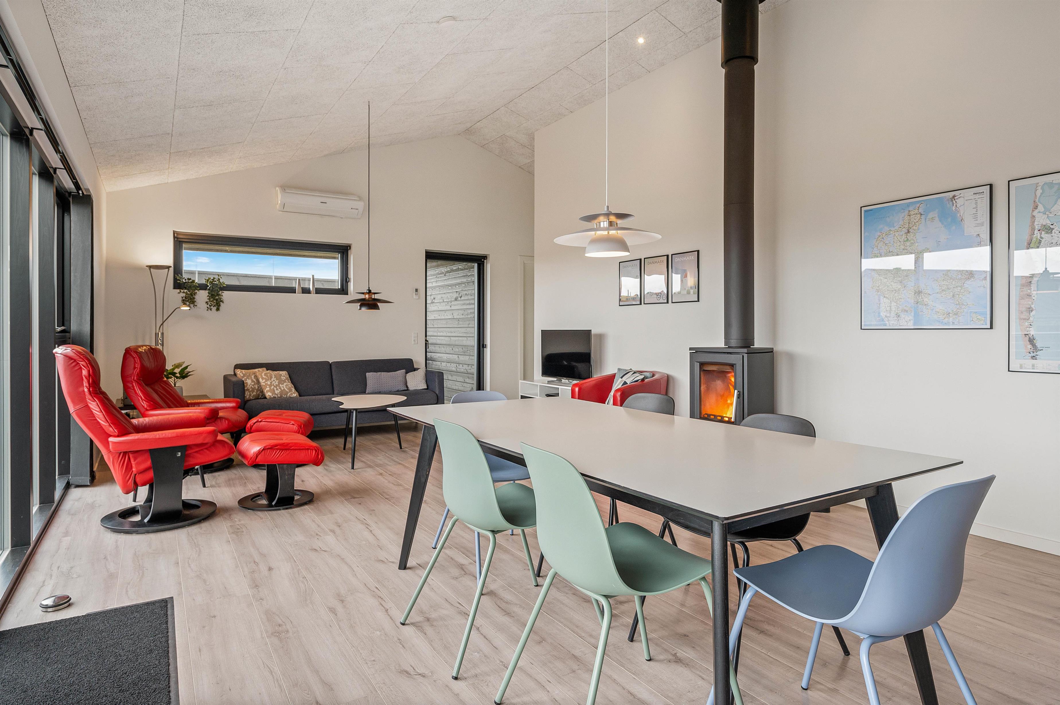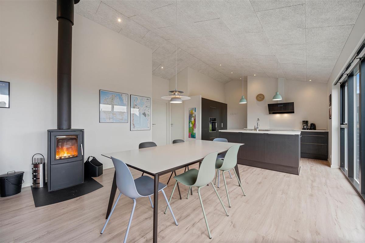 The living room, dining area and kitchen combine in an open-plan space with the stove as its centrepiece. Throughout the day and as darkness falls, the crackling flames in the wood-burning stove create a cosy holiday atmosphere.