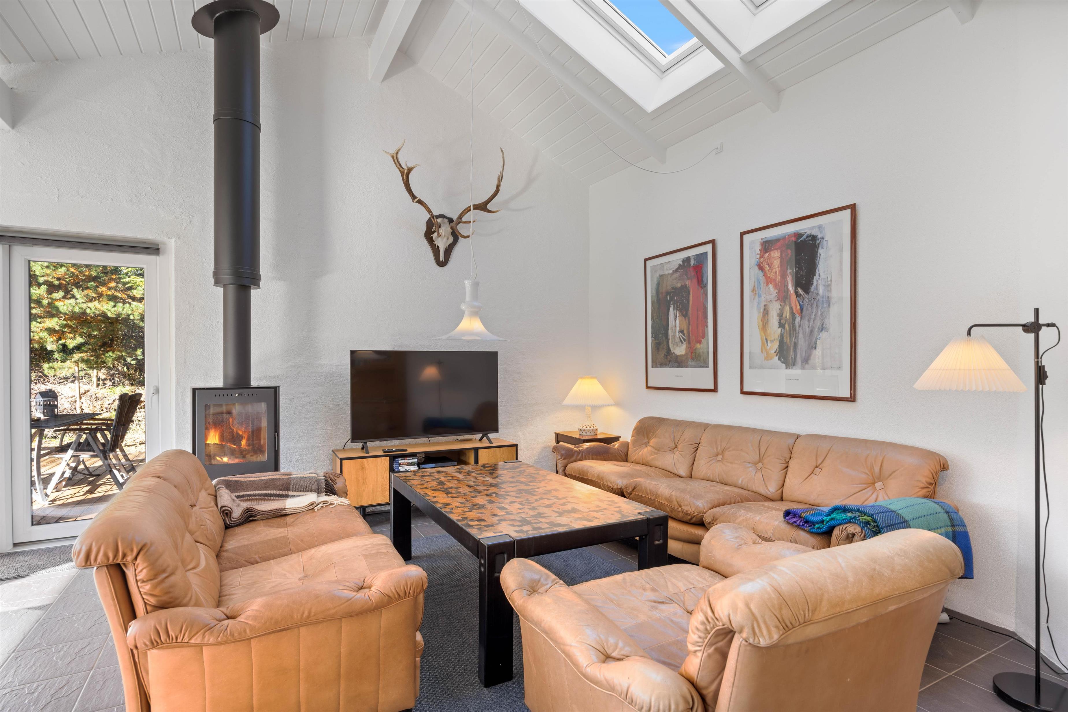 Cozy living room with wood-burning stove and entertainment
