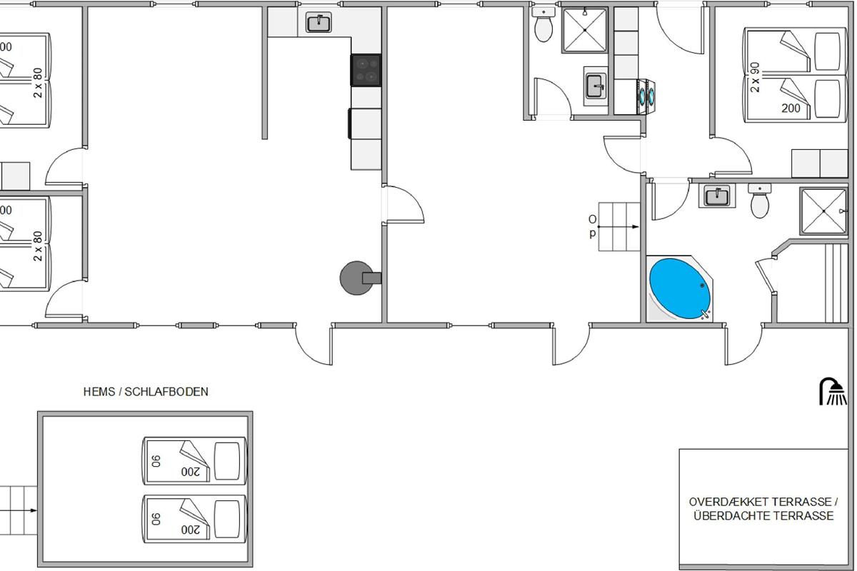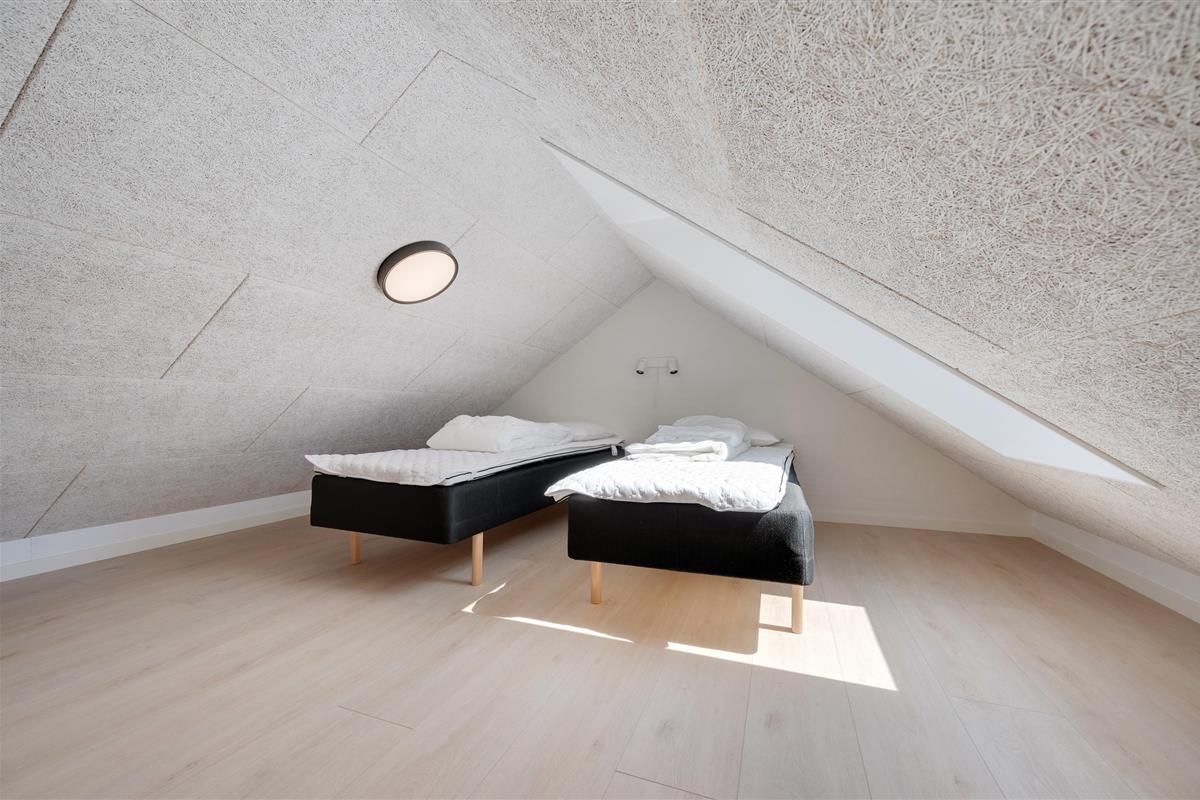 There's also a modern heat pump providing comfortable temperatures. The holiday home has three bedrooms, each with a double bed. Two additional sleeping spaces are available in the mezzanine area, particularly suitable for children who'll enjoy having their own space.