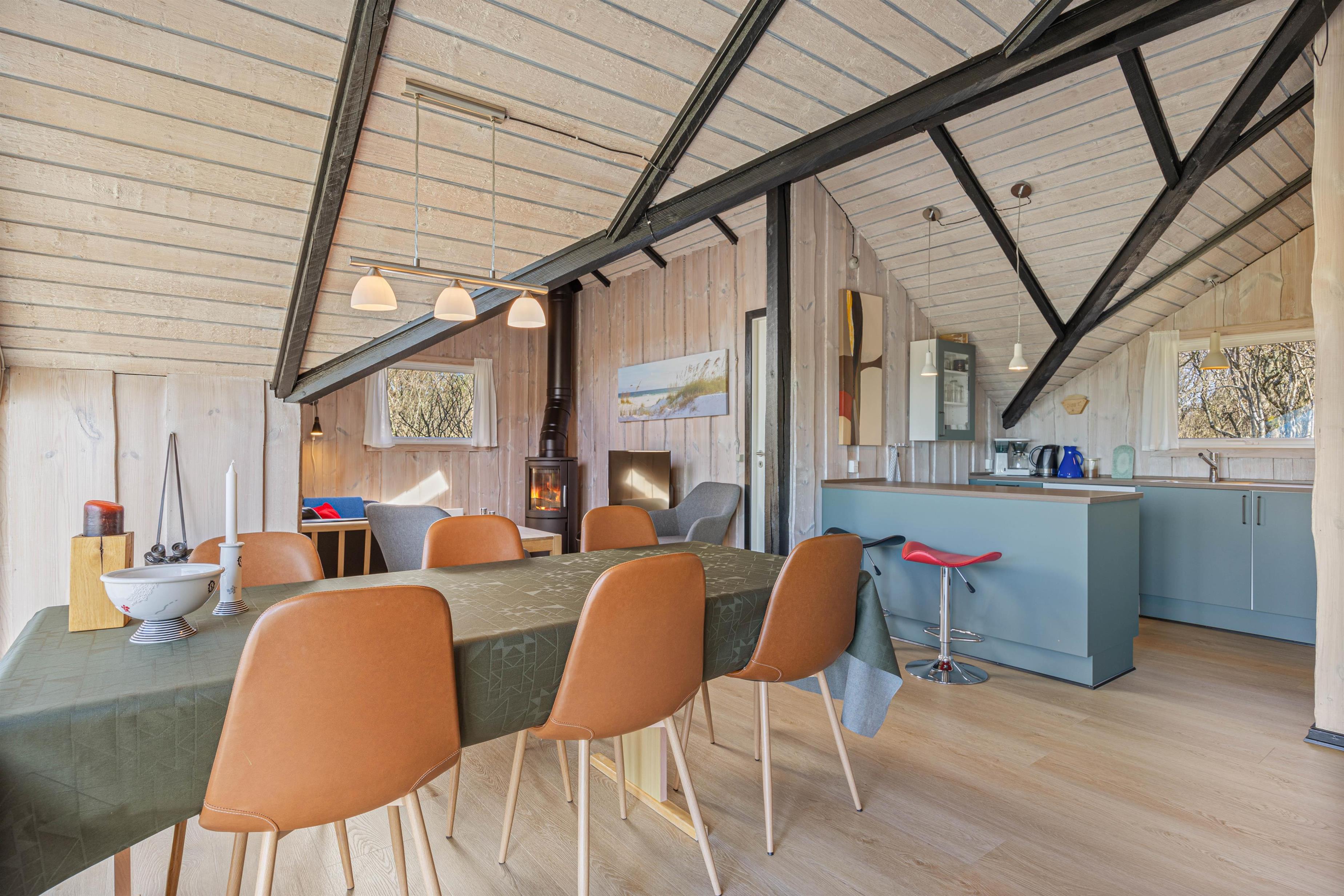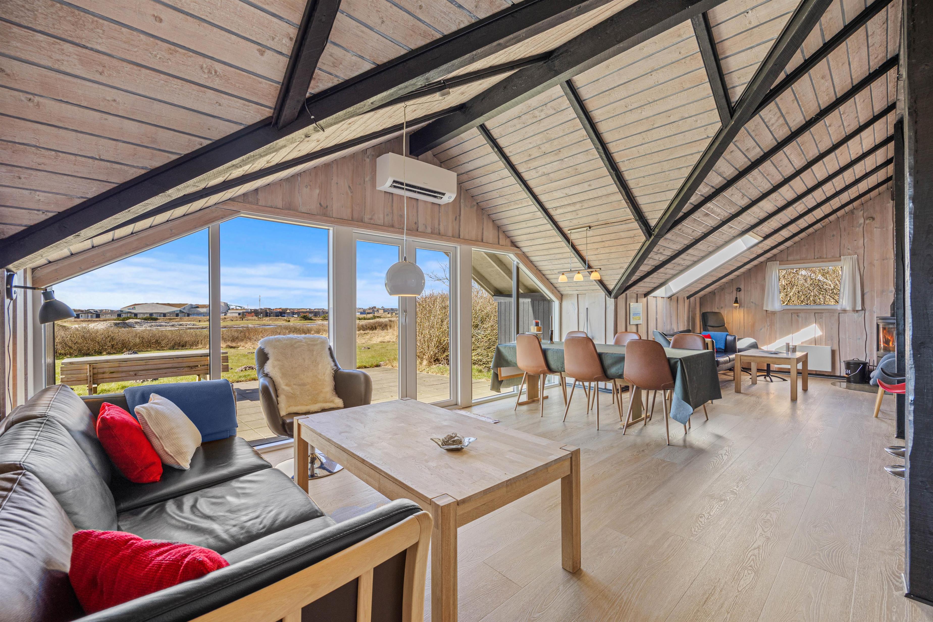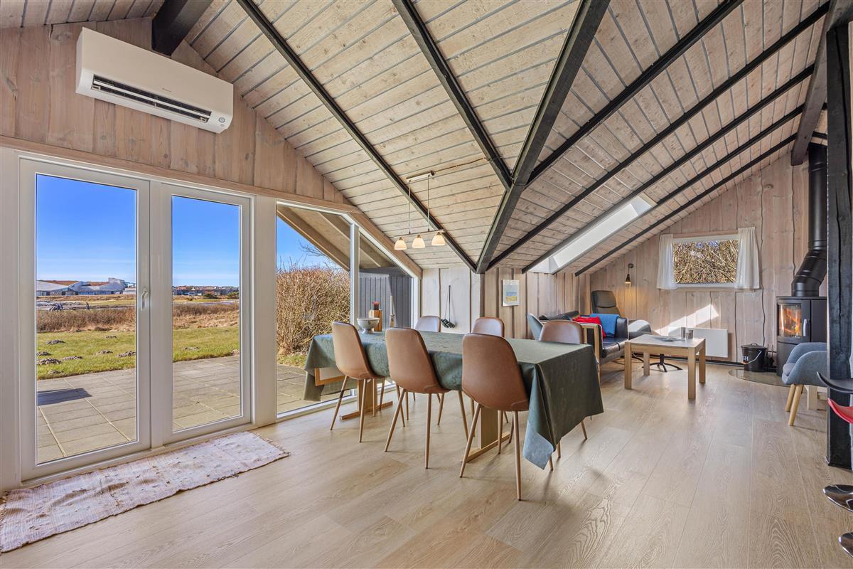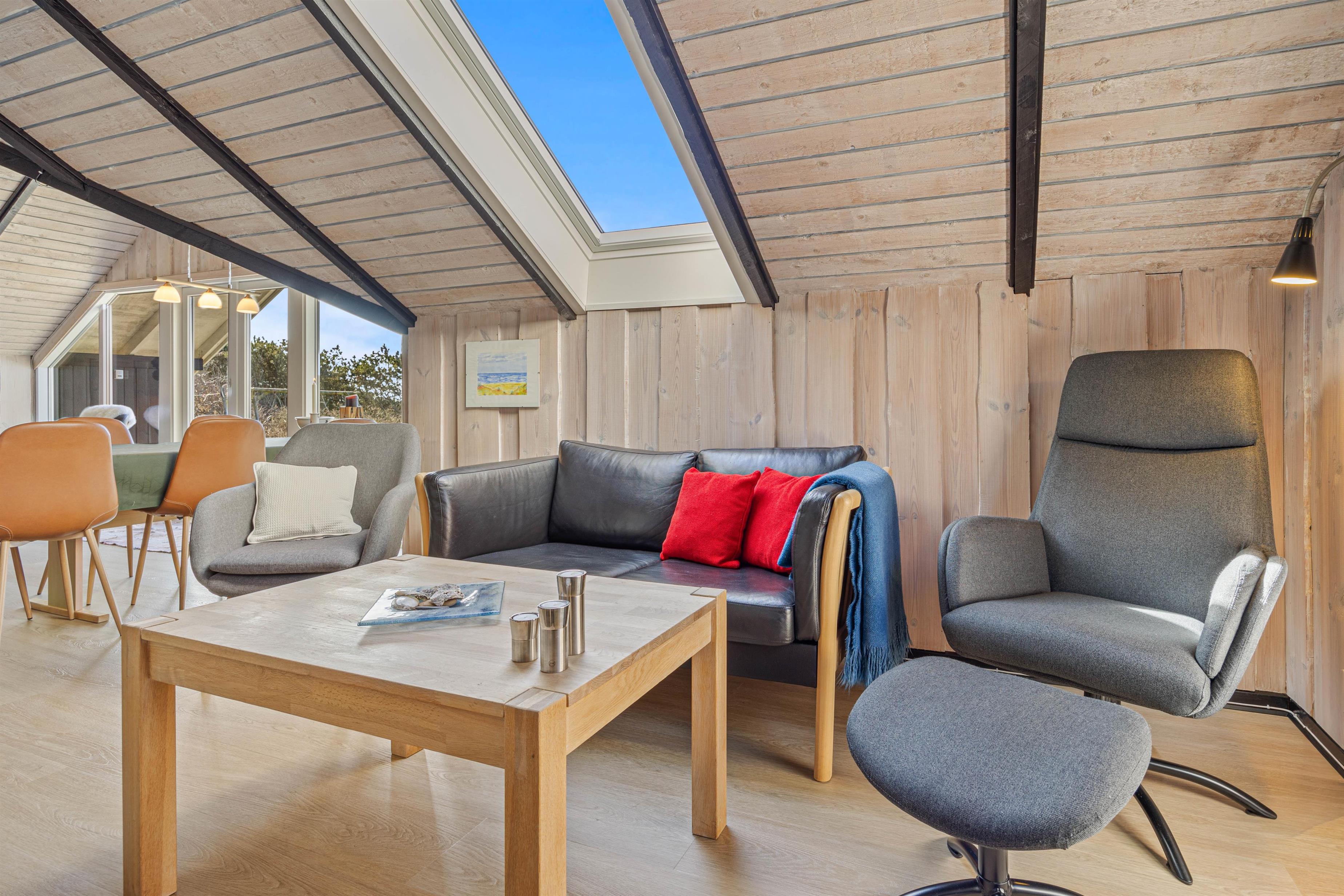 The beautiful bright wooden ceilings with exposed beams and roof windows create a special atmosphere in the holiday home. While the furnishings are modern, they maintain a relaxed holiday feel. Large windows in the living area flood the house with natural light, and you can enjoy the views while gathering for breakfast at the long dining table.