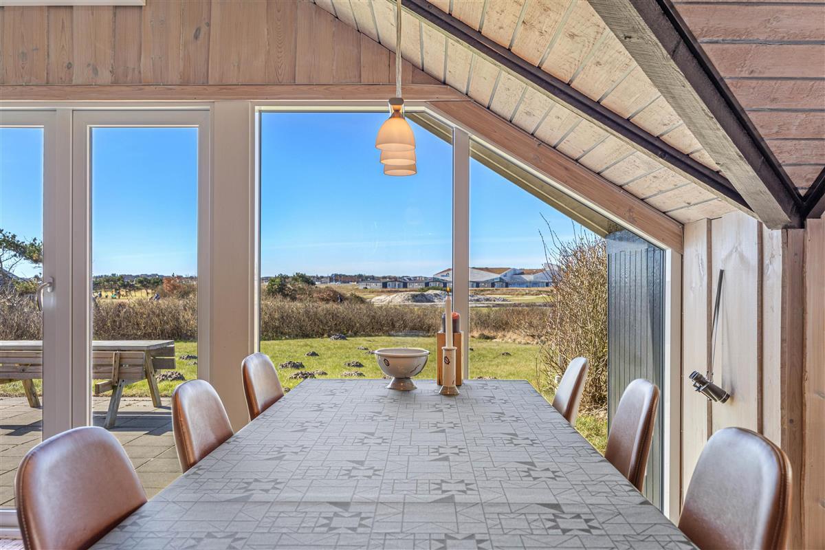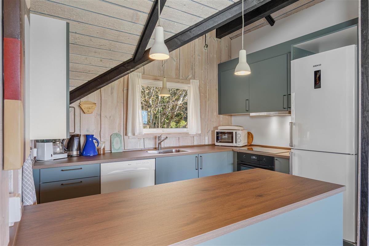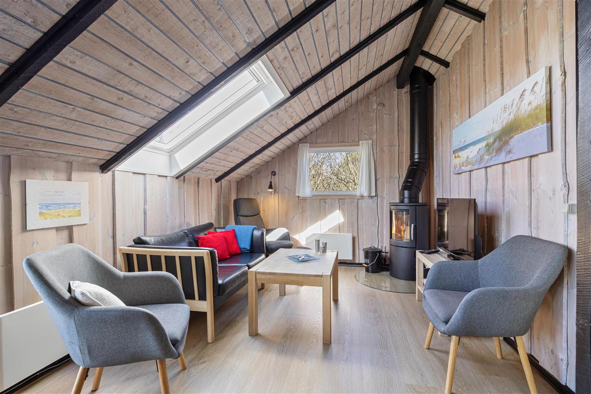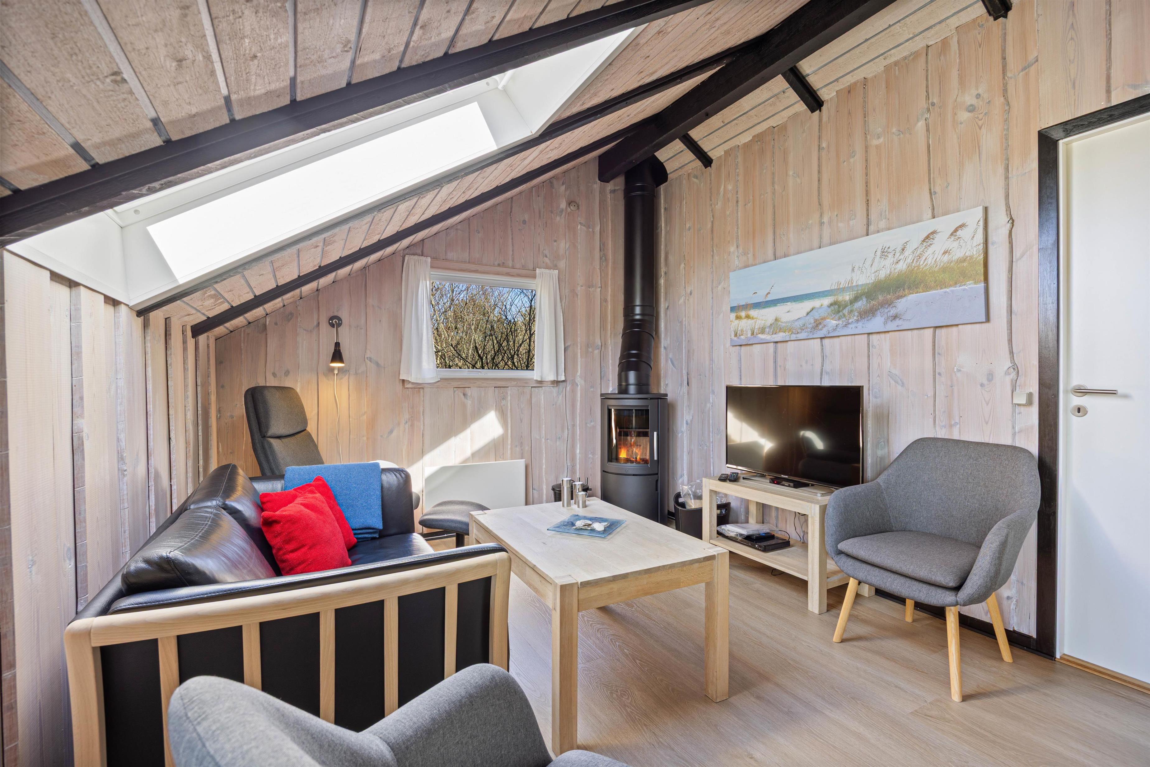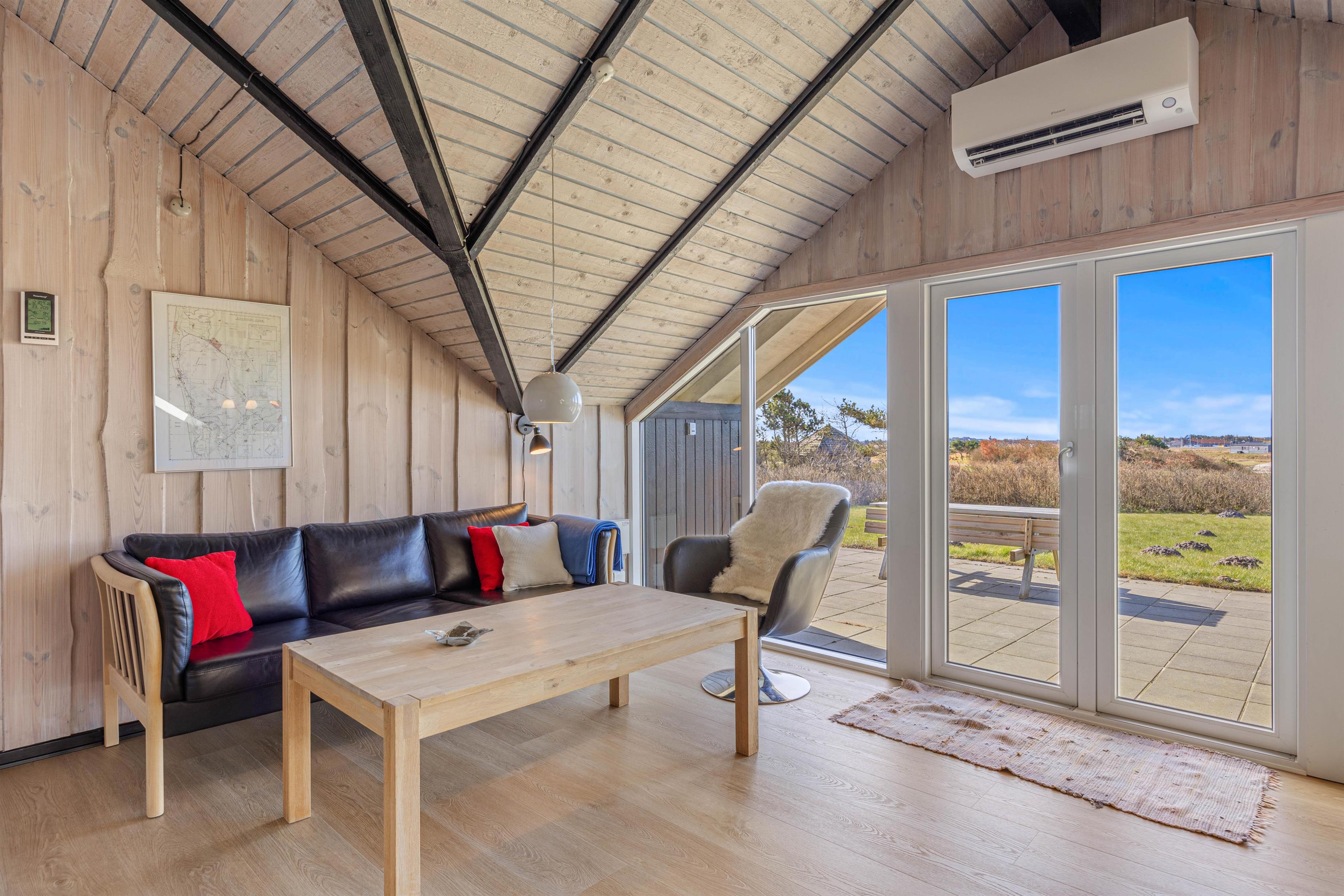 The beautiful bright wooden ceilings with exposed beams and roof windows create a special atmosphere in the holiday home. While the furnishings are modern, they maintain a relaxed holiday feel. Large windows in the living area flood the house with natural light, and you can enjoy the views while gathering for breakfast at the long dining table.
