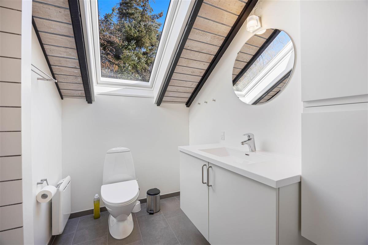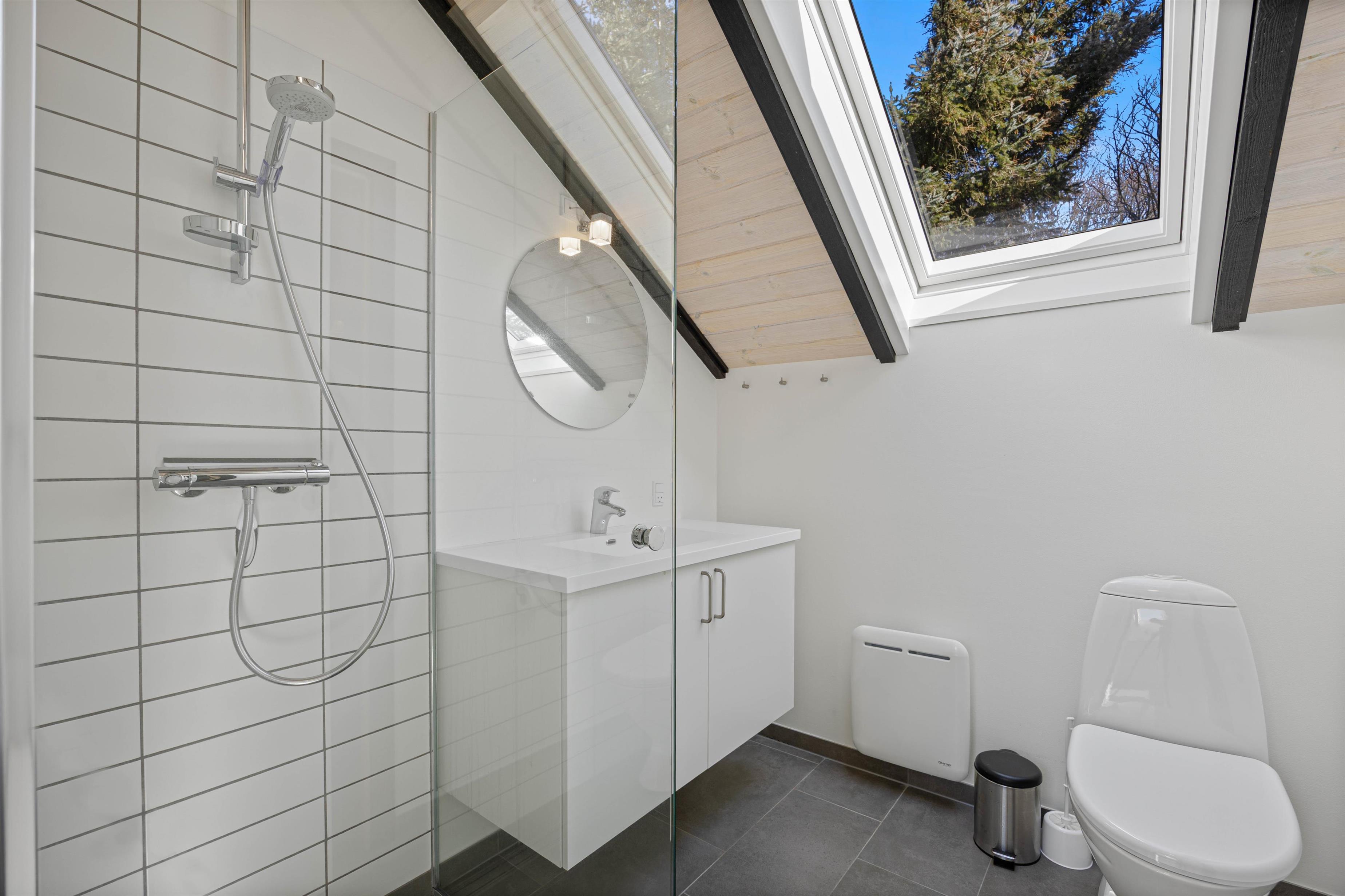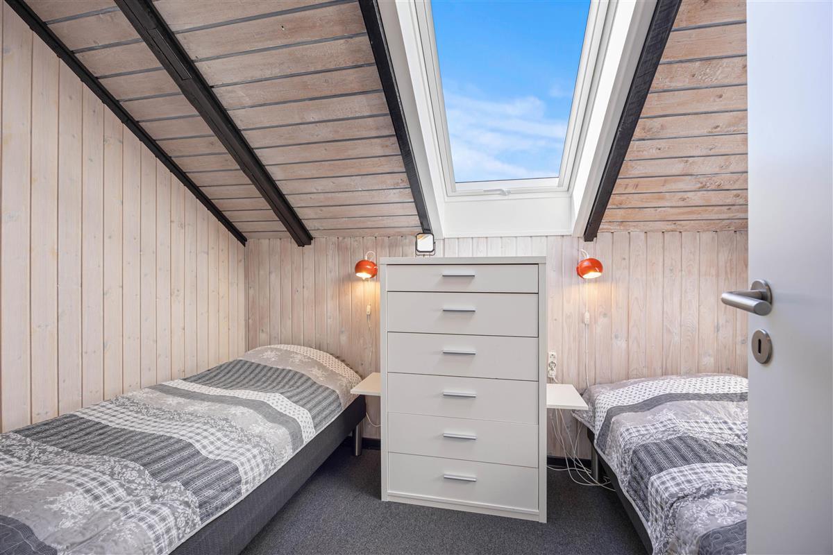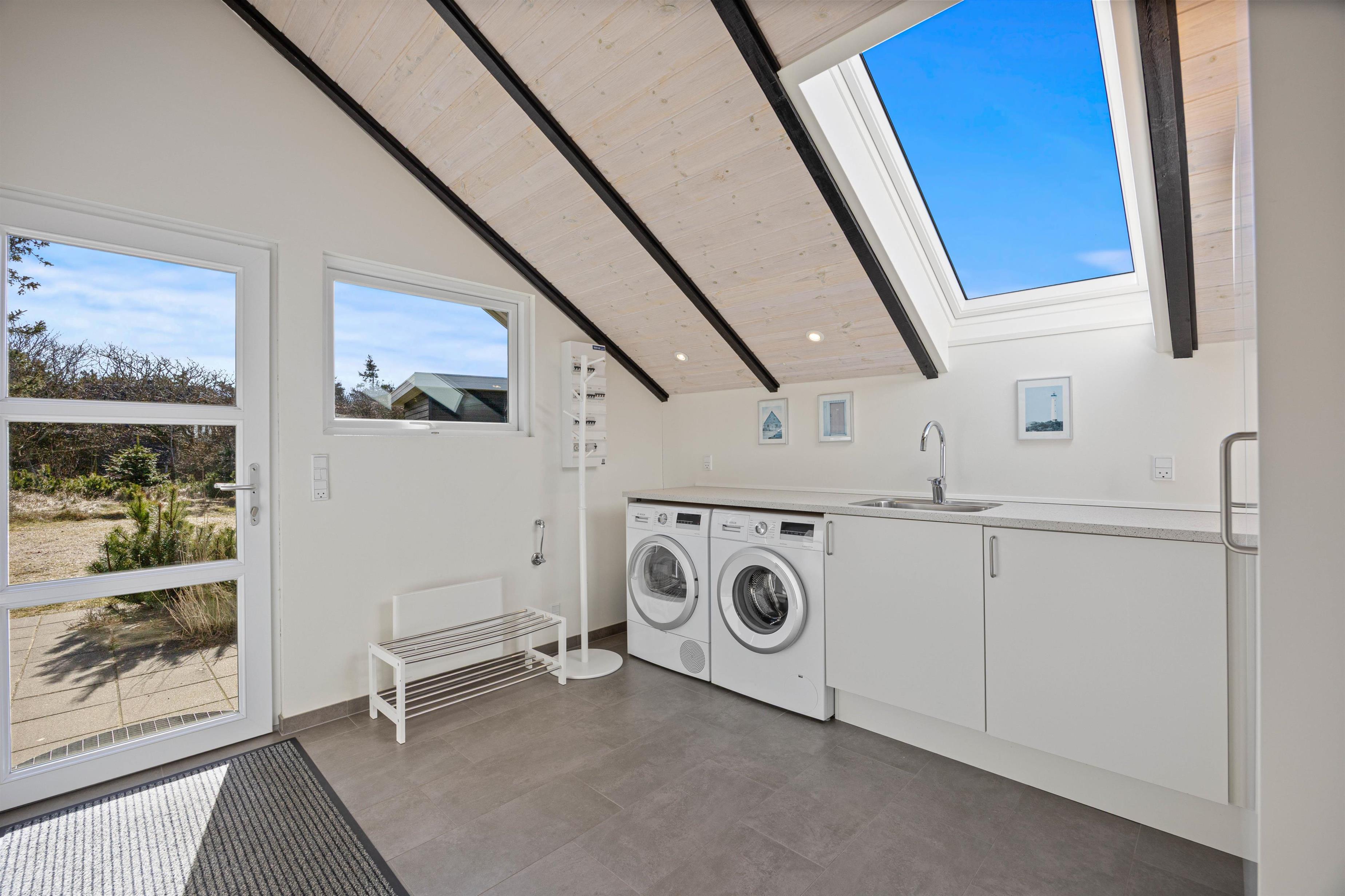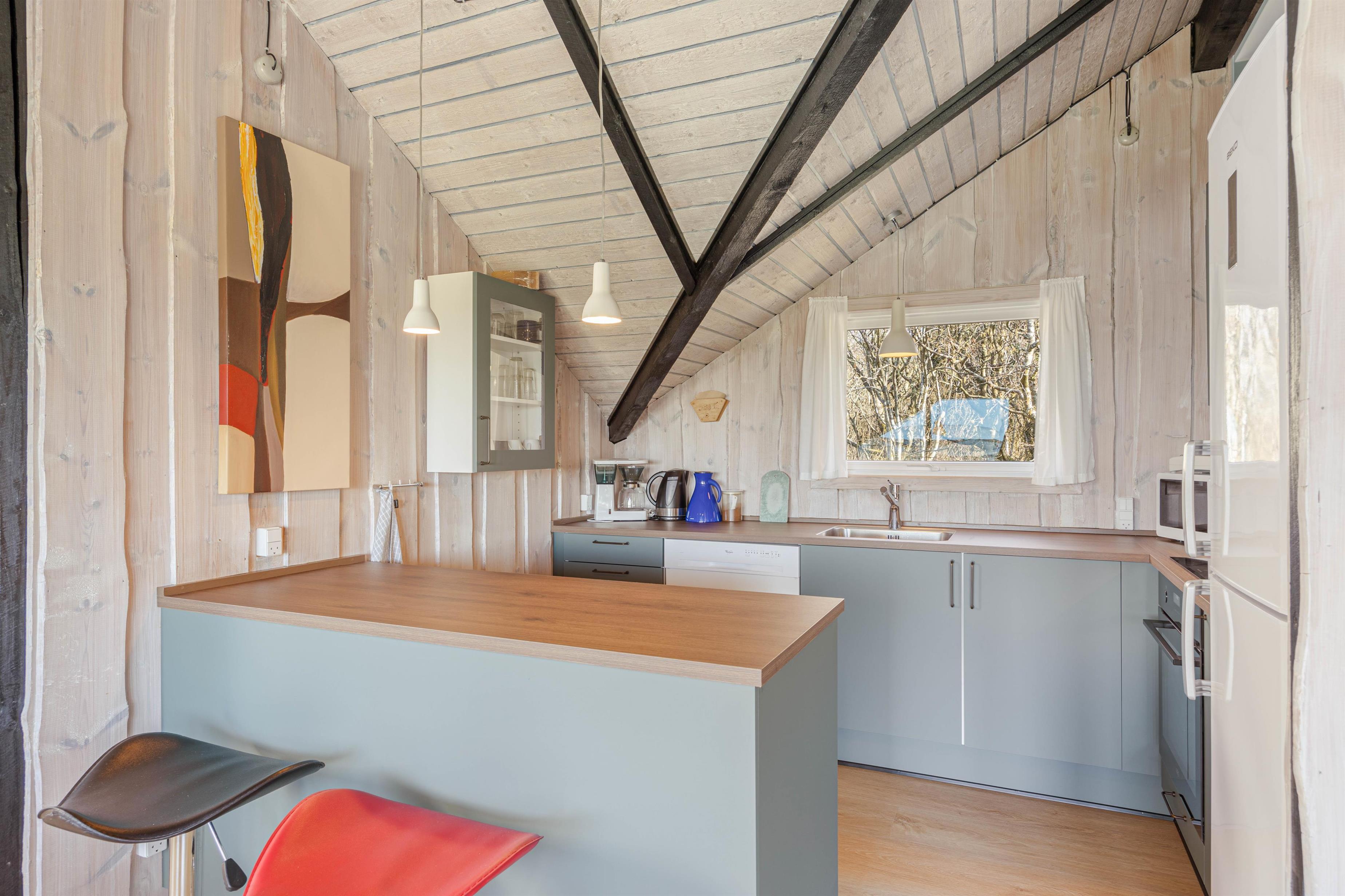 The beautiful bright wooden ceilings with exposed beams and roof windows create a special atmosphere in the holiday home. While the furnishings are modern, they maintain a relaxed holiday feel. Large windows in the living area flood the house with natural light, and you can enjoy the views while gathering for breakfast at the long dining table.