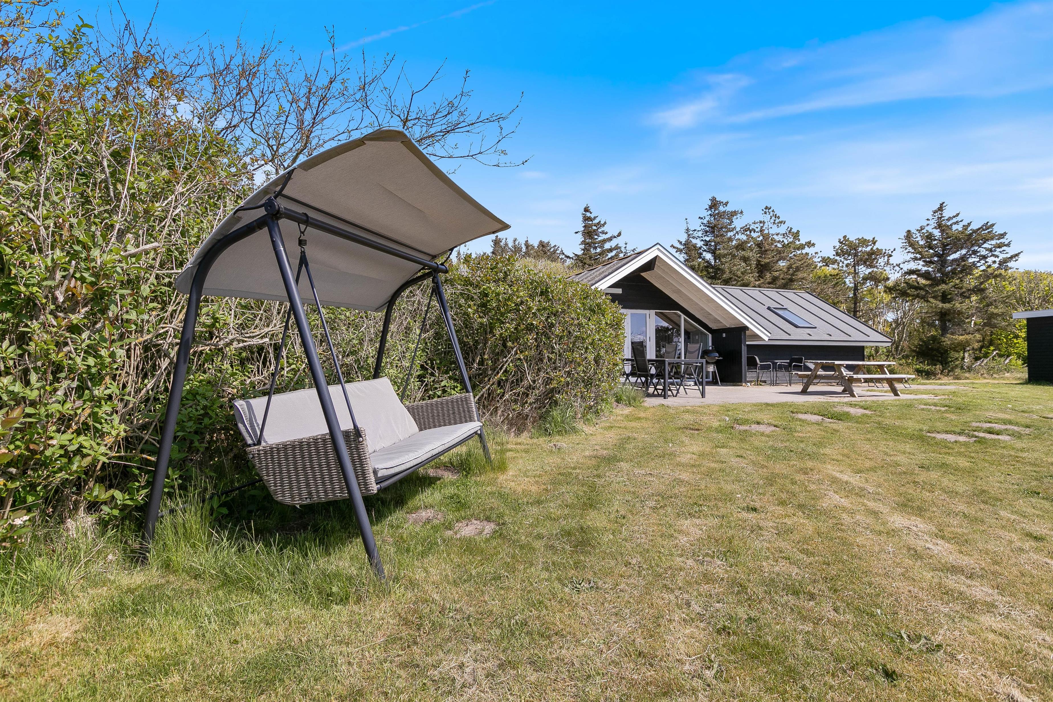 The terraces, located on two sides of the house, are ideal spots to enjoy the morning and evening sun on the garden furniture provided. On the 2,730-square-metre natural plot, you'll find a hidden seating area among the bushes. Children can explore, play on the large lawn, or enjoy the swings. For those fancying a barbecue evening, there's a grill available on the open terrace.