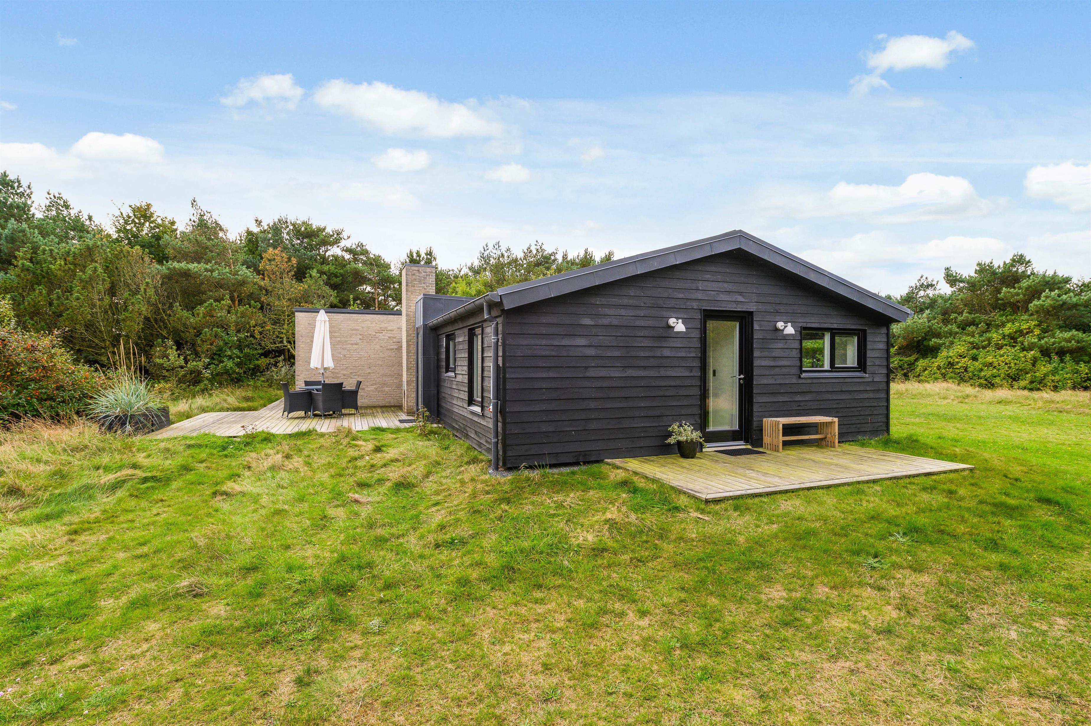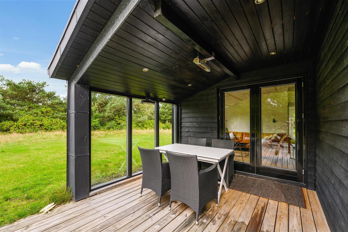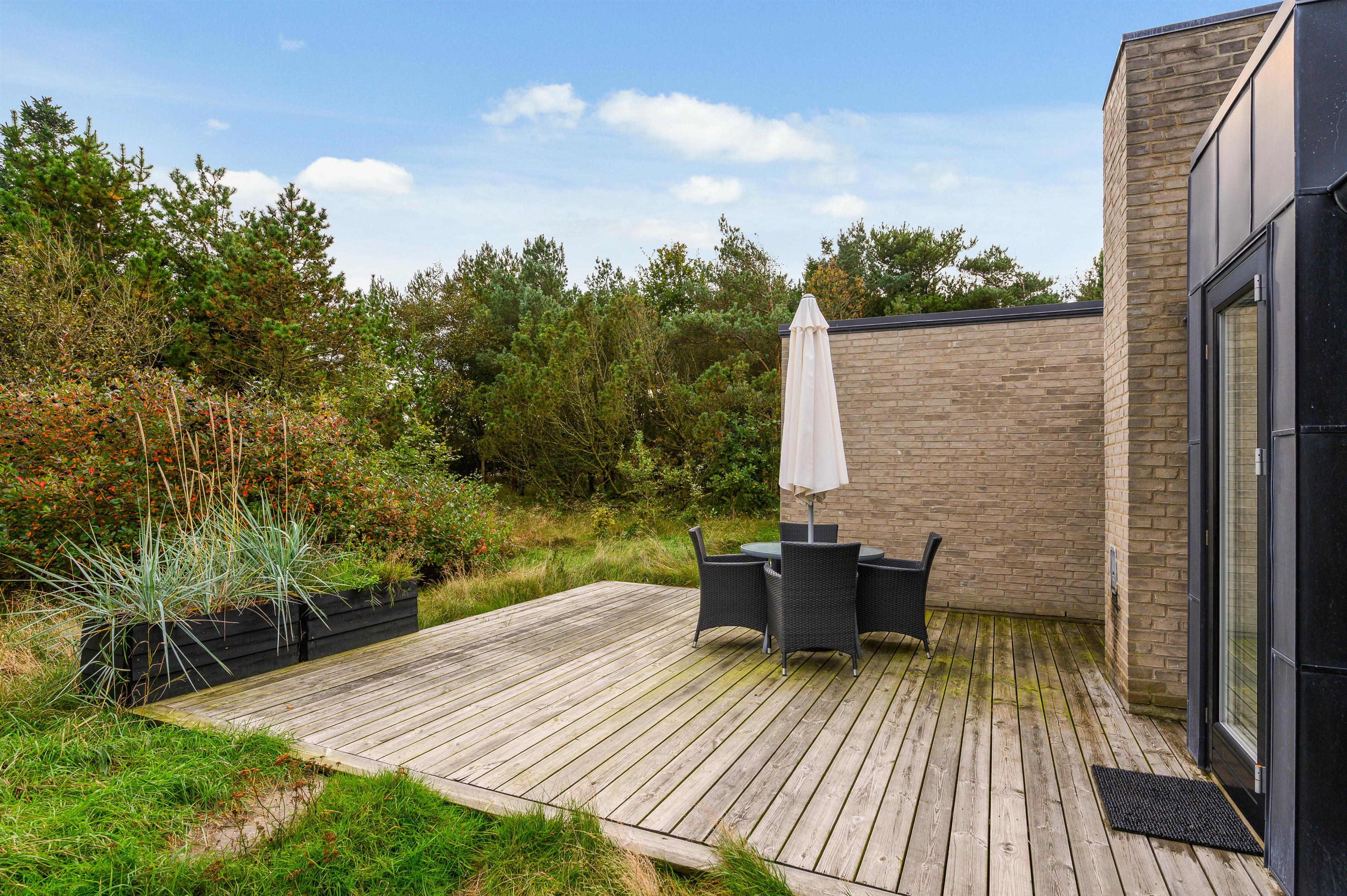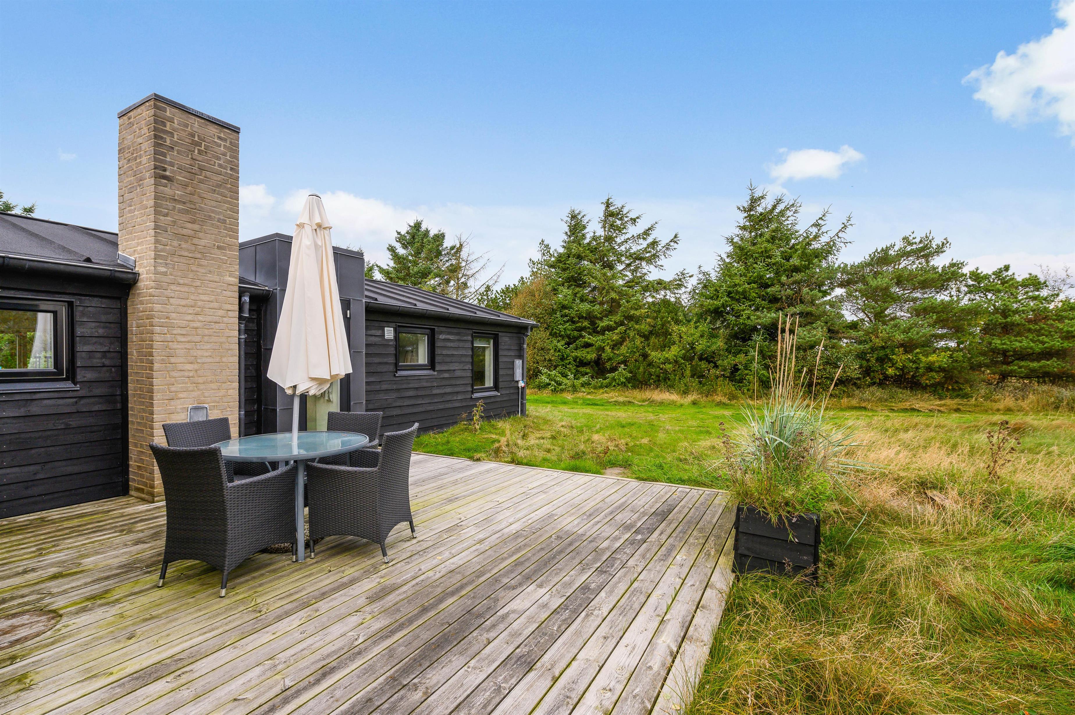 The covered and sheltered terrace offers ample protection, allowing you to enjoy your coffee outdoors even on windier days. The holiday home at Rørsangervej 15 is well-protected on all sides by tall trees and shrubs, providing several shaded spots in the garden.