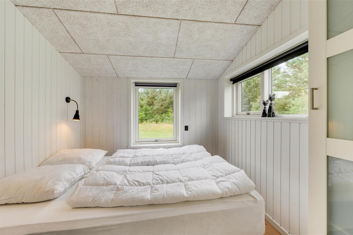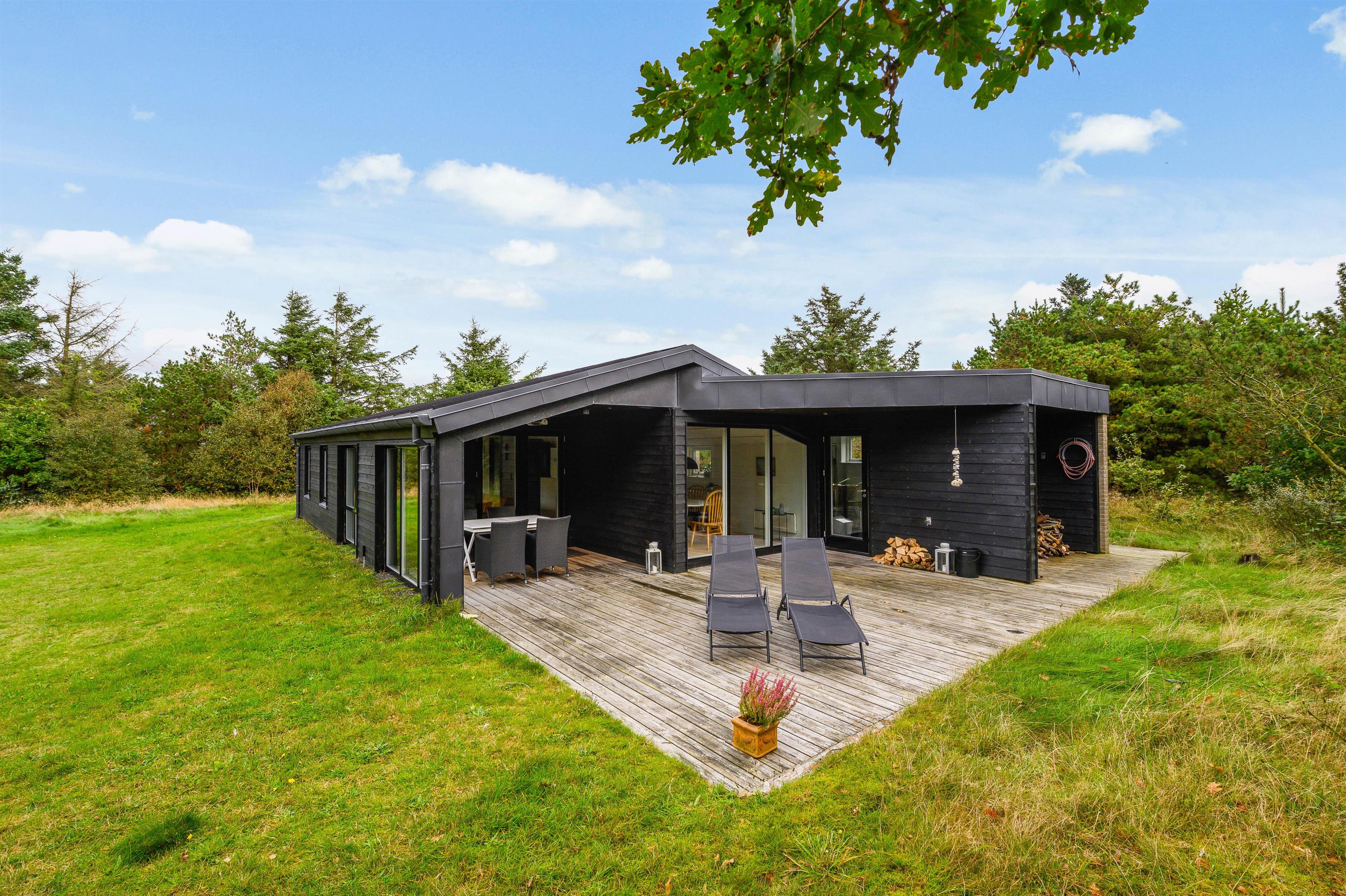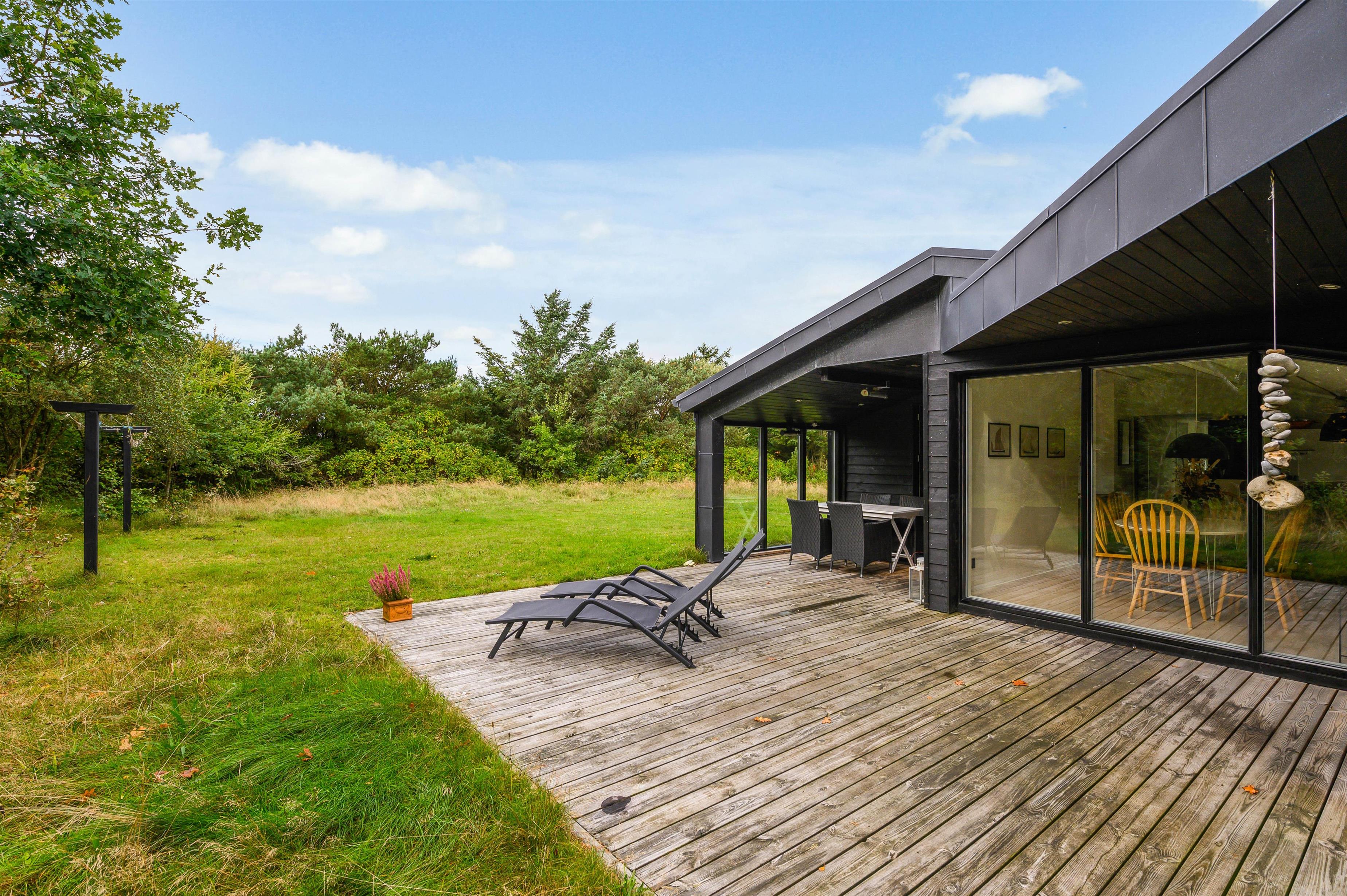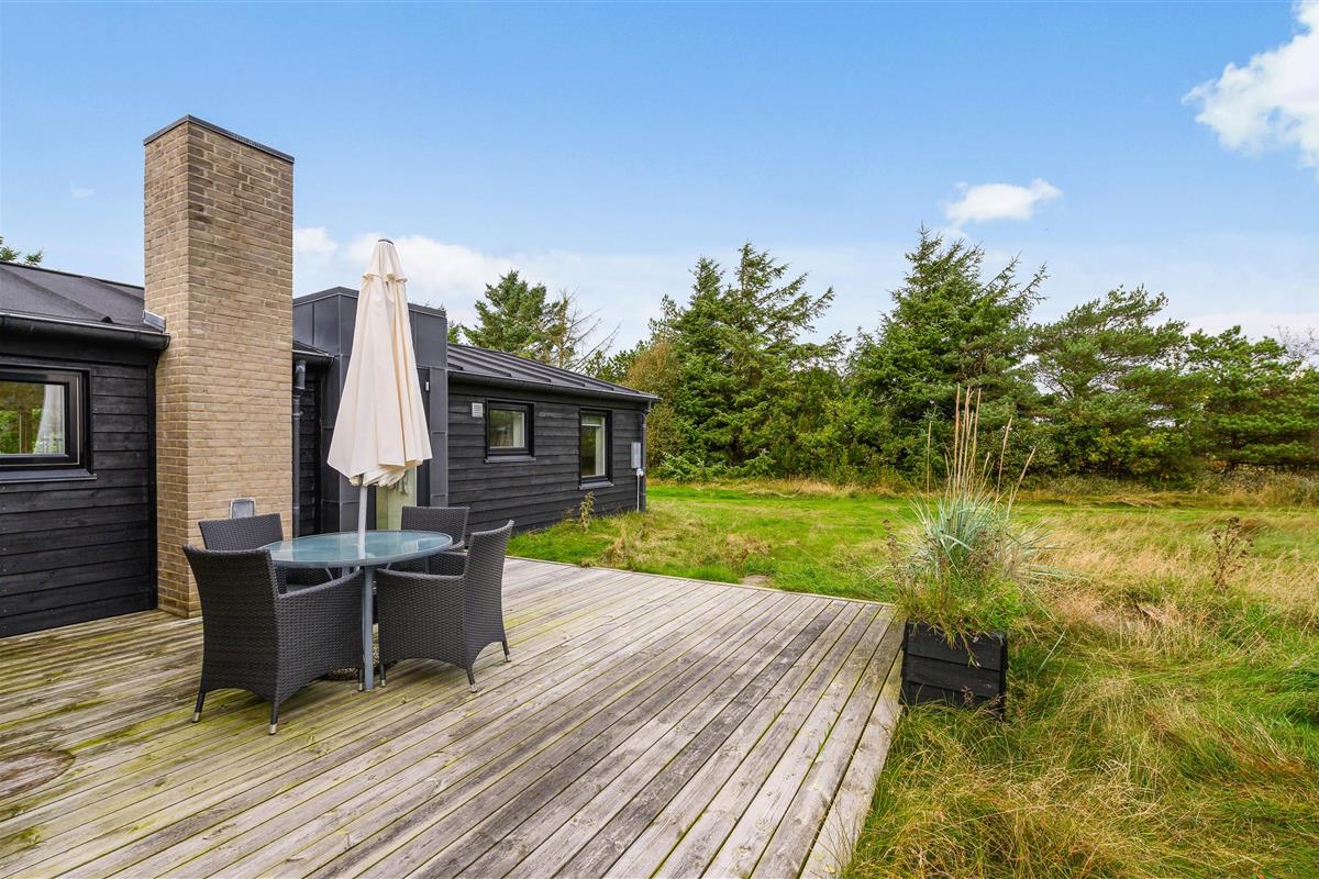 The covered and sheltered terrace offers ample protection, allowing you to enjoy your coffee outdoors even on windier days. The holiday home at Rørsangervej 15 is well-protected on all sides by tall trees and shrubs, providing several shaded spots in the garden.