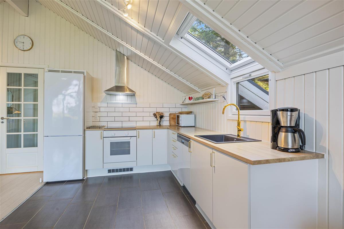 At the heart of this cosy holiday home is an open-plan living space with kitchen, offering beautiful views of the greenery from the dining area. The appealing décor features charming details throughout each room, creating an instant welcoming atmosphere. Position the reading chair in front of the wood-burning stove and relax with a warm cup of cocoa while enjoying music through the Bluetooth docking station. The energy-efficient heat pump in the living area ensures comfortable warmth on cooler days.