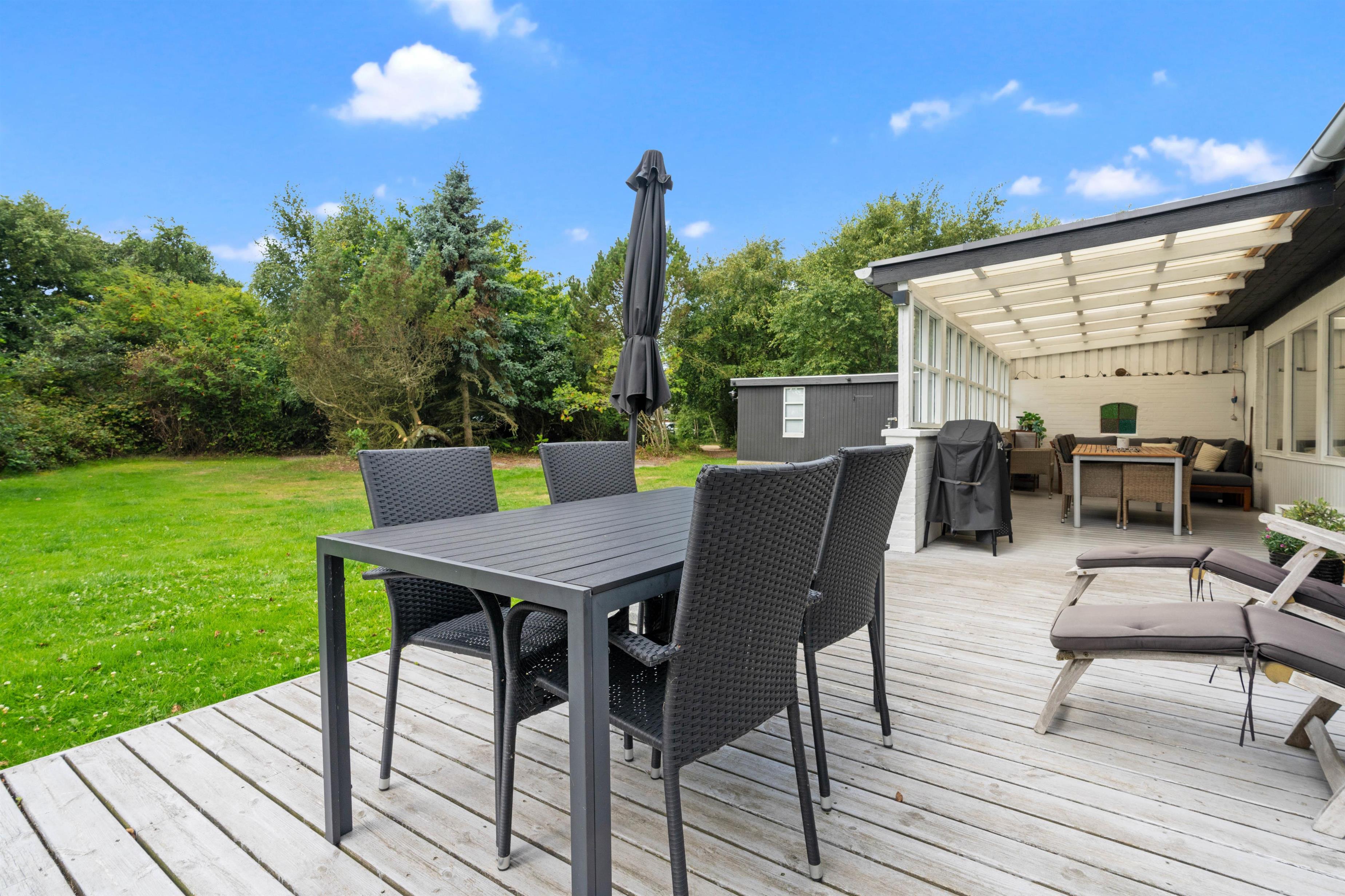 The beautifully landscaped 2,300-square-metre plot provides plenty of space for children and dogs to play. Whether it's football or badminton, fun is guaranteed. The terrace area is generously sized and leaves nothing to be desired. Thanks to the covered section and excellent wind protection, you can enjoy long, cosy evenings outdoors. Fire up the barbecue and enjoy a glass of wine, or soak up the sun - when it gets too warm, relax in the shade under the covered area.