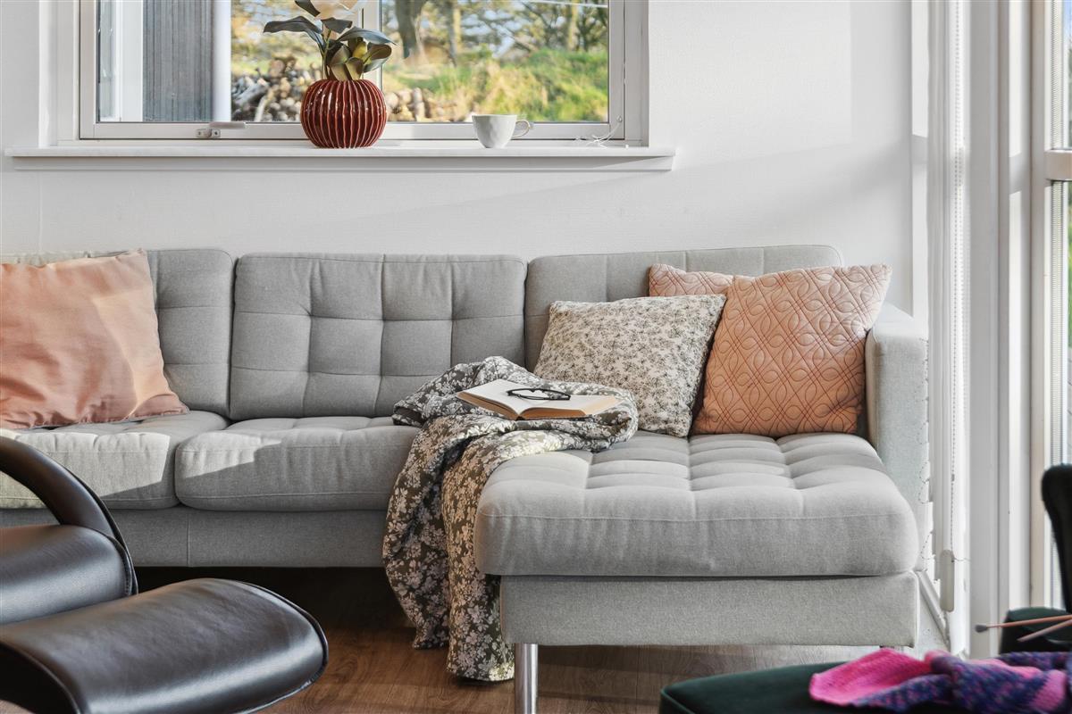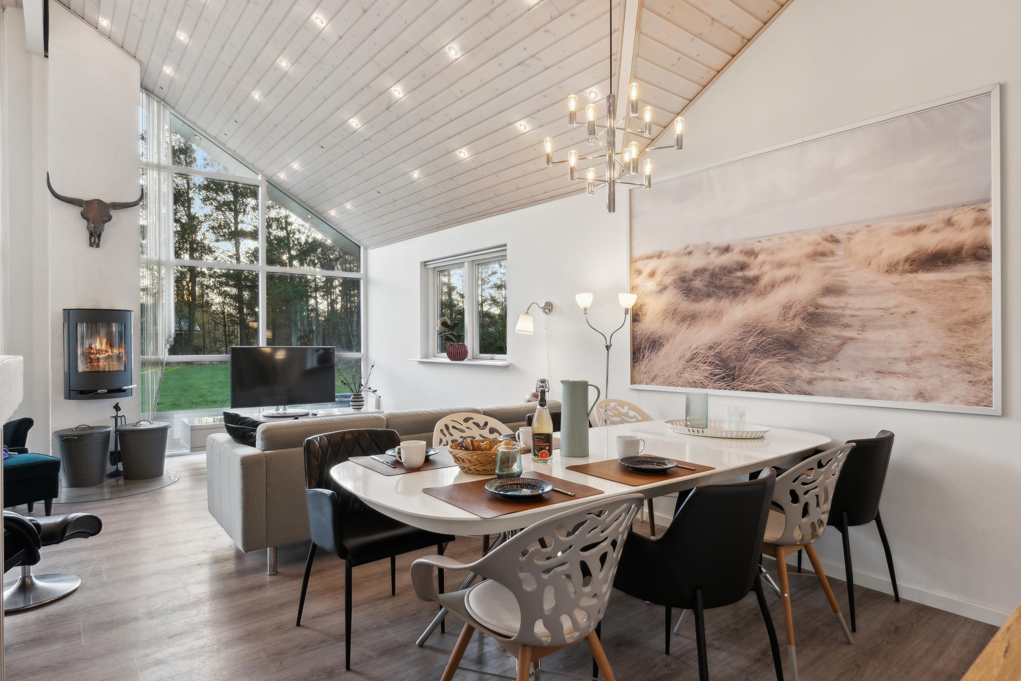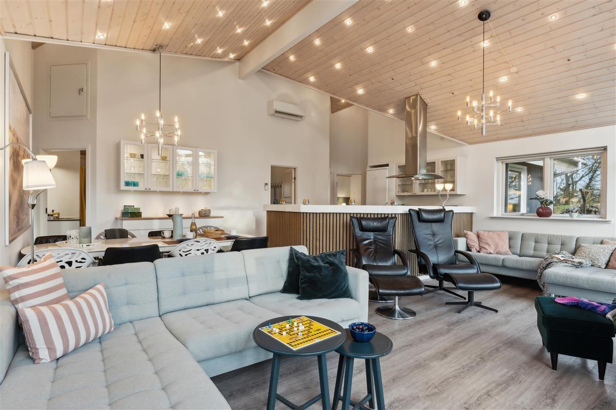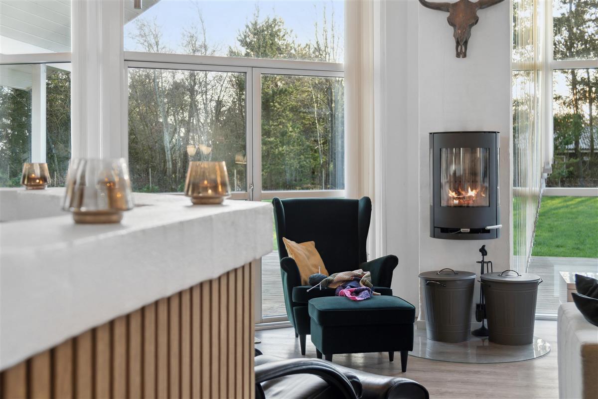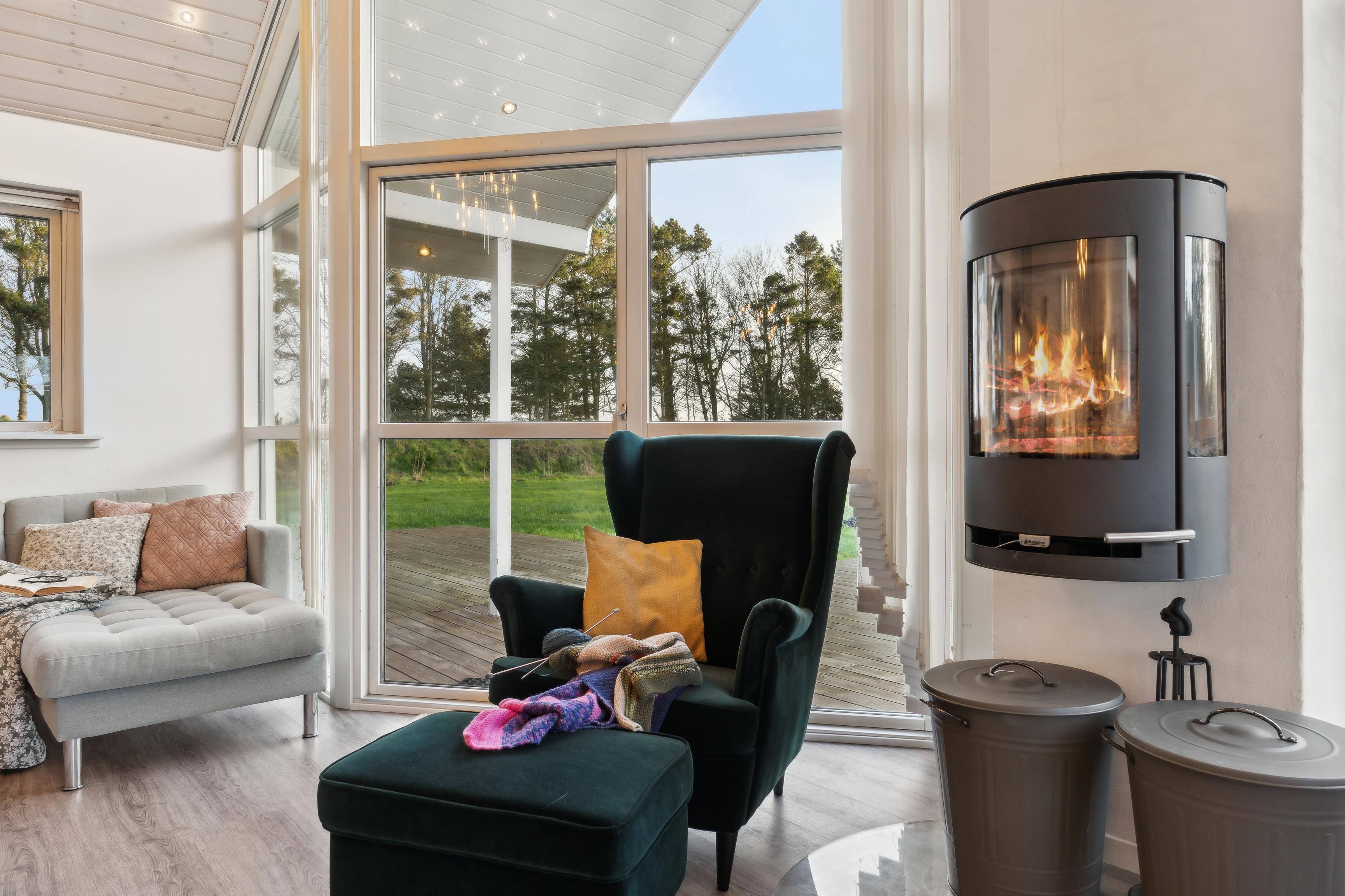 The heart of the house is the open and bright living area, where daylight dances across the tasteful furnishings, creating an inviting atmosphere. The crackling wood-burning stove is like a living painting of warmth and coziness, enjoyed from the dining area, the soft sofas, and the open conversation-friendly kitchen.