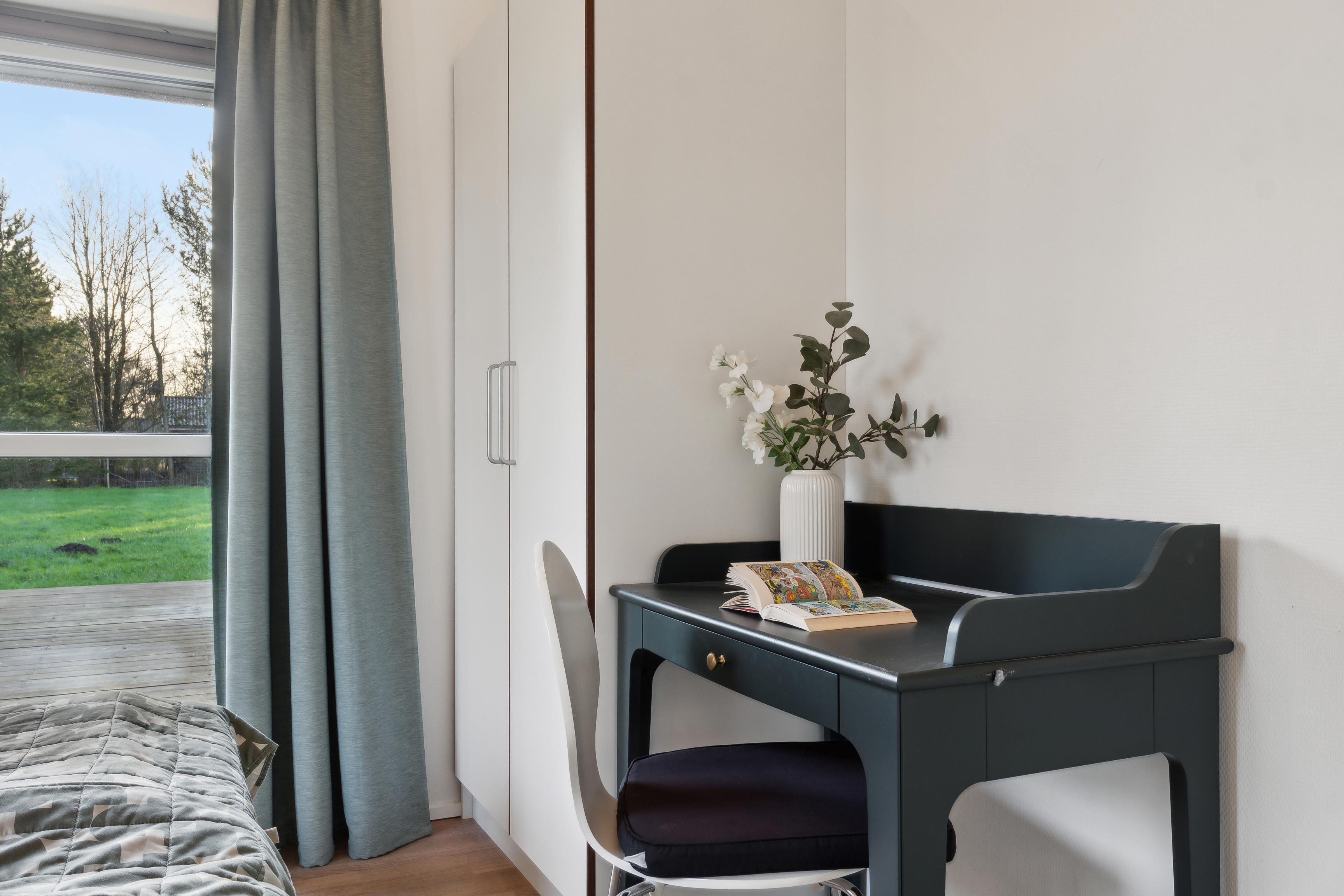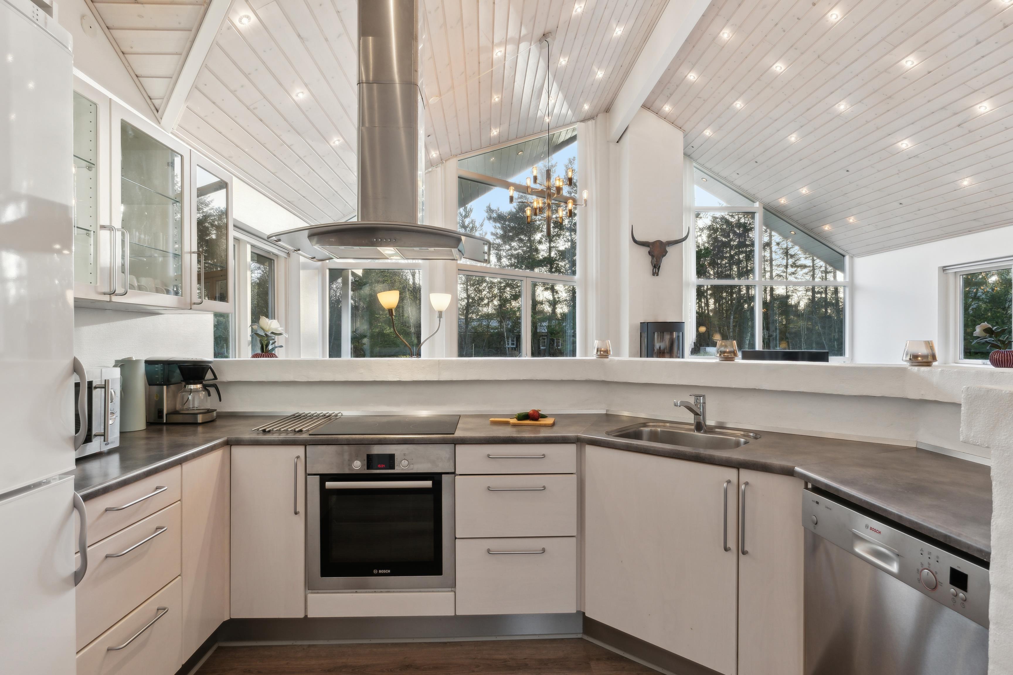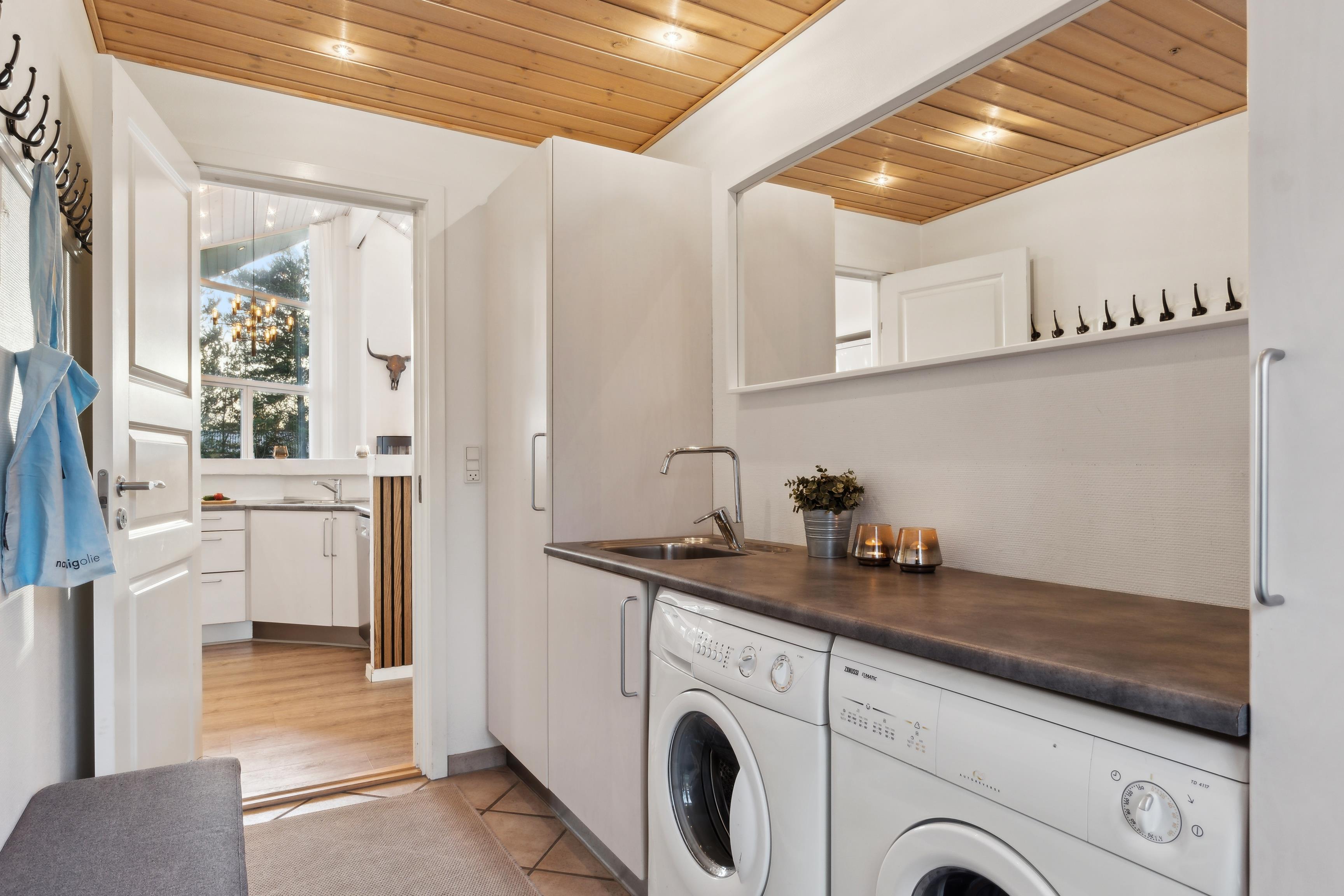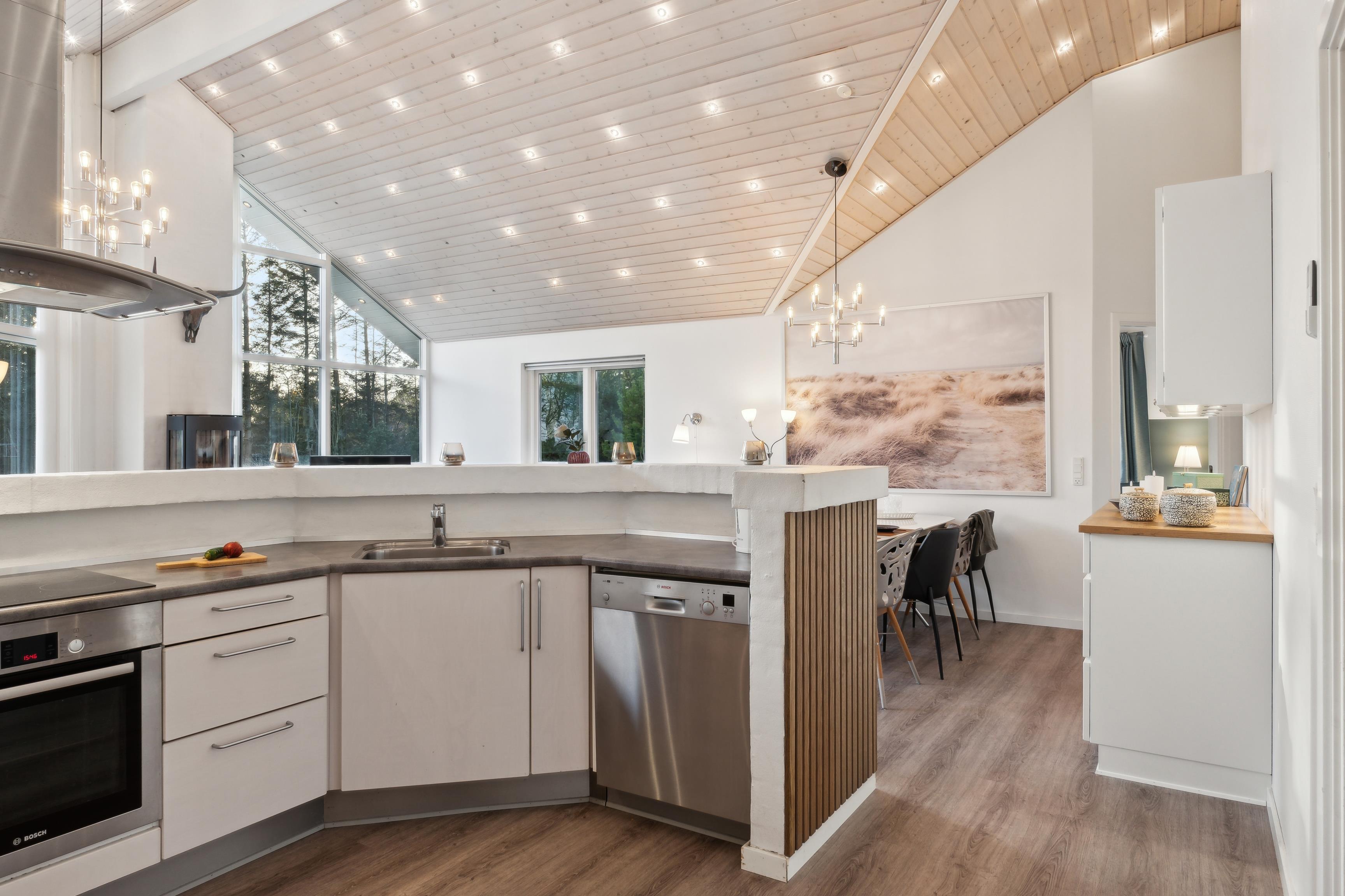 The heart of the house is the open and bright living area, where daylight dances across the tasteful furnishings, creating an inviting atmosphere. The crackling wood-burning stove is like a living painting of warmth and coziness, enjoyed from the dining area, the soft sofas, and the open conversation-friendly kitchen.