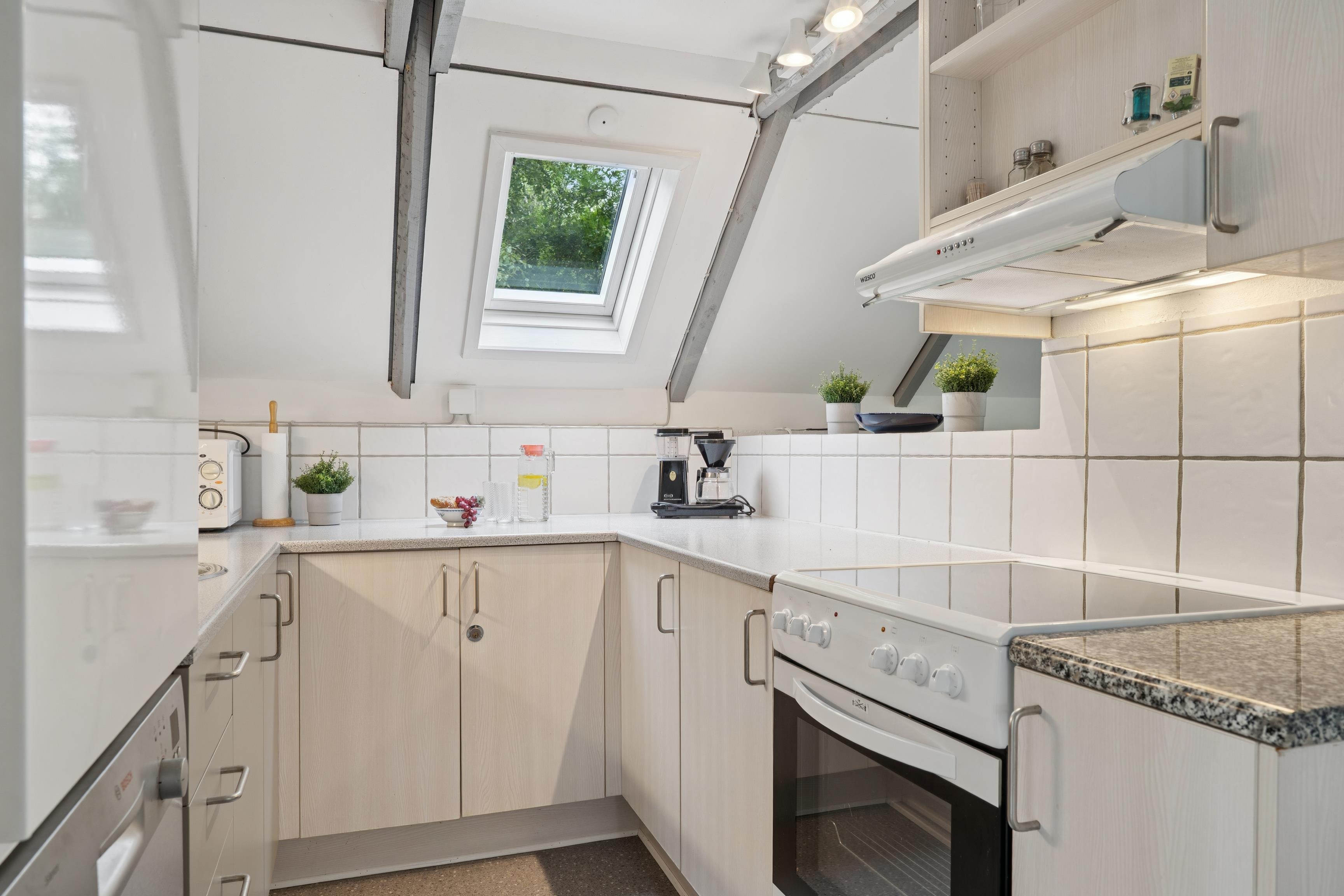 The living room is partially open to the kitchen, creating a natural gathering space—no matter the season. Enjoy meals together or relax in front of the wood-burning stove, which adds both warmth and ambiance. The kitchen is well-equipped with a dishwasher, microwave, and fridge-freezer.