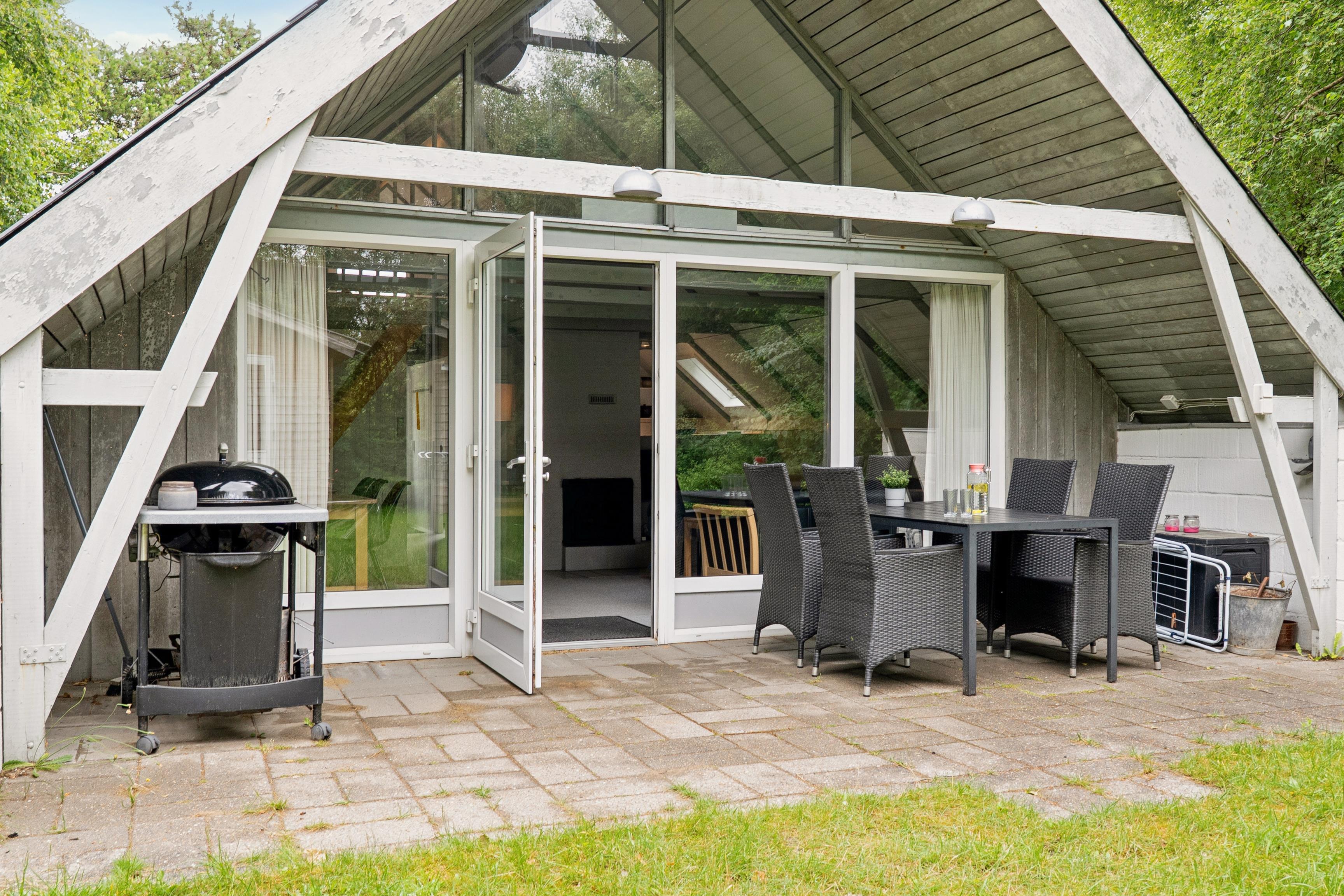 The property is set on a 2,000 m² plot, completely private and surrounded by greenery. There are both open and covered terraces with garden furniture and a barbecue—perfect for outdoor meals under the open sky. In the evenings, you can enjoy the firepit, bake twist bread, or simply relax by the warmth of the flames.