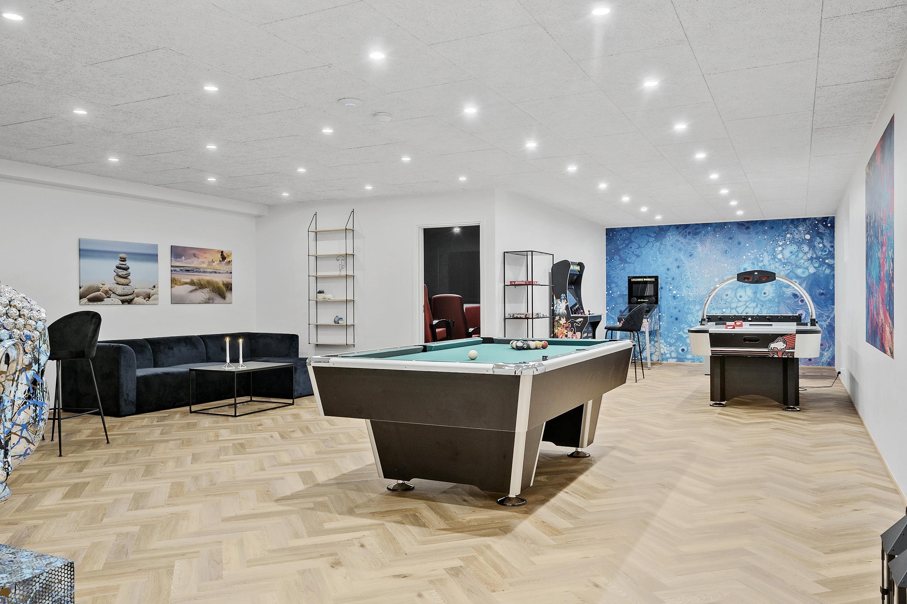 Welcome to Denmark's most spectacular holiday home! This incredible vacation home offers an abundance of amenities both indoors and outdoors. Whether you're seeking action or relaxation, you'll find everything your heart desires here. Settle into our home cinema and enjoy your favorite movies in comfortable surroundings. Unleash your competitive side in the enormous activity room, where you can play billiards, table tennis, darts, air hockey, table foodball, or even challenge yourself on the arcade and pinball machines.