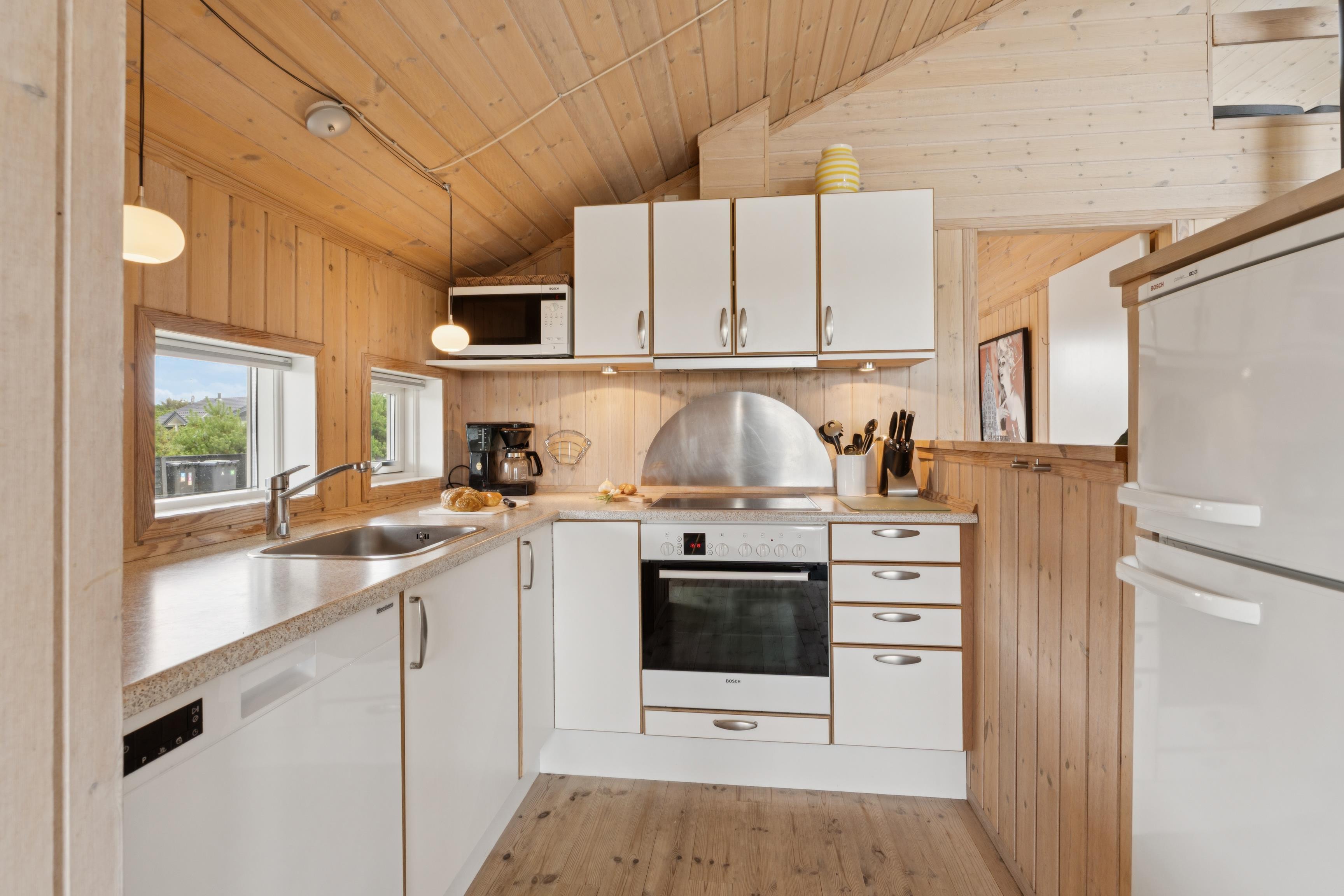 Stylishly furnished throughout, with an open-plan kitchen leading onto the dining and living room and a large enclosed terrace with sweeping views of the Danish countryside, this house has a special charm. High-quality wooden floors have been laid throughout the house and the furniture is also made from top-quality materials. The two bedrooms are each equipped with a double bed and 2 wardrobes. There are 2 sleeping places on a bright and open gallery, which is best suited for children and can be reached via a ladder. In the bright, white-tiled bathroom, you will find a shower, whirlpool and sauna where you can relax and enjoy your infusions. The washing machine is also located there.