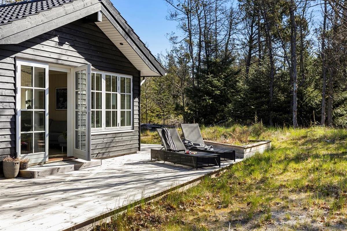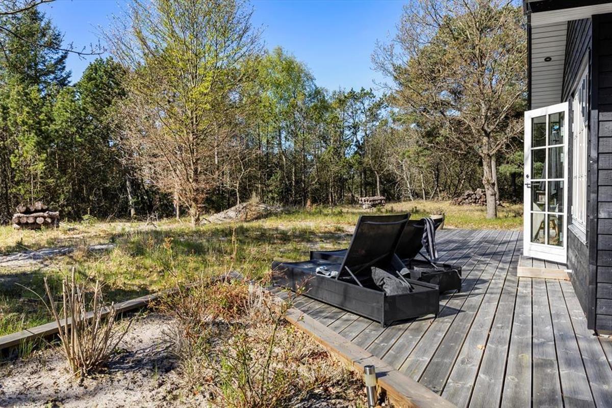 Die große Holzterrasse lädt zu langen Tagen in der Sonne und gemütlichen Abenden mit Grillgerichten und guten Gesprächen ein. Hier kannst du deinen Morgenkaffee bei Vogelgezwitscher genießen und die ersten Sonnenstrahlen des Tages auf deinem Gesicht spüren. Die Terrasse bietet reichlich Platz für sowohl einen Essbereich als auch Liegestühle, sodass du den perfekten Platz für Entspannung und geselliges Beisammensein finden kannst. Rund um das Ferienhaus erstreckt sich die Natur weitläufig, und du kannst direkt zu schönen Spaziergängen in der hügeligen Landschaft aufbrechen oder eine kurze Autofahrt zum Strand unternehmen, um ein erfrischendes Bad in der Nordsee zu nehmen.