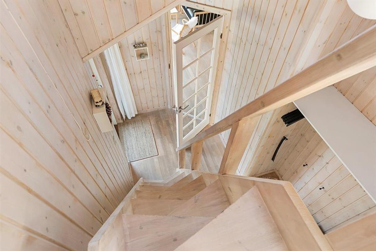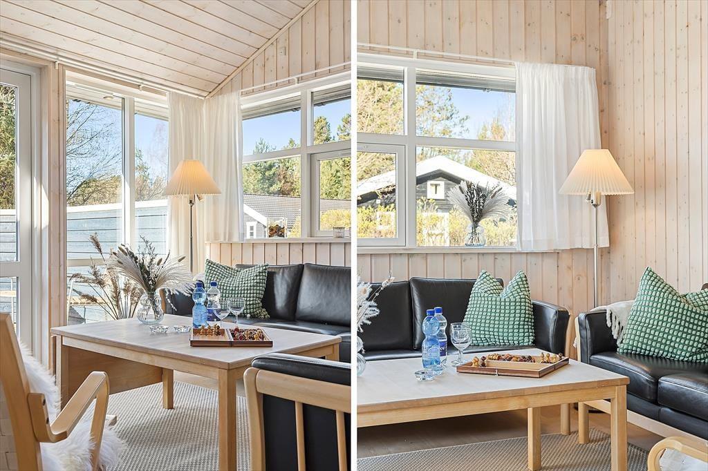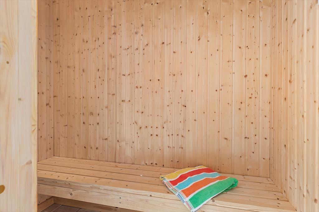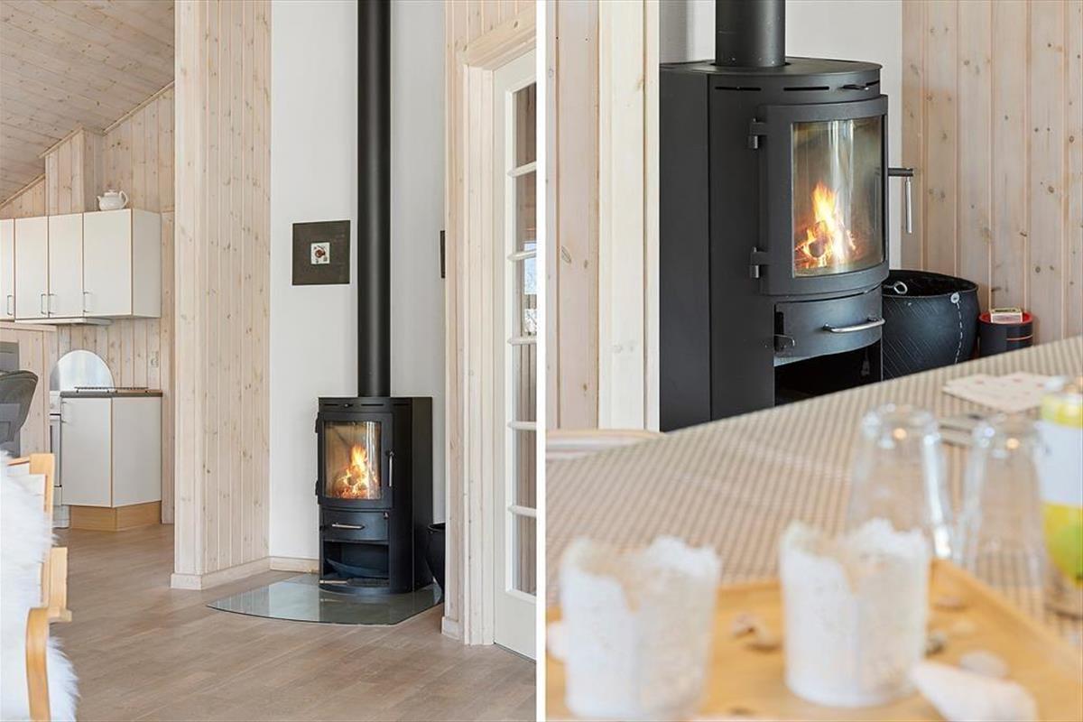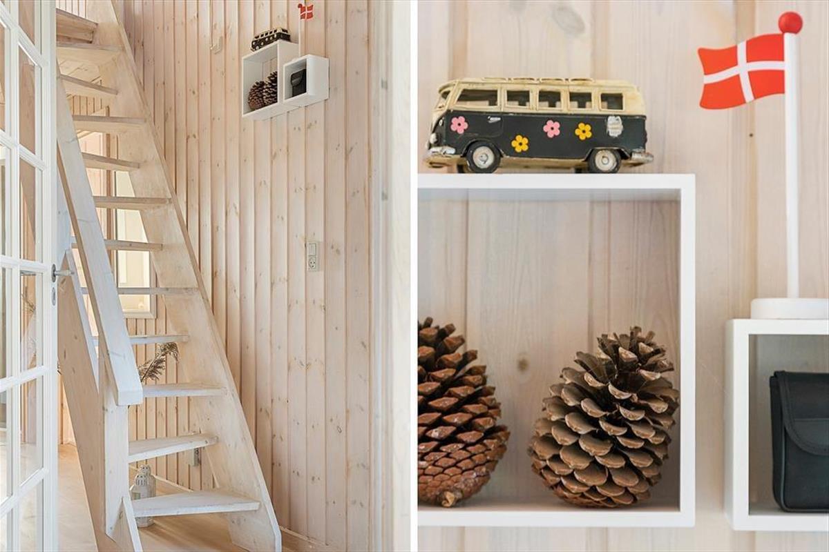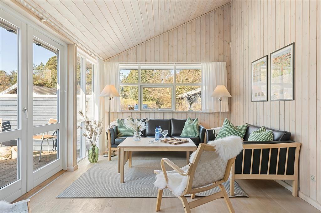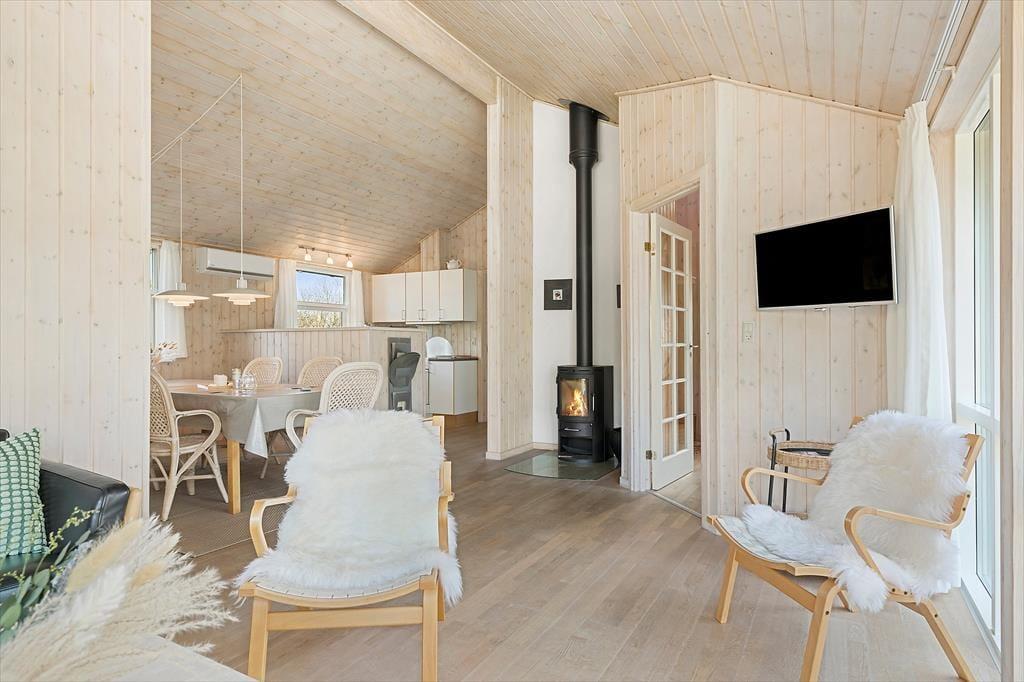 Das Innere des Hauses hat etwas Leichtes und Luftiges an sich, mit heller Holzlvertäfelung an den Wänden, hohen Decken, Korbstühlen am Esstisch und anderen gemütlichen Möbeln. Der Kaminofen im Wohnzimmer steht bereit, um behagliche Wärme zu verbreiten, wenn das Wetter nicht so sommerlich ist – und an einem kühlen Tag wirst du dich über die Sauna und den Whirlpool freuen. Es gibt drei Schlafzimmer, und du kannst auch den Hängeboden nutzen, wenn einige deiner Familienmitglieder lieber dort oben schlafen möchten. Auf dem Hängeboden gibt es auch einen Fernseher, der die Kinder sicher nach oben lockt, wenn sie ihre eigene Kuschelecke brauchen.