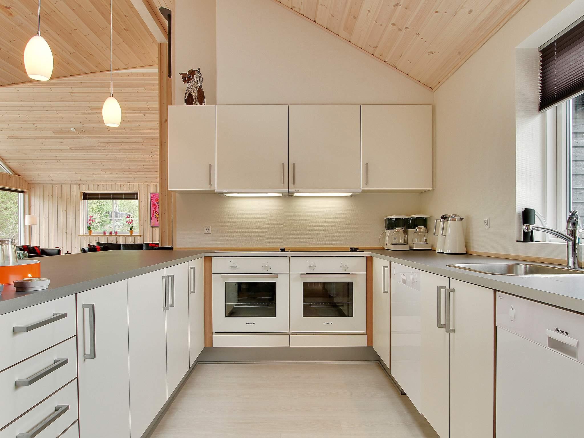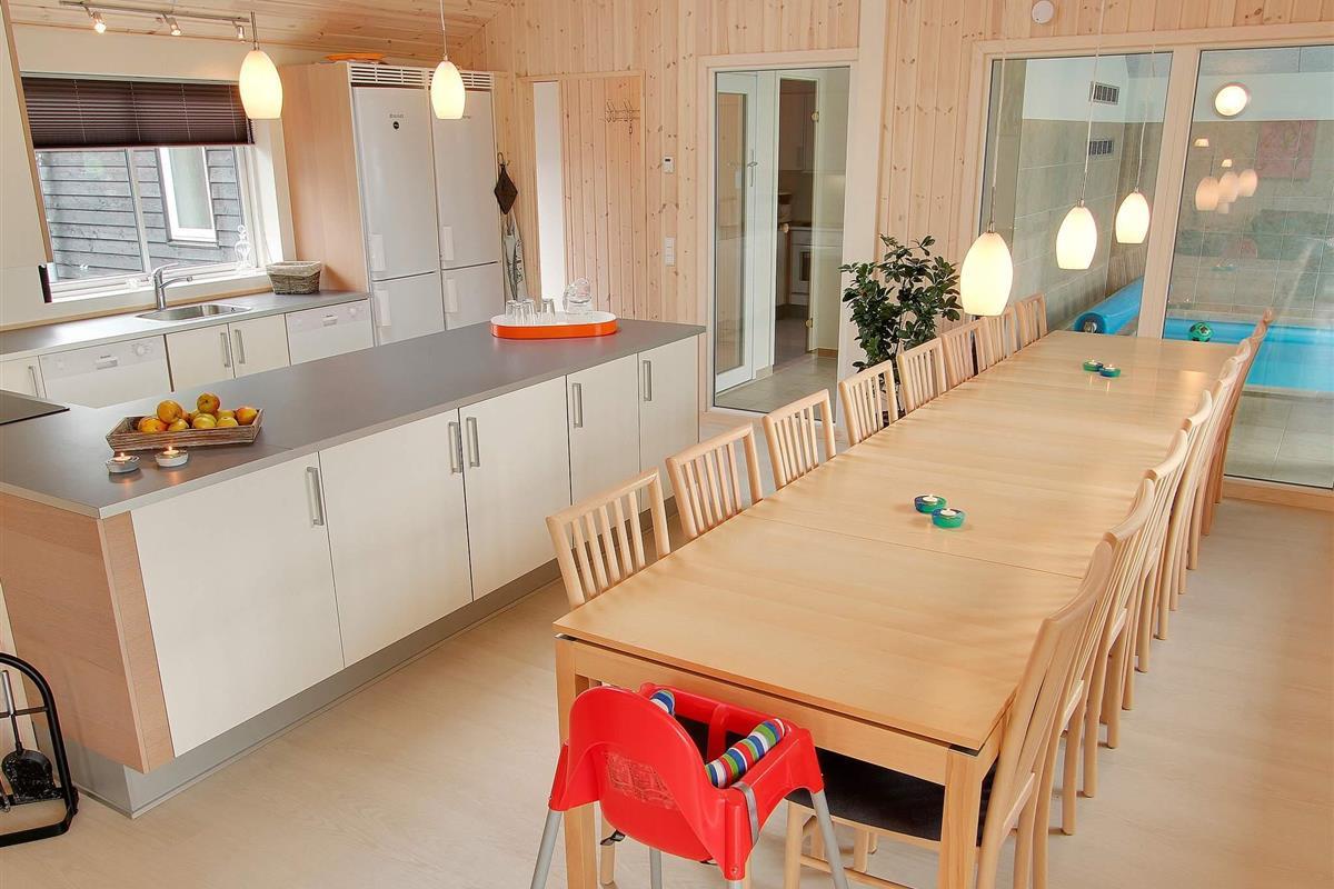 Der große Wohn- und Essbereich ist geschmackvoll eingerichtet und bildet das gemütliche Herzstück des Hauses. Hier finden Sie eine komfortable Sofaecke, einen Flachbildfernseher, eine Stereoanlage mit CD-Player sowie einen Kaminofen, der an kühleren Tagen für eine besonders hyggelige Atmosphäre sorgt. Für Familien mit Kindern stehen außerdem zwei Hochstühle bereit.