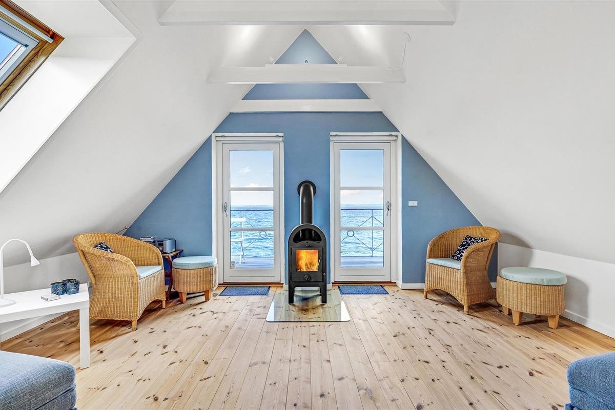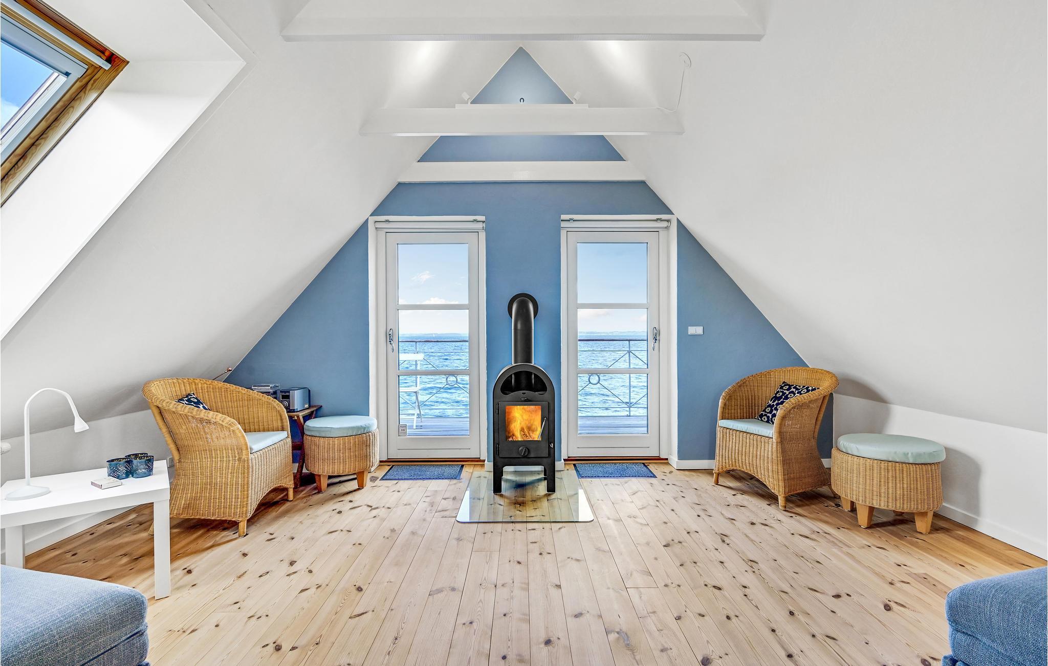 Comfortabel vakantiehuis aan het water in het pittoreske Lohals met panoramisch uitzicht en open haard.