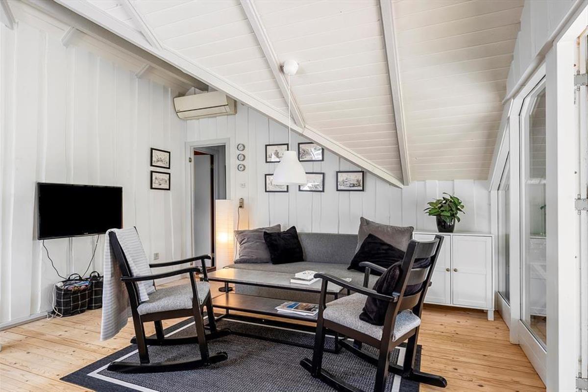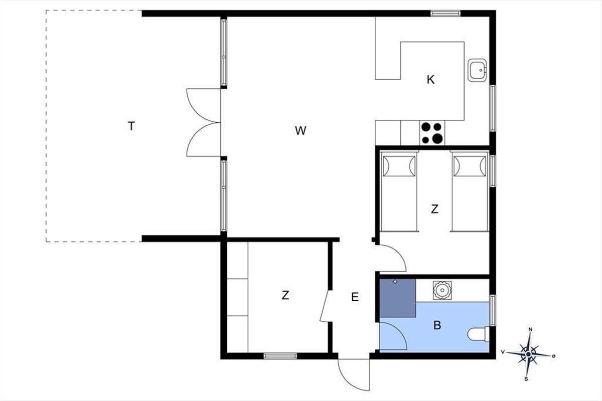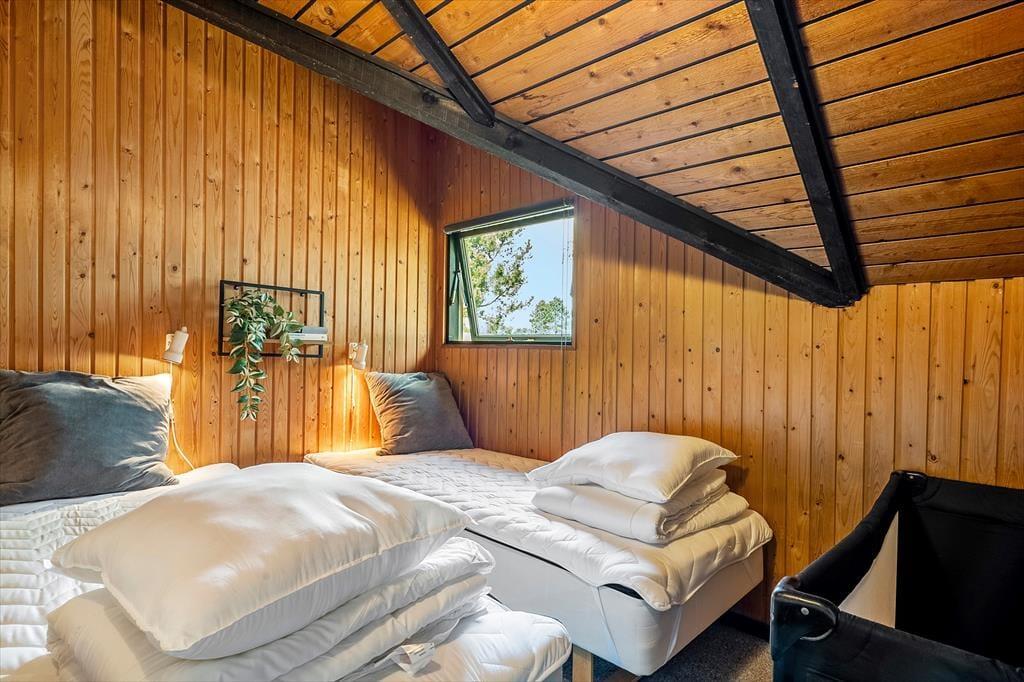 Das Ferienhaus verfügt über: Eingangsbereich, 1 Schlafzimmer mit 2 Einzelbetten, zusätzlich gibt es einen Anbau, in dem sich ein Schlafzimmer mit einem Doppelbett und 1 Einzelbett befindet. Das Haus verfügt über 1 Badezimmer mit Toilette und Dusche. Darüber hinaus gibt es eine offene Küche mit Essbereich und Sofaecke und Holzofen sowie Zugang zur überdachten Terrasse. Das Haus ist hell und bietet viel Raum für Geselligkeit und Gemütlichkeit.