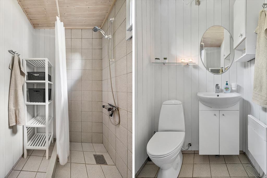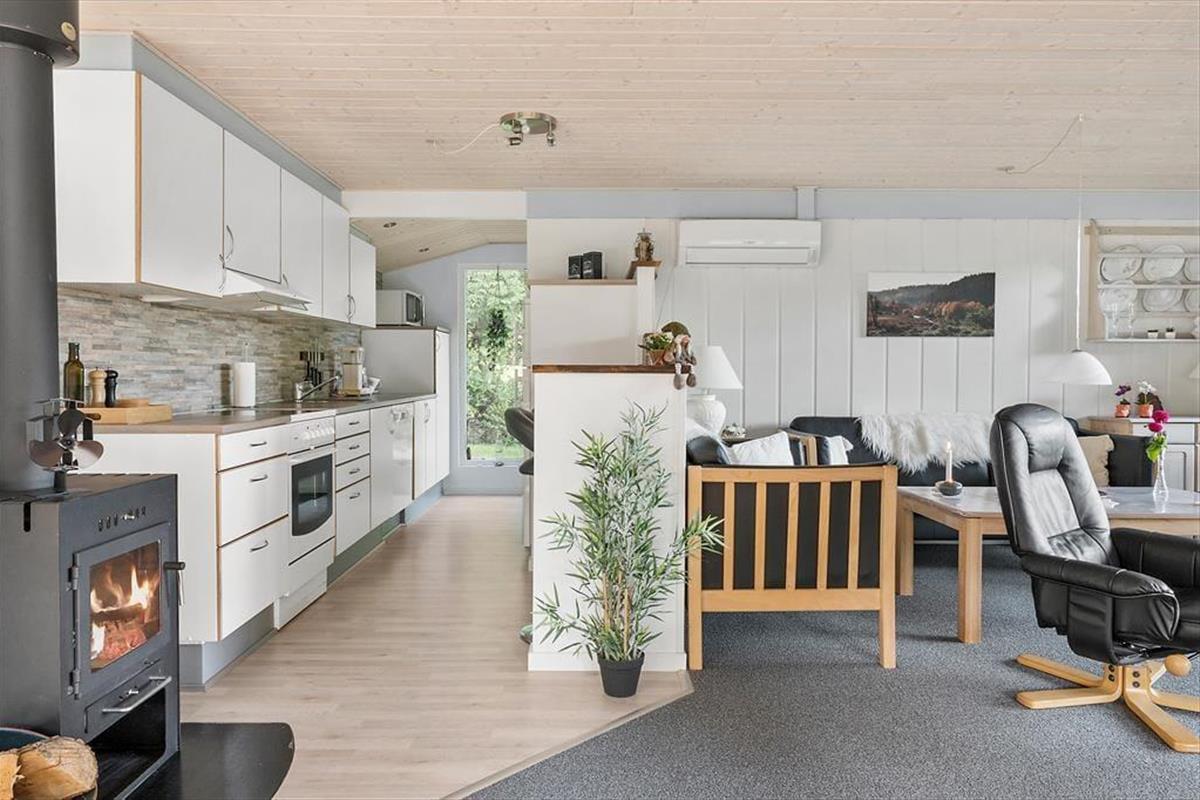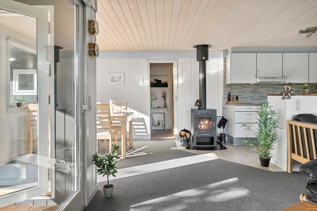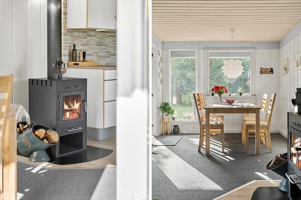 Das 71 m² große Ferienhaus wurde 2019 gründlich renoviert, wovon die Küche und andere liebevolle Einrichtungsdetails zeugen. Die Küche steht in offener Verbindung mit dem Wohnzimmer, welches neben dem gemütlichen Kaminofen auch einen Esstisch und eine Sofaecke mit Fernseher bietet – sowie eine energiesparende Wärmepumpe. Ein Badezimmer mit Dusche und Fußbodenheizung gehört zur Ausstattung, ebenso wie die beiden Schlafzimmer des Hauses, in denen bis zu fünf Personen Platz finden.