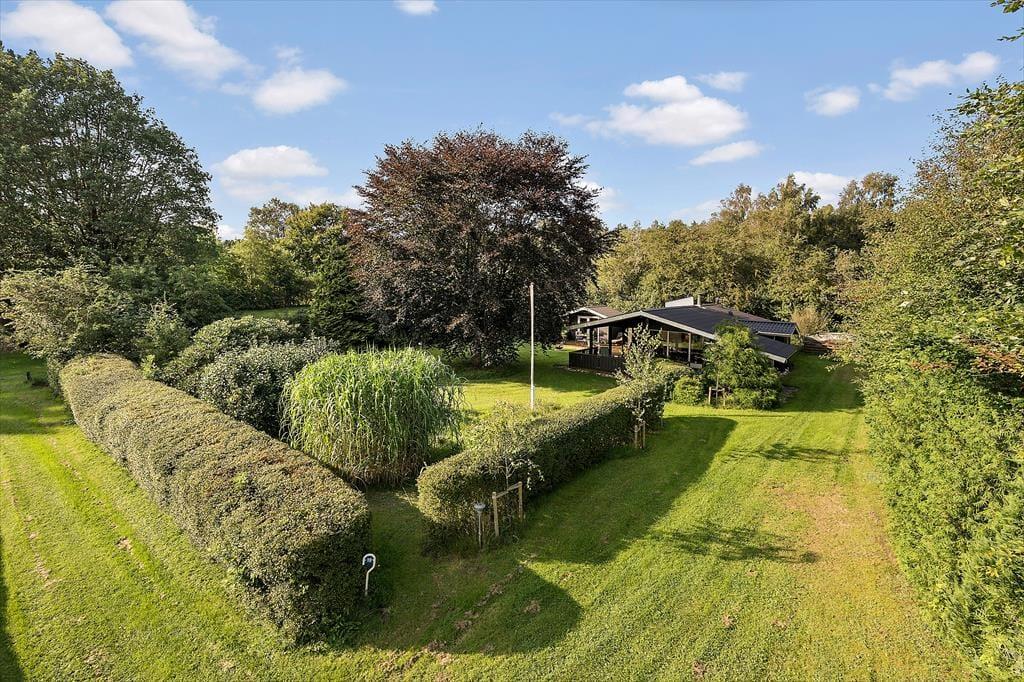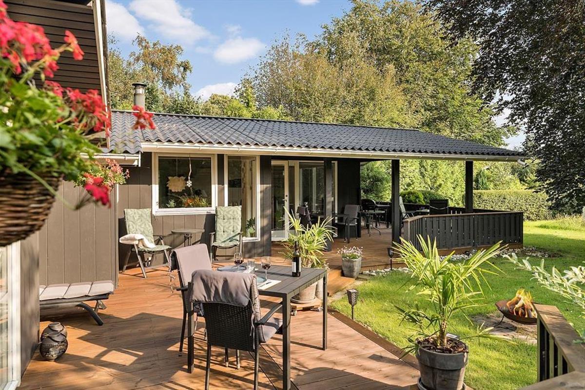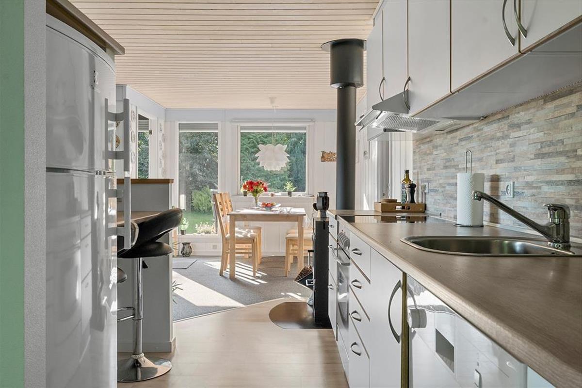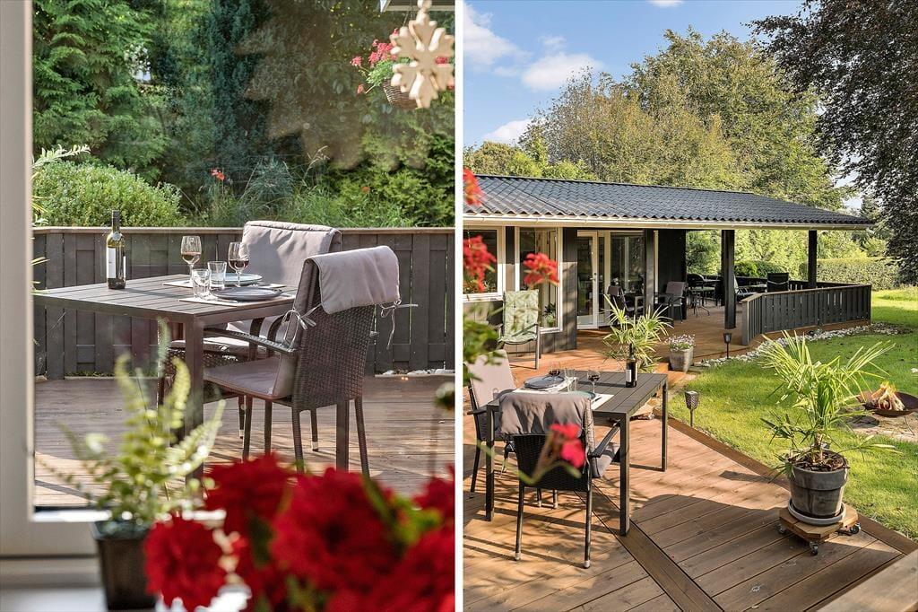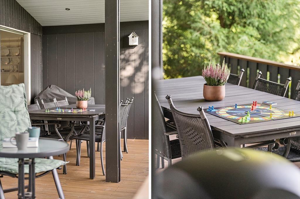 Das Grundstück des Hauses ist mit 1.201 m² recht groß und liegt ruhig am Ende der kleinen Seitenstraße Fjordparken. Wenn Sie Gartenspiele spielen möchten, können Sie sich auf dem Rasen austoben, und ansonsten finden Sie viel Platz auf der 72 m² großen Holzterrasse, die sowohl offene als auch überdachte Bereiche bietet.