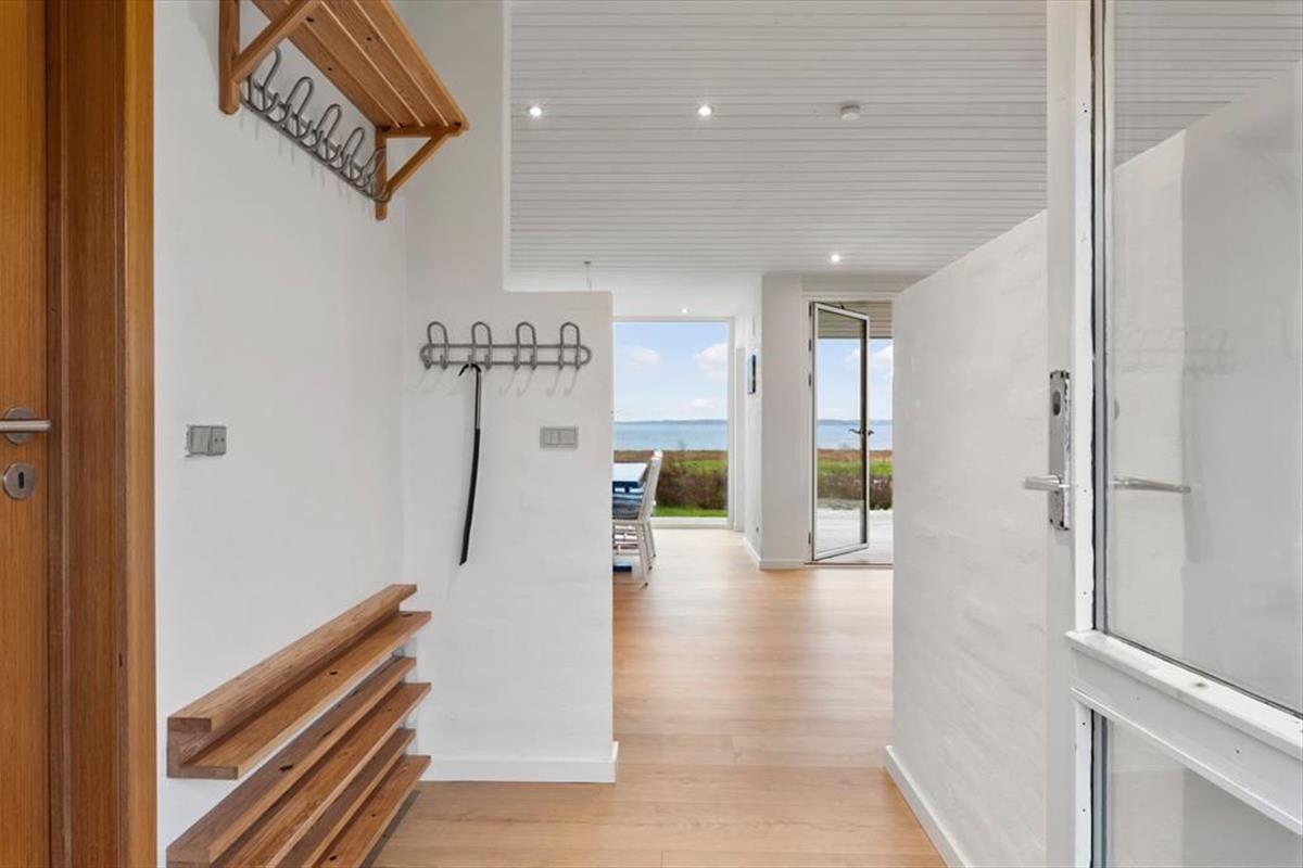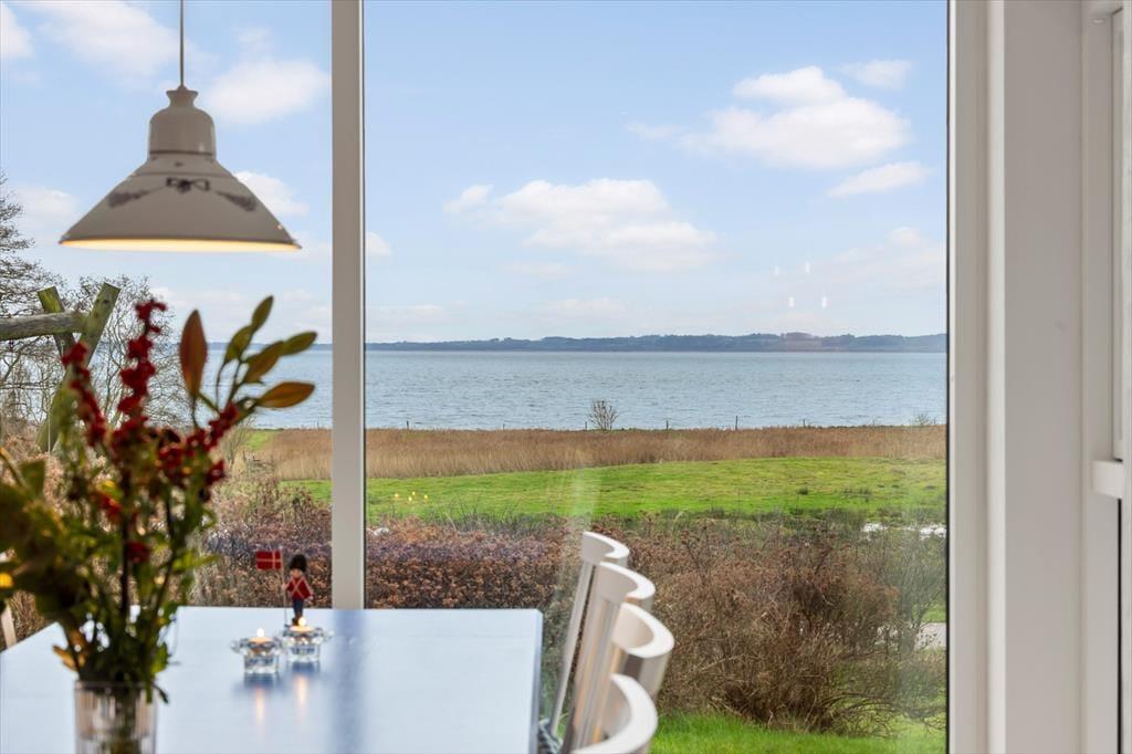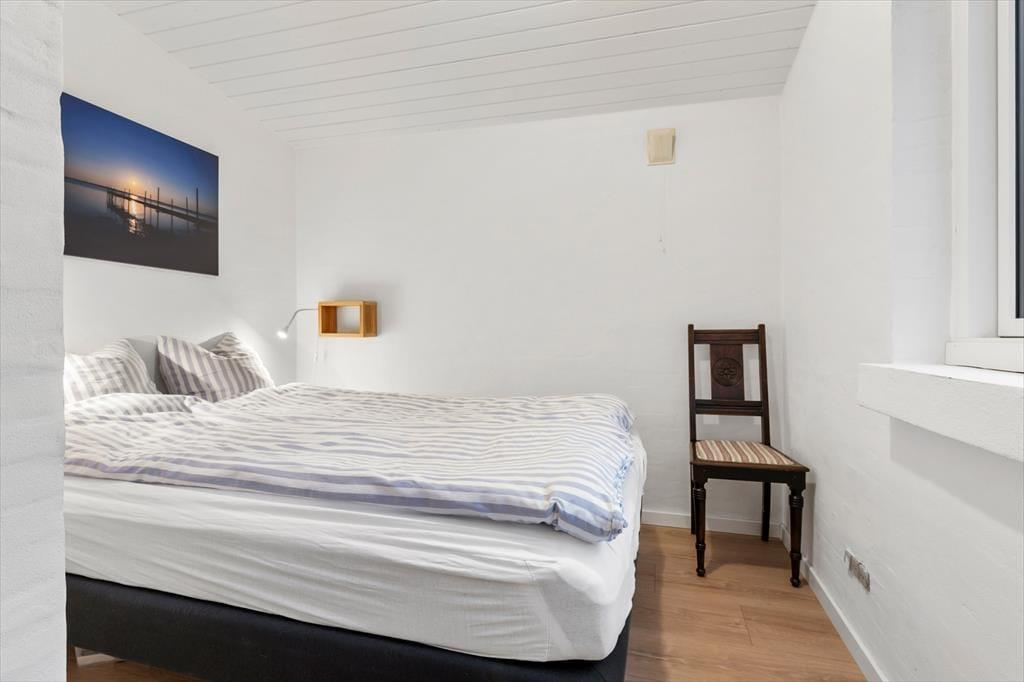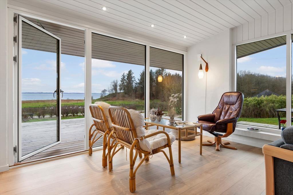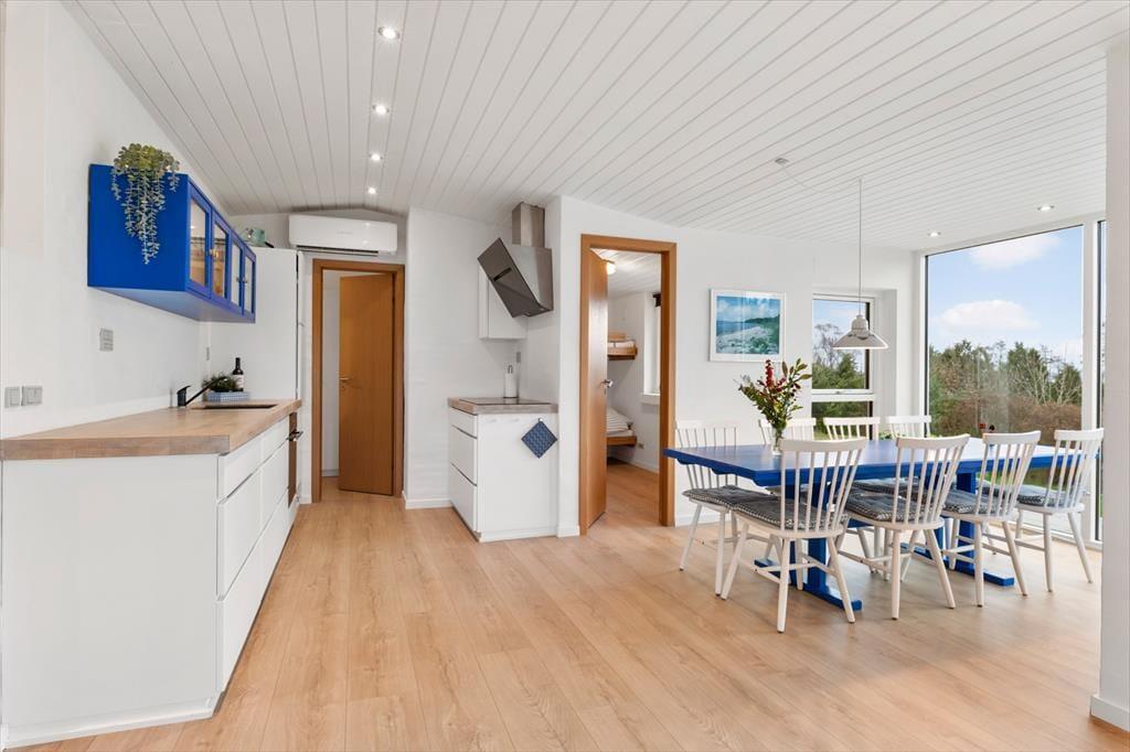 Im Inneren empfängt dich eine helle, moderne und einladende Einrichtung, in der die Räume offen und leicht wirken und das Tageslicht ungehindert einfällt und die entspannte Urlaubsstimmung unterstreicht. Das Wohnzimmer ist der natürliche Treffpunkt des Hauses, und hier lässt es sich wunderbar mit einer Tasse Kaffee niederlassen, während der Blick über die wechselnden Farben des Limfjords schweift. Der Panoramablick sorgt für eine besondere Ruhe, die es leicht macht, den Alltag vollständig hinter sich zu lassen. Küche und Wohnbereich sind offen miteinander verbunden, sodass Gespräche ganz selbstverständlich weitergehen – egal, ob gemeinsam gekocht oder am Esstisch gespielt wird. Wenn der Tag sich dem Ende zuneigt, kannst du dich zurückziehen und die Stille genießen, die nur vom Wind und den leisen Geräuschen der umliegenden Natur unterbrochen wird.