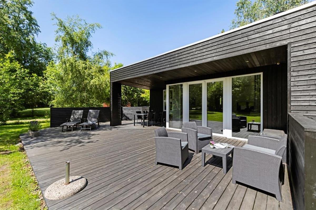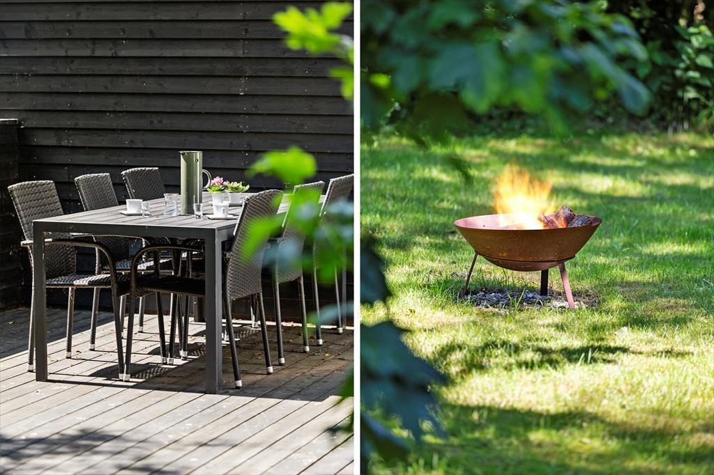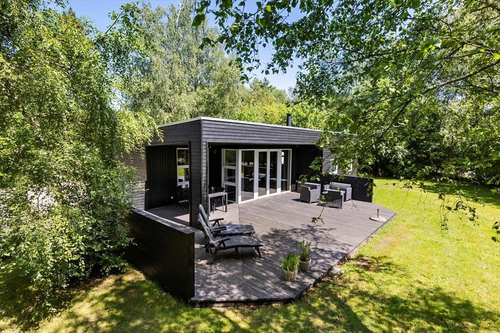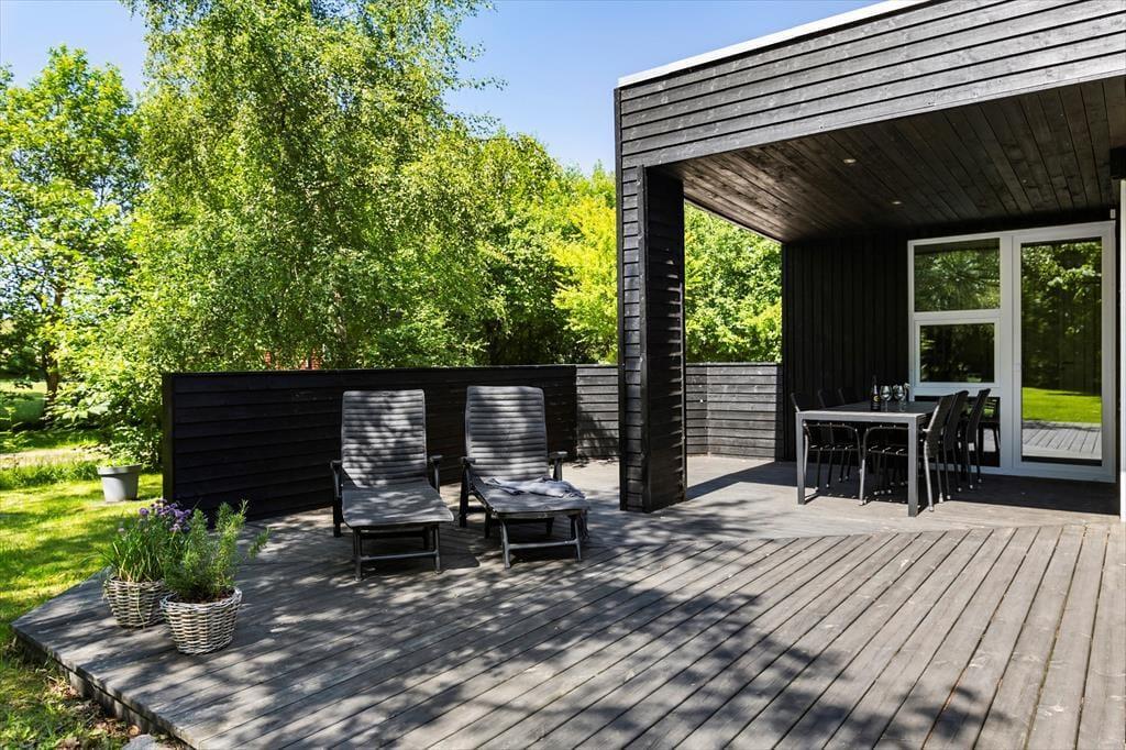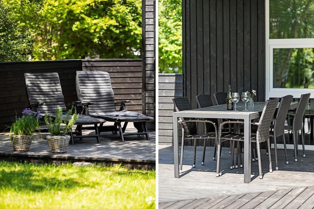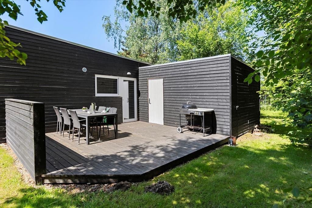Vom Wohnraum, von der Küche und von einem der Schlafzimmer genießen Sie direkten Zugang zu den Terrassen des Ferienhauses. Sobald die Sonne vom Himmel lacht, gelangen Sie also problemlos hinaus ins Freie. Eine offene Terrasse erstreckt sich gen Osten. Eine weitere Terrasse orientiert sich gen Südwesten. Insgesamt ist das Terrassenareal ganze 80 m² groß. Kurz gesagt bietet sich Ihnen also unglaublich viel Platz, um das entspannte Urlaubsleben in vollen Zügen zu genießen. Dank einer Grundfläche von 1.285 m² ermöglicht Ihnen das von Wald und schönen Birken umgebene Grundstück, nach Herzenslust mit der gesamten Familie umherzutollen und Ball zu spielen.