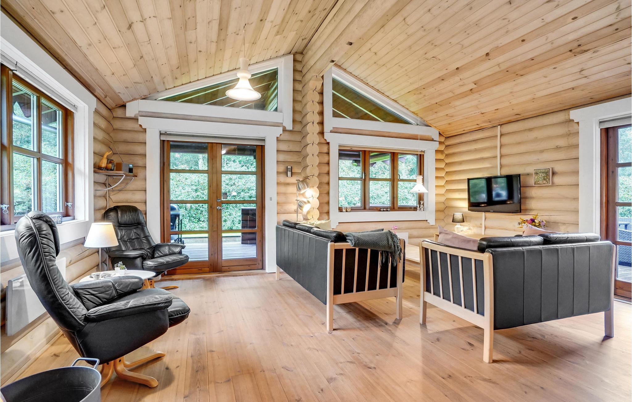 Gezellige blokhut op natuurterrein nabij zee met moderne keuken, houtkachel en terras, ideaal voor ontspanning en natuur.