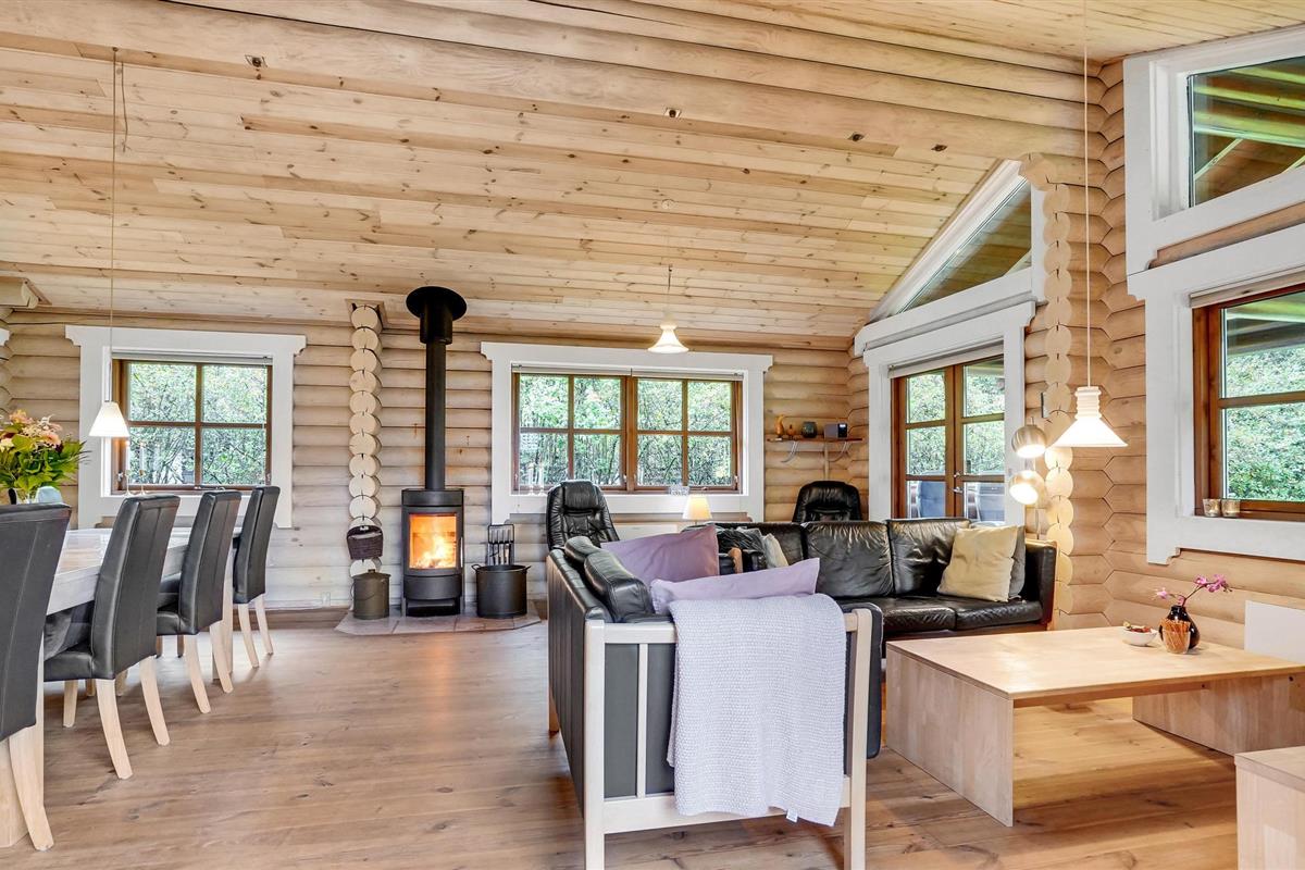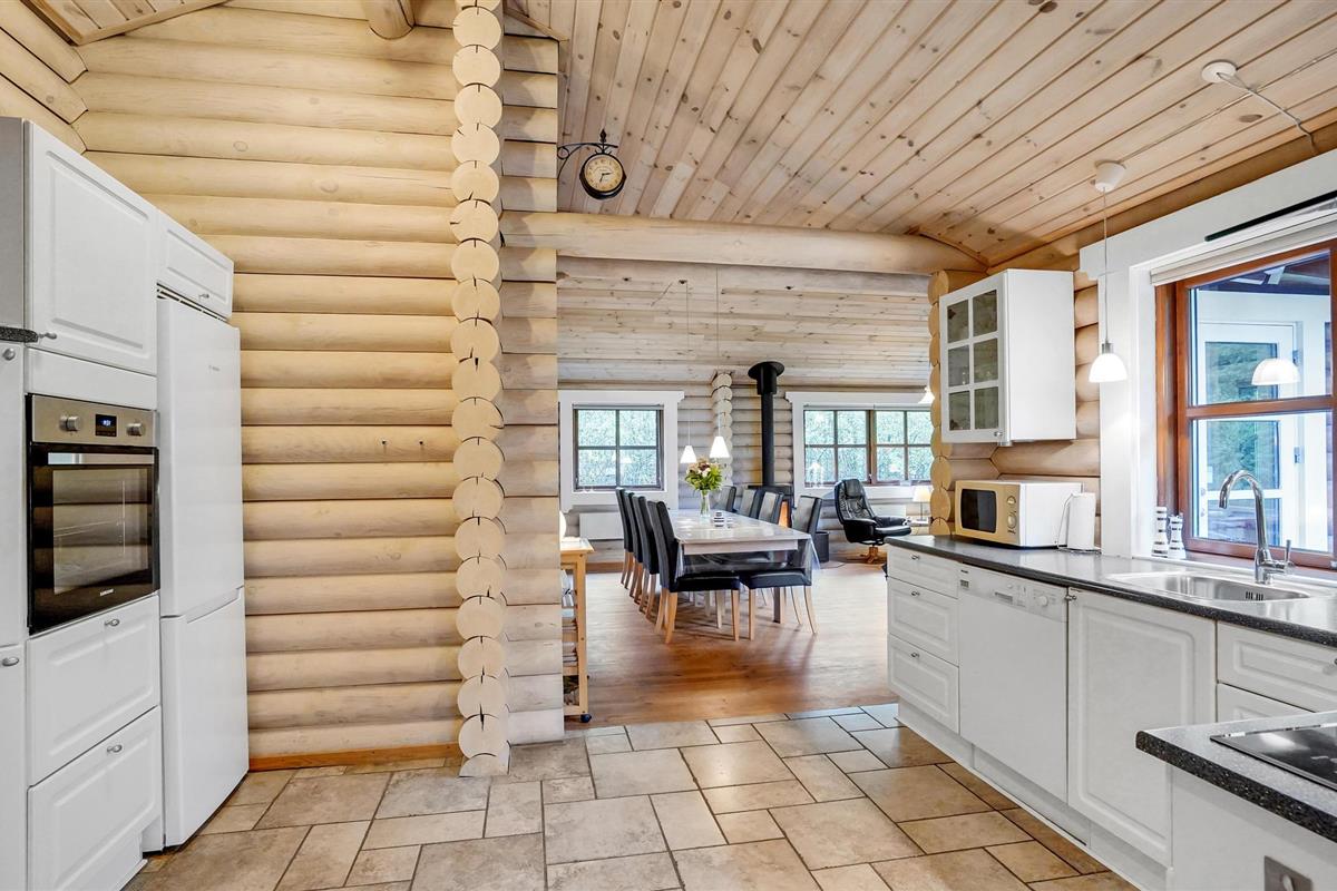 Vanuit een kleinere hal met een klinkervloer komt u direct in de witte, goed functionerende en uitgeruste inbouwkeuken. Hier kunt u gemakkelijk maaltijden voor het gezin bereiden. De woonkamer oogt door de open dakconstructie zeer ruim en vormt het hart van het vakantiehuis. Hij is ingericht met een heerlijke eethoek en een comfortabel bankstel. De meubels en foto's benadrukken de gezellige sfeer van het huis. Vanuit de woonkamer heeft u toegang tot een met planken omgeven terras.