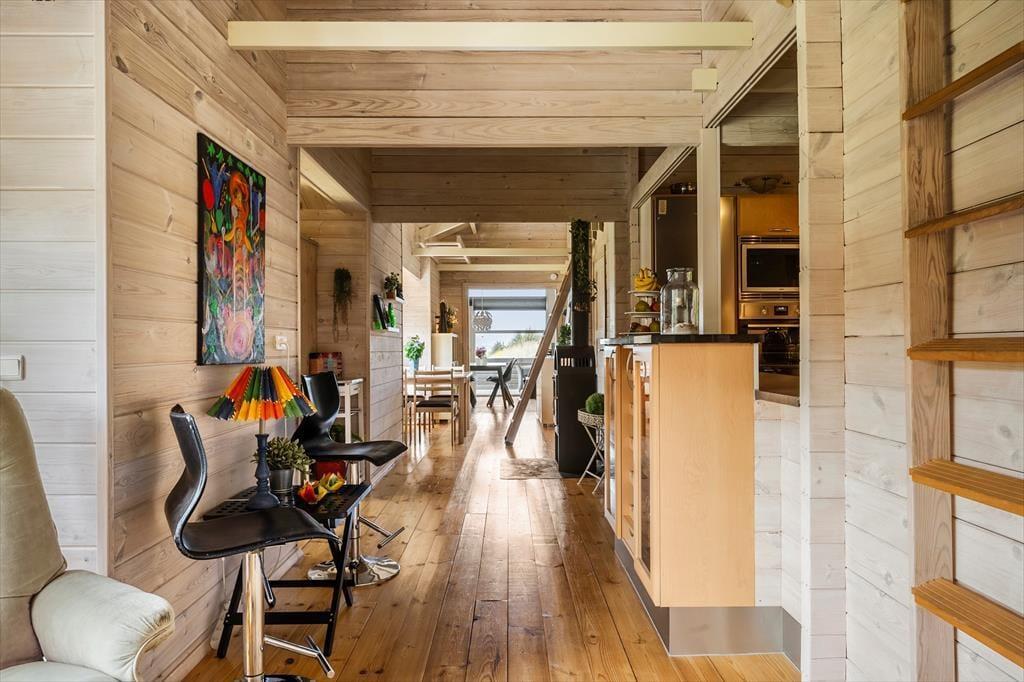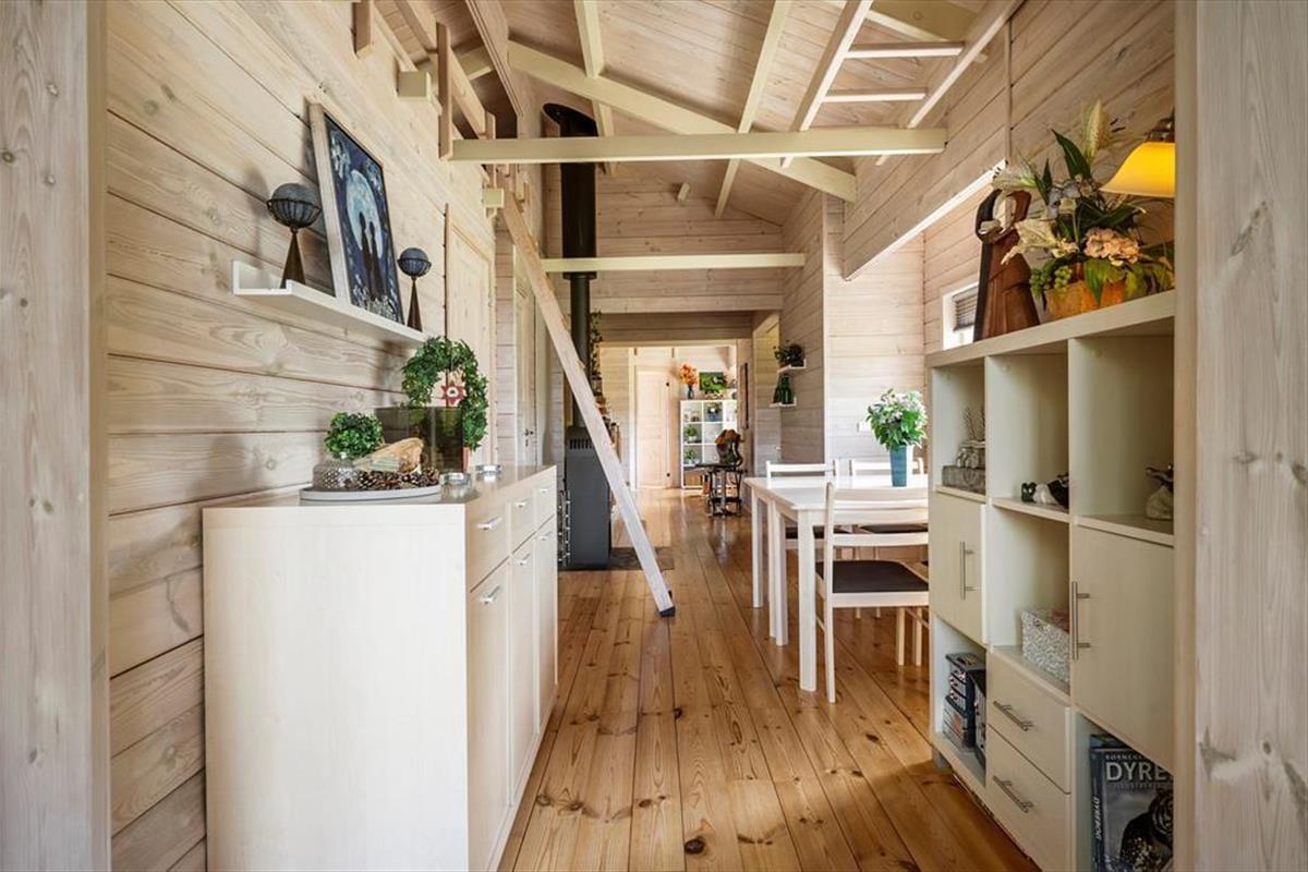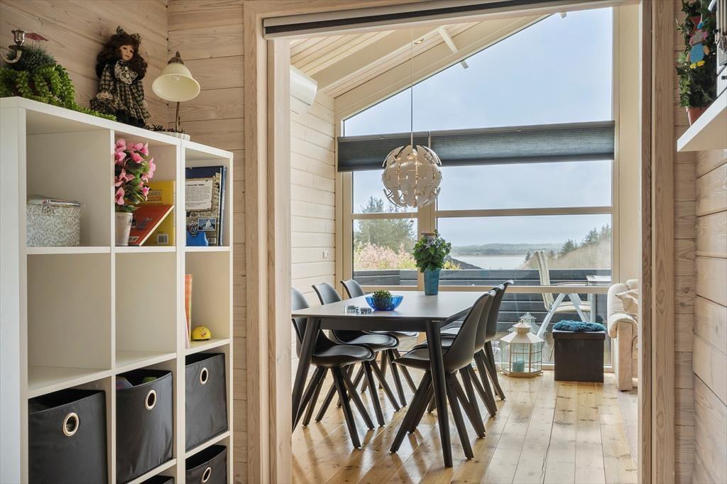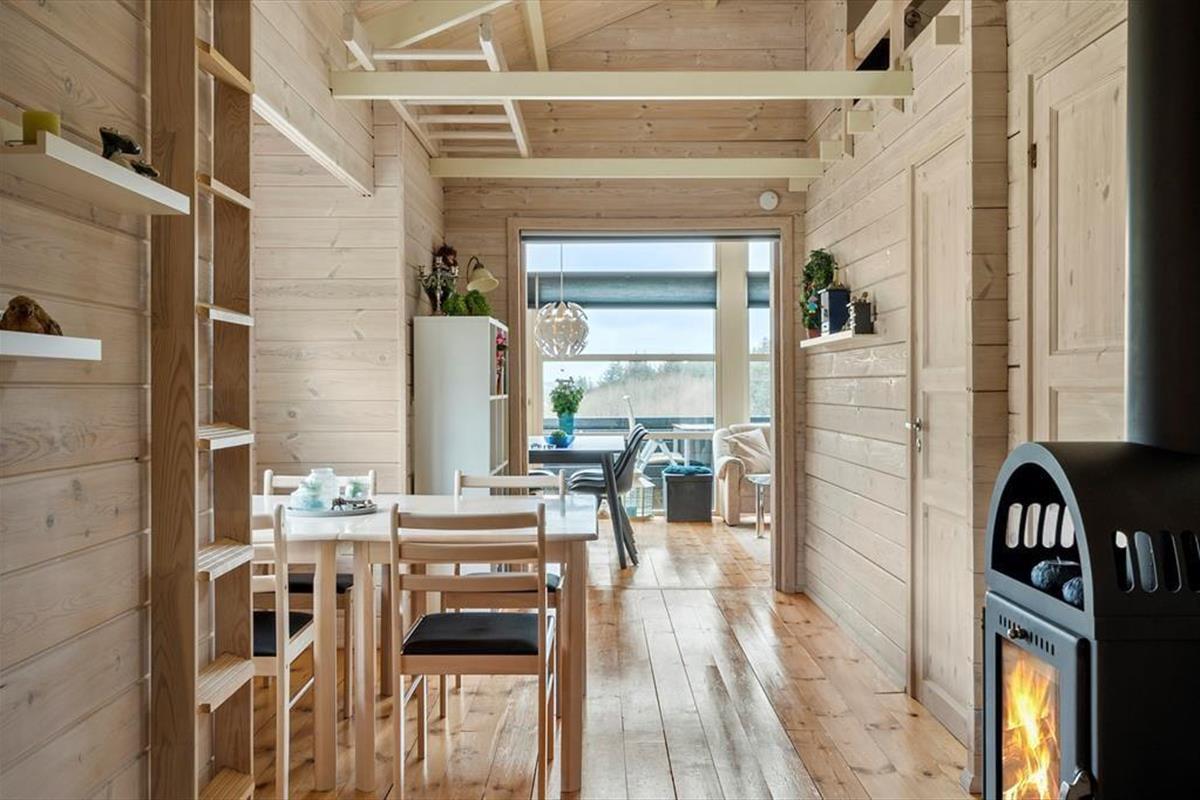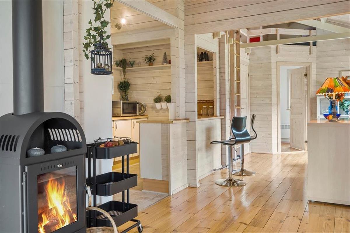 Im Hausinneren begrüßt Sie eine freundliche und einladende Wohnatmosphäre, die unter anderem auf die hellen Holzwände und Holzdecken, die ansprechende Möblierung und die zahlreichen Gemütlichkeit spendenden Details zurückzuführen ist. Das Haus aus dem Jahr 2007 wurde im Jahr 2017 um einen zusätzlichen Wohnraum erweitert. Insgesamt steht Ihnen eine Wohnfläche von 120 m² zur Verfügung. Der Wohnraum begeistert mit einer großen verglasten Giebelfront, die einen wunderschönen Ausblick auf den Fjord und die hügelige Umgebung offenbart. Der schöne Ausblick untermalt unter anderem Ihre gemeinsamen Mahlzeiten am Esstisch. Der Wohnraum ist offen mit einem breiten Aufenthaltsbereich/Flur verbunden, in dem ein Kaminofen für ein Maximum an Gemütlichkeit sorgt. Von hier aus führt eine Leiter hinauf auf zwei große Hängeböden, auf denen Ihre Kinder nach Herzenslust spielen können. Die tolle Küche mit einem Bartresen fügt sich offen in den Aufenthaltsbereich ein. Der Rest der Wohnfläche ist drei gut im Haus verteilten Schlafräumen mit Doppelbetten und einem ansprechenden Badezimmer mit einer Dampfkabine gewidmet.