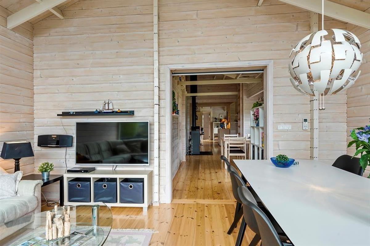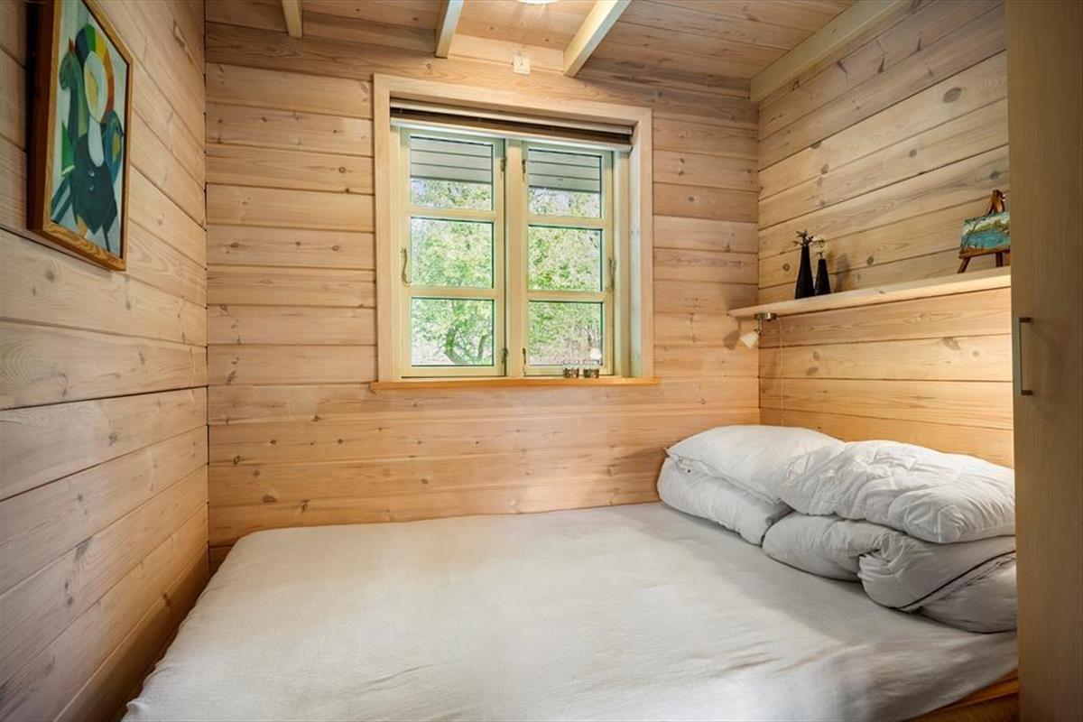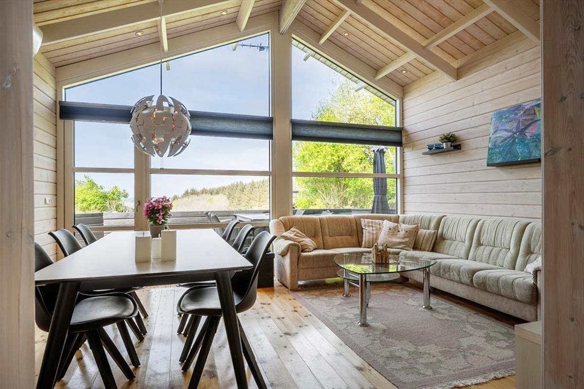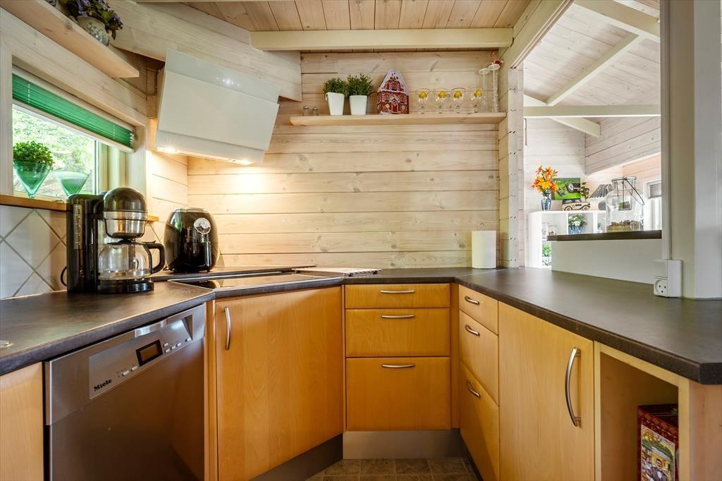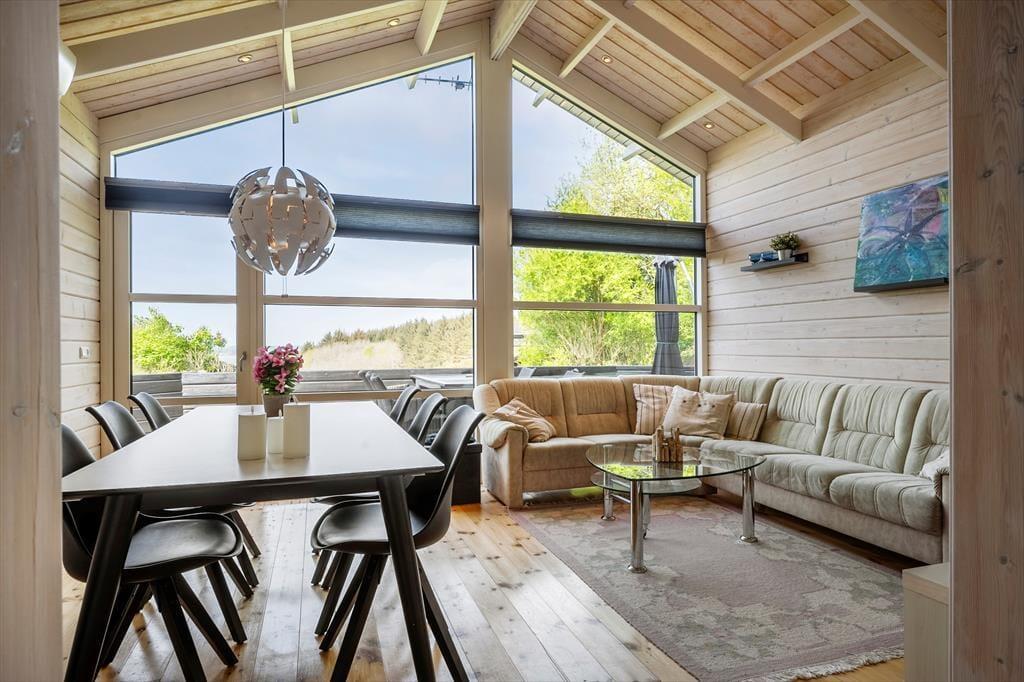 Im Hausinneren begrüßt Sie eine freundliche und einladende Wohnatmosphäre, die unter anderem auf die hellen Holzwände und Holzdecken, die ansprechende Möblierung und die zahlreichen Gemütlichkeit spendenden Details zurückzuführen ist. Das Haus aus dem Jahr 2007 wurde im Jahr 2017 um einen zusätzlichen Wohnraum erweitert. Insgesamt steht Ihnen eine Wohnfläche von 120 m² zur Verfügung. Der Wohnraum begeistert mit einer großen verglasten Giebelfront, die einen wunderschönen Ausblick auf den Fjord und die hügelige Umgebung offenbart. Der schöne Ausblick untermalt unter anderem Ihre gemeinsamen Mahlzeiten am Esstisch. Der Wohnraum ist offen mit einem breiten Aufenthaltsbereich/Flur verbunden, in dem ein Kaminofen für ein Maximum an Gemütlichkeit sorgt. Von hier aus führt eine Leiter hinauf auf zwei große Hängeböden, auf denen Ihre Kinder nach Herzenslust spielen können. Die tolle Küche mit einem Bartresen fügt sich offen in den Aufenthaltsbereich ein. Der Rest der Wohnfläche ist drei gut im Haus verteilten Schlafräumen mit Doppelbetten und einem ansprechenden Badezimmer mit einer Dampfkabine gewidmet.