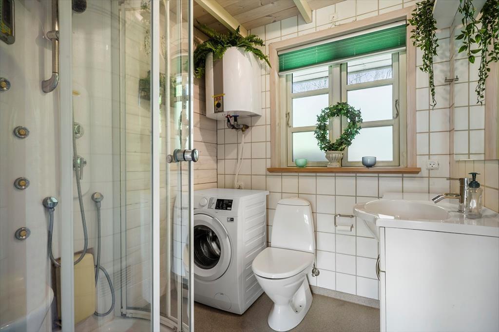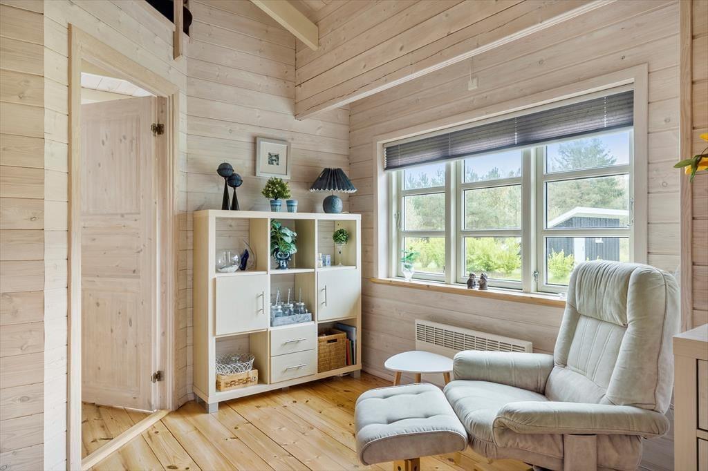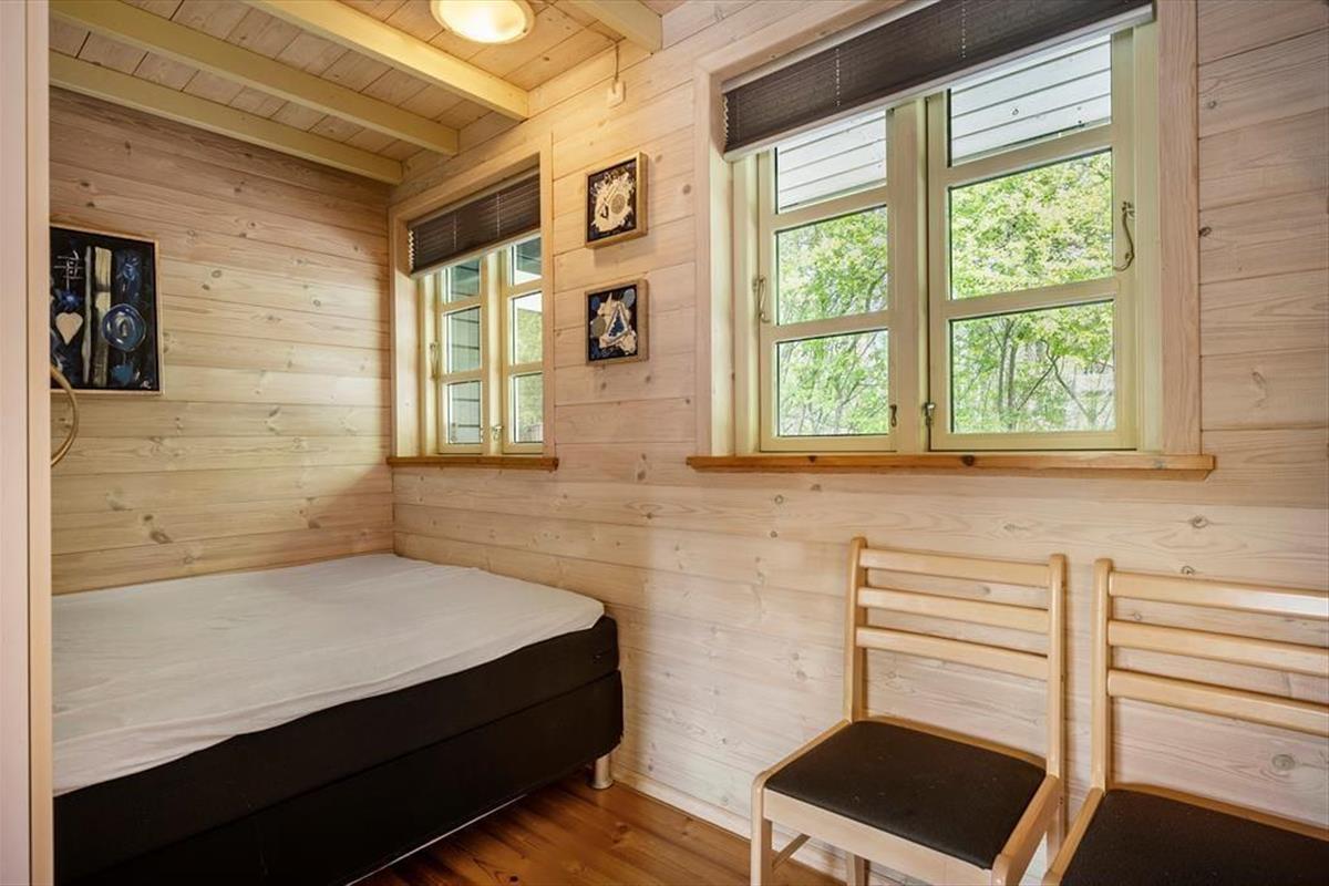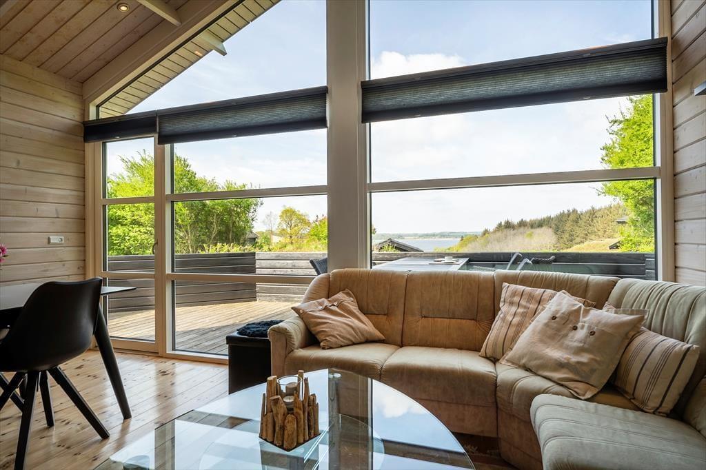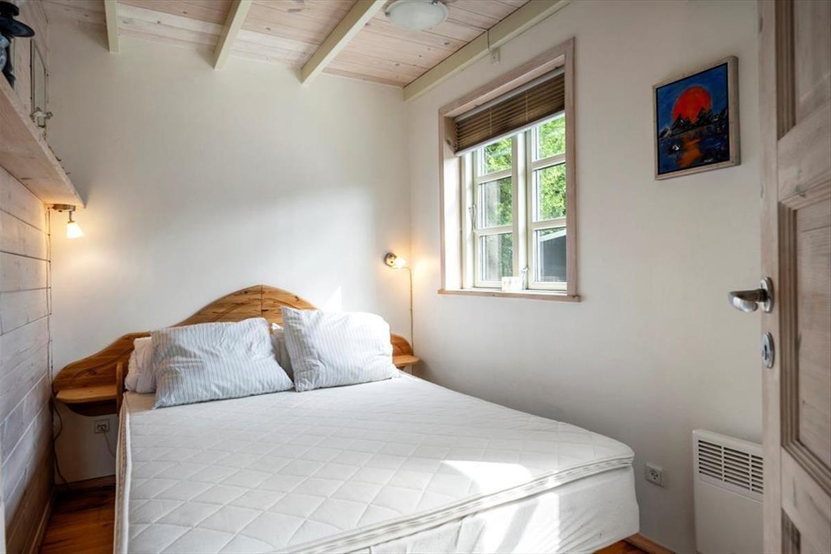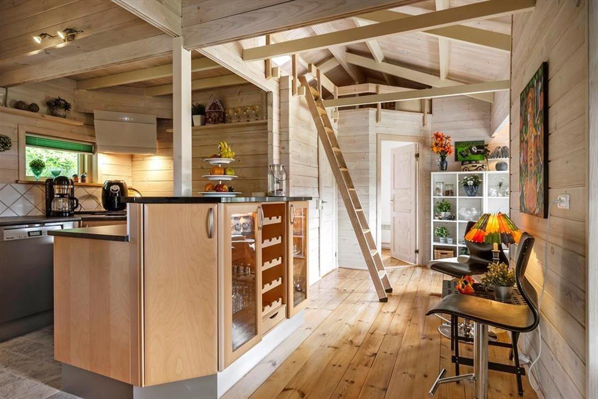Im Hausinneren begrüßt Sie eine freundliche und einladende Wohnatmosphäre, die unter anderem auf die hellen Holzwände und Holzdecken, die ansprechende Möblierung und die zahlreichen Gemütlichkeit spendenden Details zurückzuführen ist. Das Haus aus dem Jahr 2007 wurde im Jahr 2017 um einen zusätzlichen Wohnraum erweitert. Insgesamt steht Ihnen eine Wohnfläche von 120 m² zur Verfügung. Der Wohnraum begeistert mit einer großen verglasten Giebelfront, die einen wunderschönen Ausblick auf den Fjord und die hügelige Umgebung offenbart. Der schöne Ausblick untermalt unter anderem Ihre gemeinsamen Mahlzeiten am Esstisch. Der Wohnraum ist offen mit einem breiten Aufenthaltsbereich/Flur verbunden, in dem ein Kaminofen für ein Maximum an Gemütlichkeit sorgt. Von hier aus führt eine Leiter hinauf auf zwei große Hängeböden, auf denen Ihre Kinder nach Herzenslust spielen können. Die tolle Küche mit einem Bartresen fügt sich offen in den Aufenthaltsbereich ein. Der Rest der Wohnfläche ist drei gut im Haus verteilten Schlafräumen mit Doppelbetten und einem ansprechenden Badezimmer mit einer Dampfkabine gewidmet.