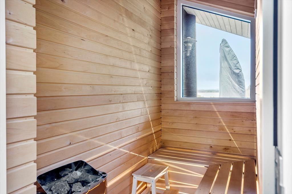 Unter freiem Himmel erwartet Sie auf der geräumigen Terrasse ein Entspannungsbereich mit Sauna und Aussendusche. Die Terrasse begeistert mit einem Panoramablick über Fjord und Küste, sodass Sie sich in schönster Umgebung bestens erholen und entspannen. Genießen Sie das ruhige Urlaubsleben auf der großen Holzterrasse, die das gesamte Mietobjekt umgibt. Beim Carport befindet sich ein gepflastertes Areal, auf dem Sie die im Schuppen untergebrachte Tischtennisplatte aufstellen und nach Herzenslust nutzen können. Die Grasfläche bietet viel Platz zum Ballspielen und Umhertollen.