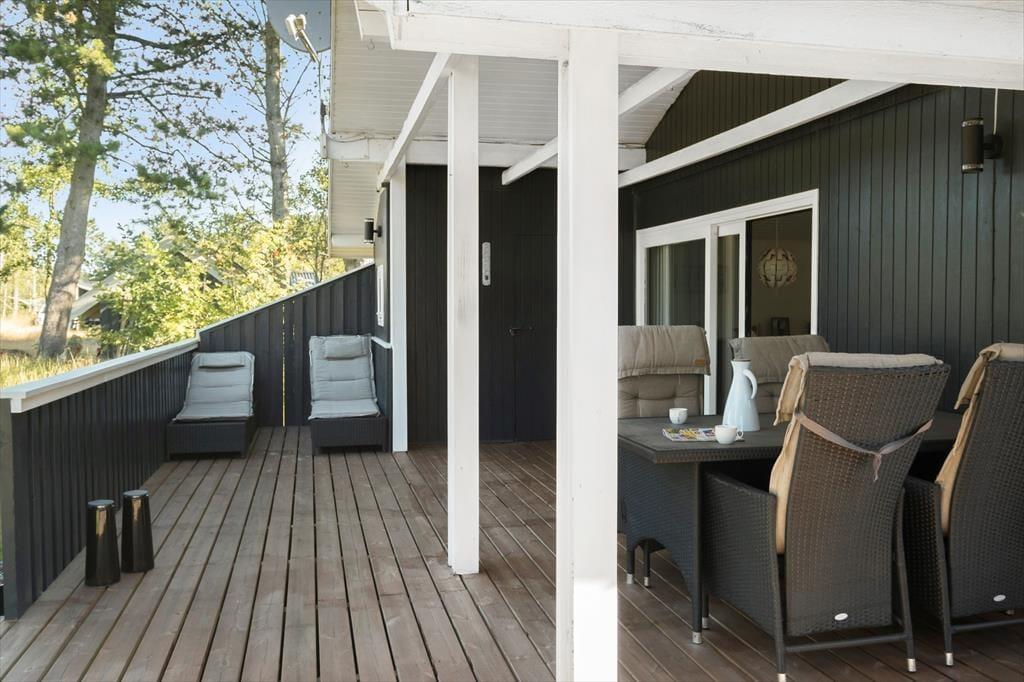 Östlich und westlich am Haus befinden sich große Terrassenbereiche. Hier können Sie wunderbar in der Morgensonne frühstücken, ein Mittagessen in der Sonne und ein Abendessen vom Grill genießen. Kühlen Schatten spendet die Terrassenüberdachung. Während Sie sich in vollen Zügen auf den Terrassen erholen und entspannen, werden Ihre Kinder vergnügt auf der Rasenfläche umhertollen und spielen.