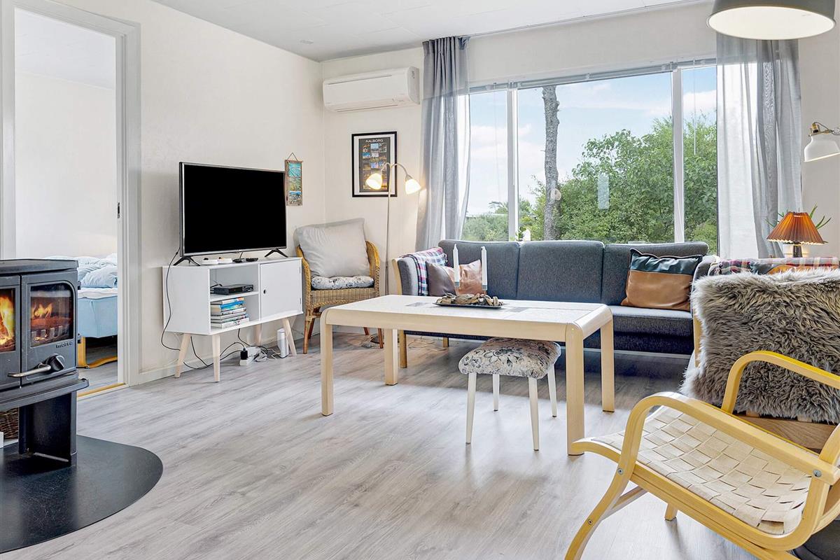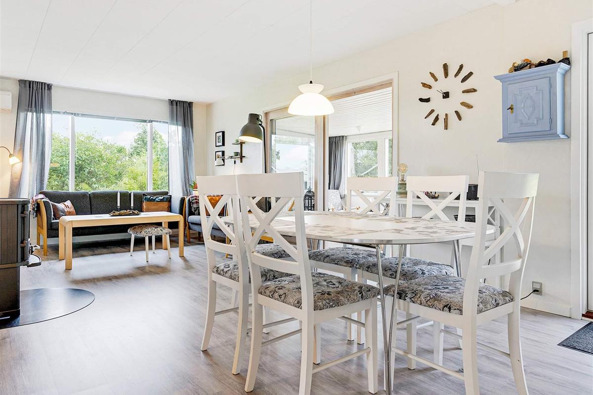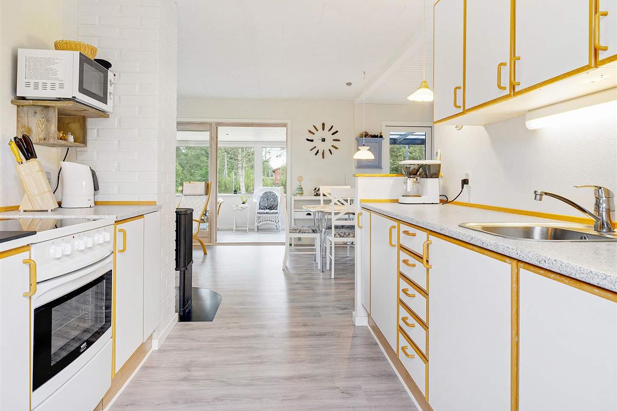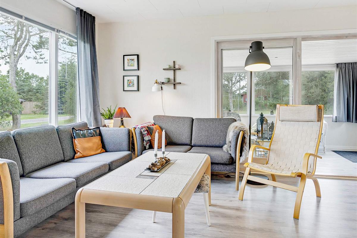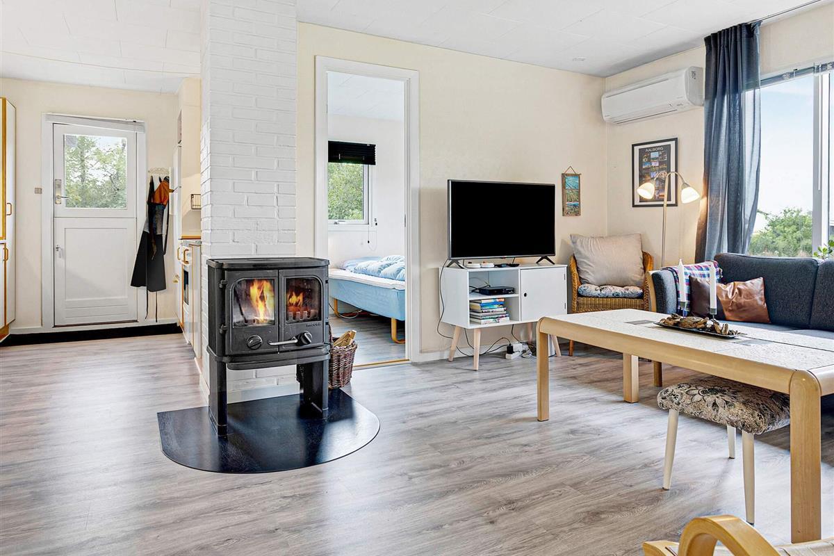 Das Ferienhaus ist gut gepflegt und wohnlich eingerichtet. Die großen Fenster sorgen für viel Tageslicht, der Ofen bei Bedarf für wohlige Wärme. Im Haus drei Schlafzimmer mit jeweils einem Doppelbett sowie ein offener Küchen-/Wohnbereich mit Zugang zu einer teilweise überdachten Terrassenfläche, auf der Sie die Sommertage und -abende genießen können.