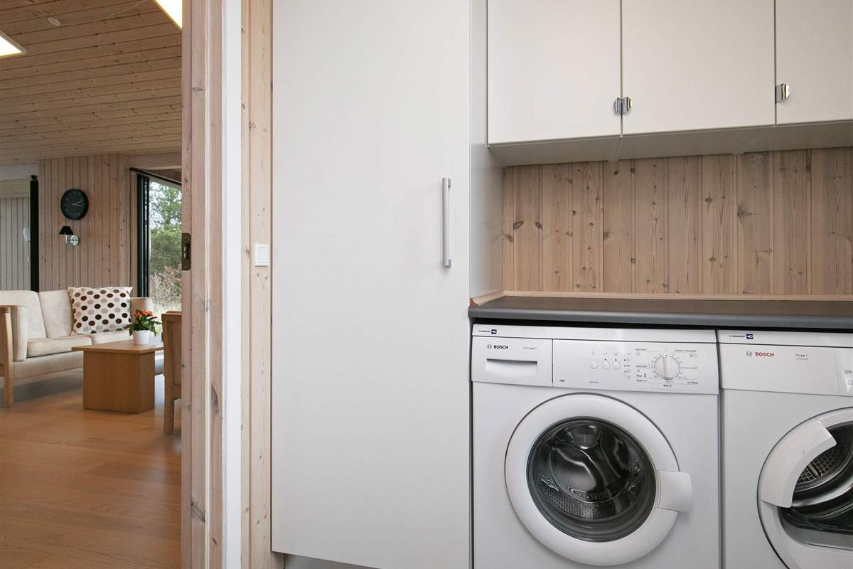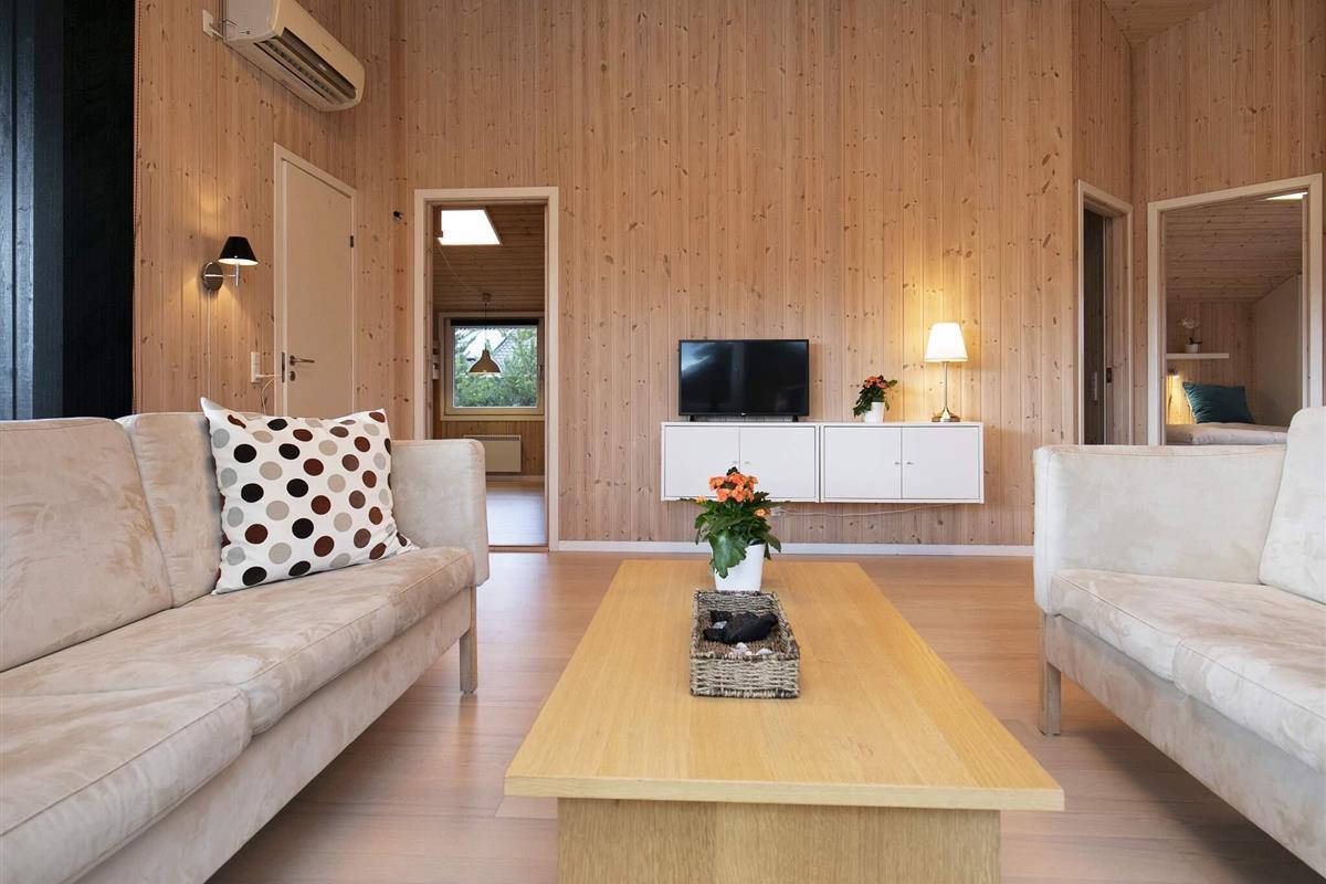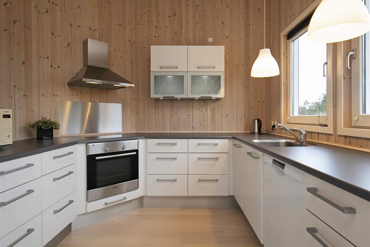 Das Ferienhaus hat einen gut ausgestatteten Küchen-/Wohnbereich mit großen Fenstern und offener Zimmerdecke bis zum First und somit hellem, luftigem Ambiente. Hier gibt es viel Platz für das Familienleben und gemeinsame Aktivitäten. Eine energieeffiziente Wärmepumpe sorgt zu jeder Jahreszeit für ein angenehmes Innenklima. Außerdem gibt es zwei große, helle Schlafzimmer, mit guten Schlafplätzen und Stauraum, sowie einen offenen Hems oben unter der Dachschräge, mit Matratze und solider Leitertreppe als Zugang. Waschmaschine und Trockner findet man unten im offenen Eingangsbereich. Außerdem großes Badezimmer im Haus, mit Dusche und Fußbodenheizung sowie Whirlpool und Sauna.